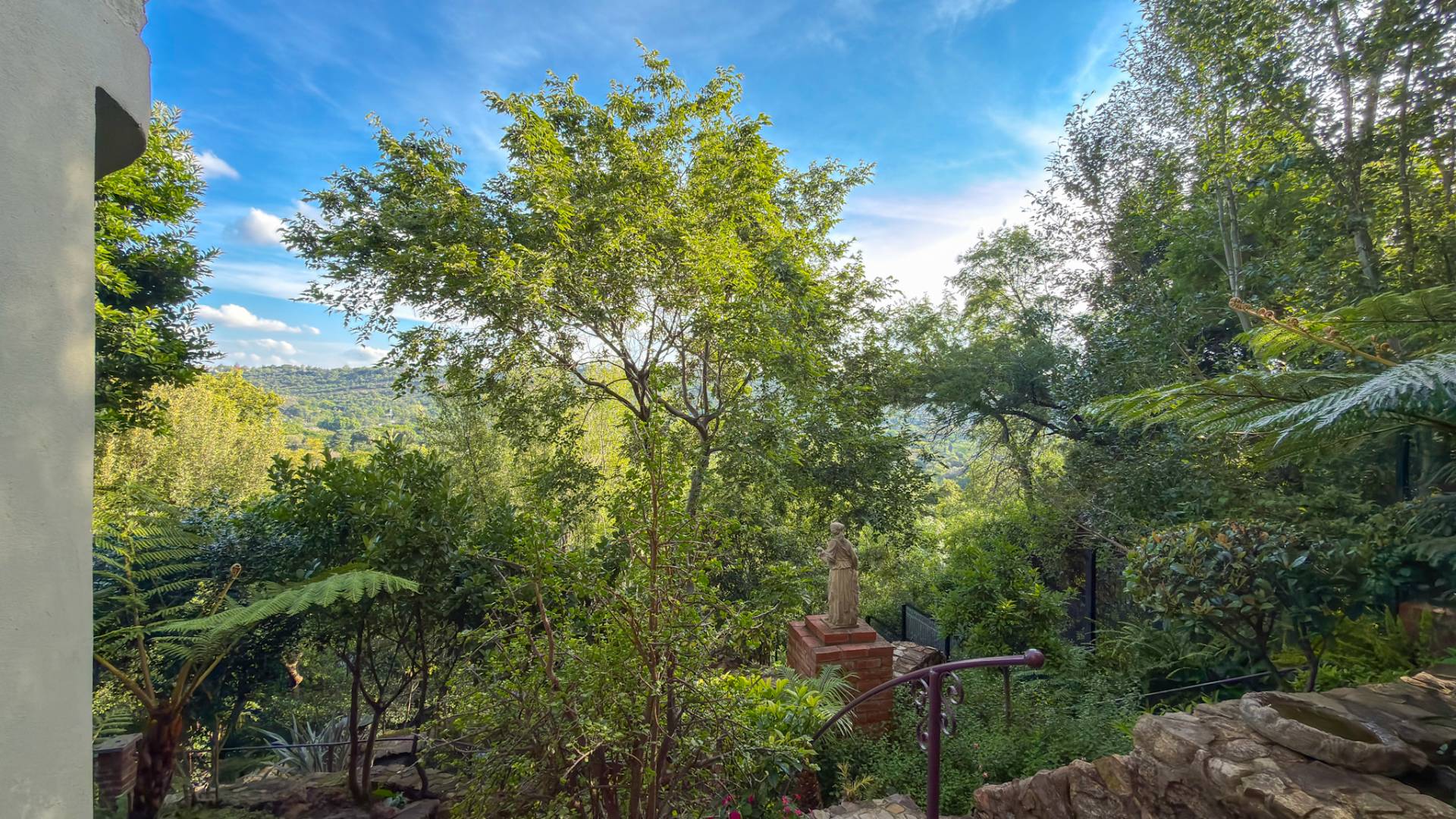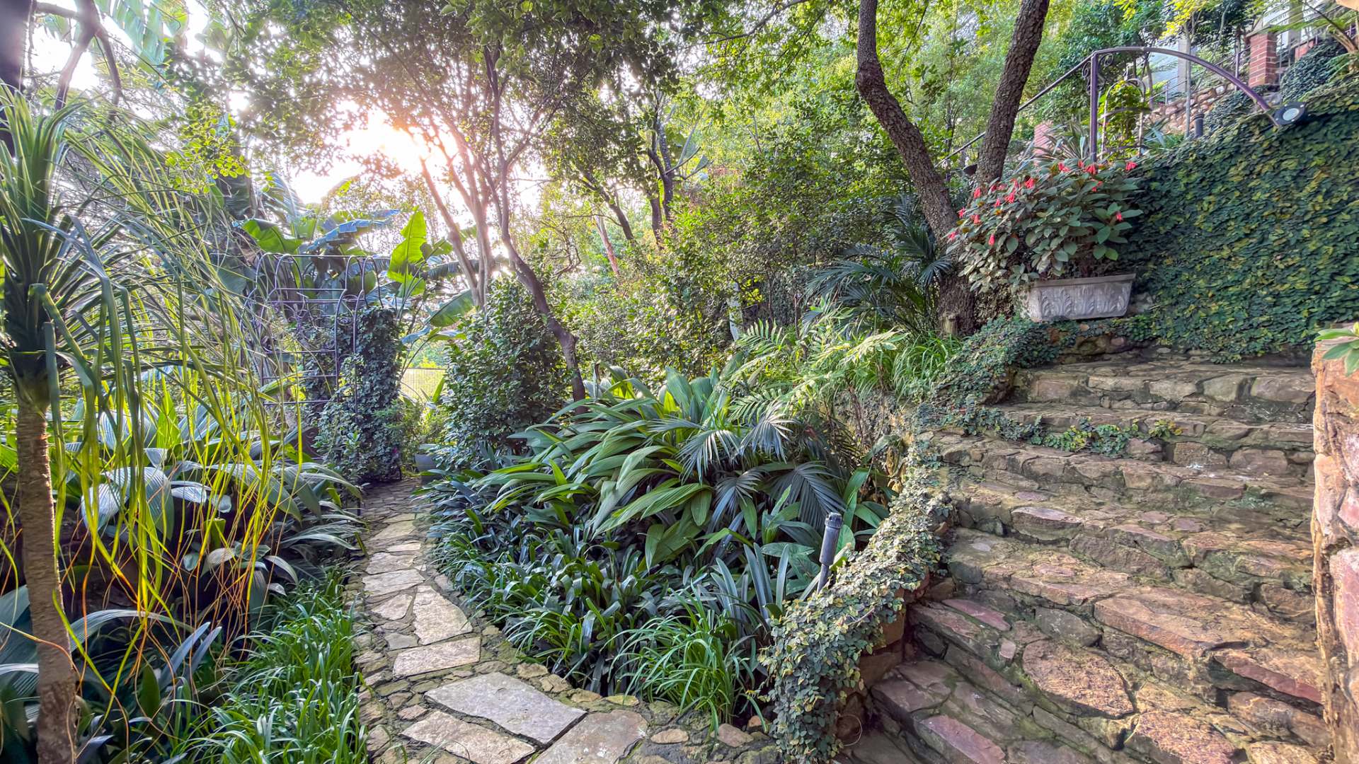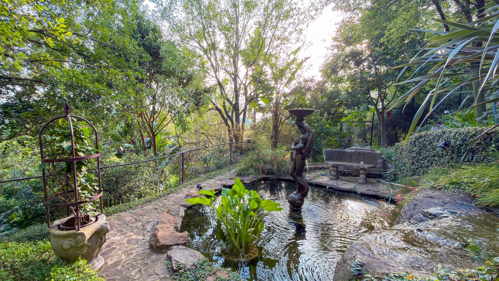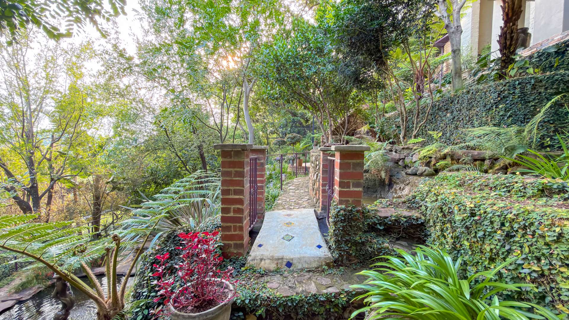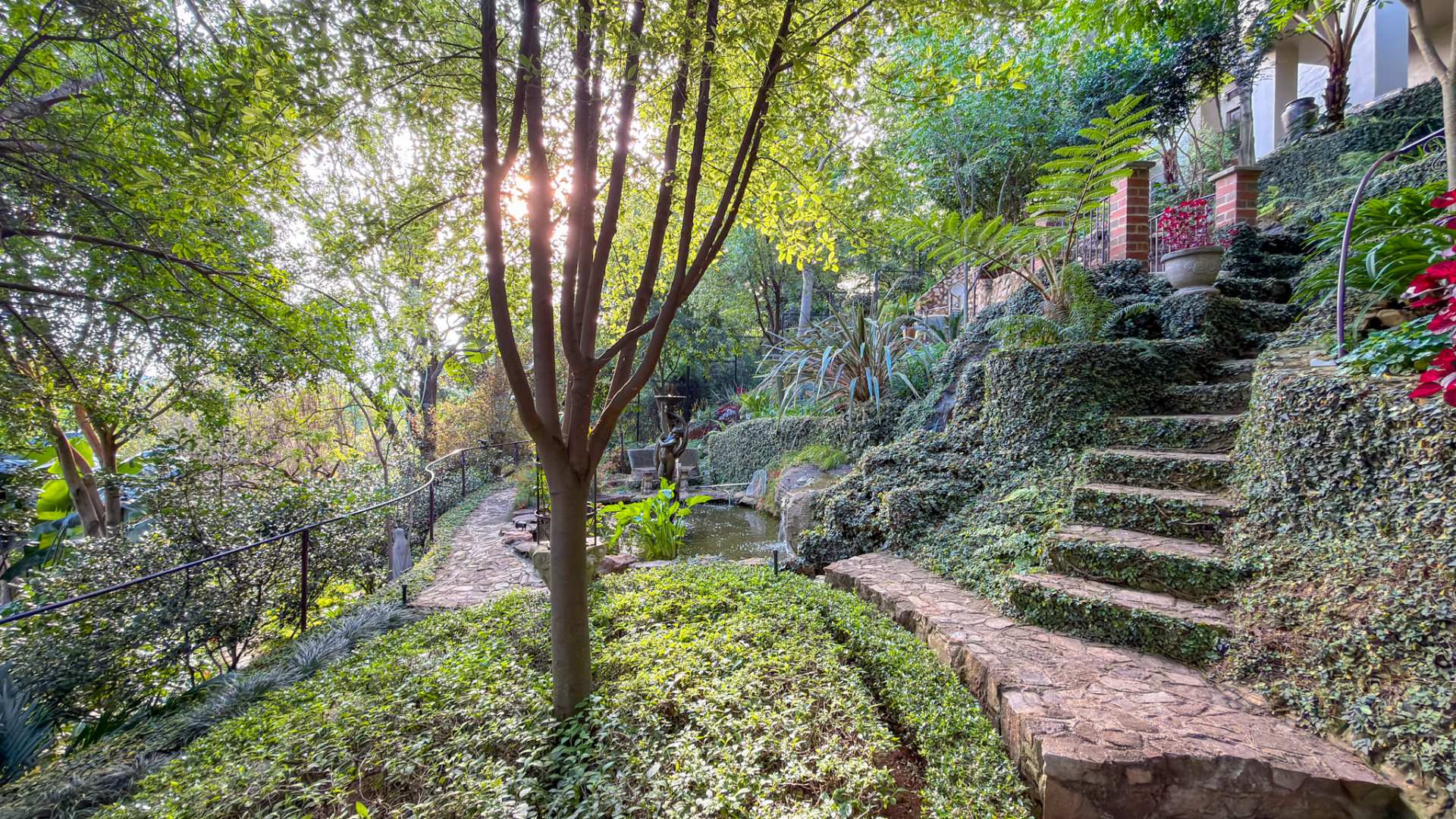 The beautifully landscaped, terraced garden features meandering walkways, intimate seating pockets, and lush planting. A cascading rock water feature flows into a tranquil koi pond, creating a serene natural retreat. All garden areas are fully irrigated and secured with Clear-Vu fencing.