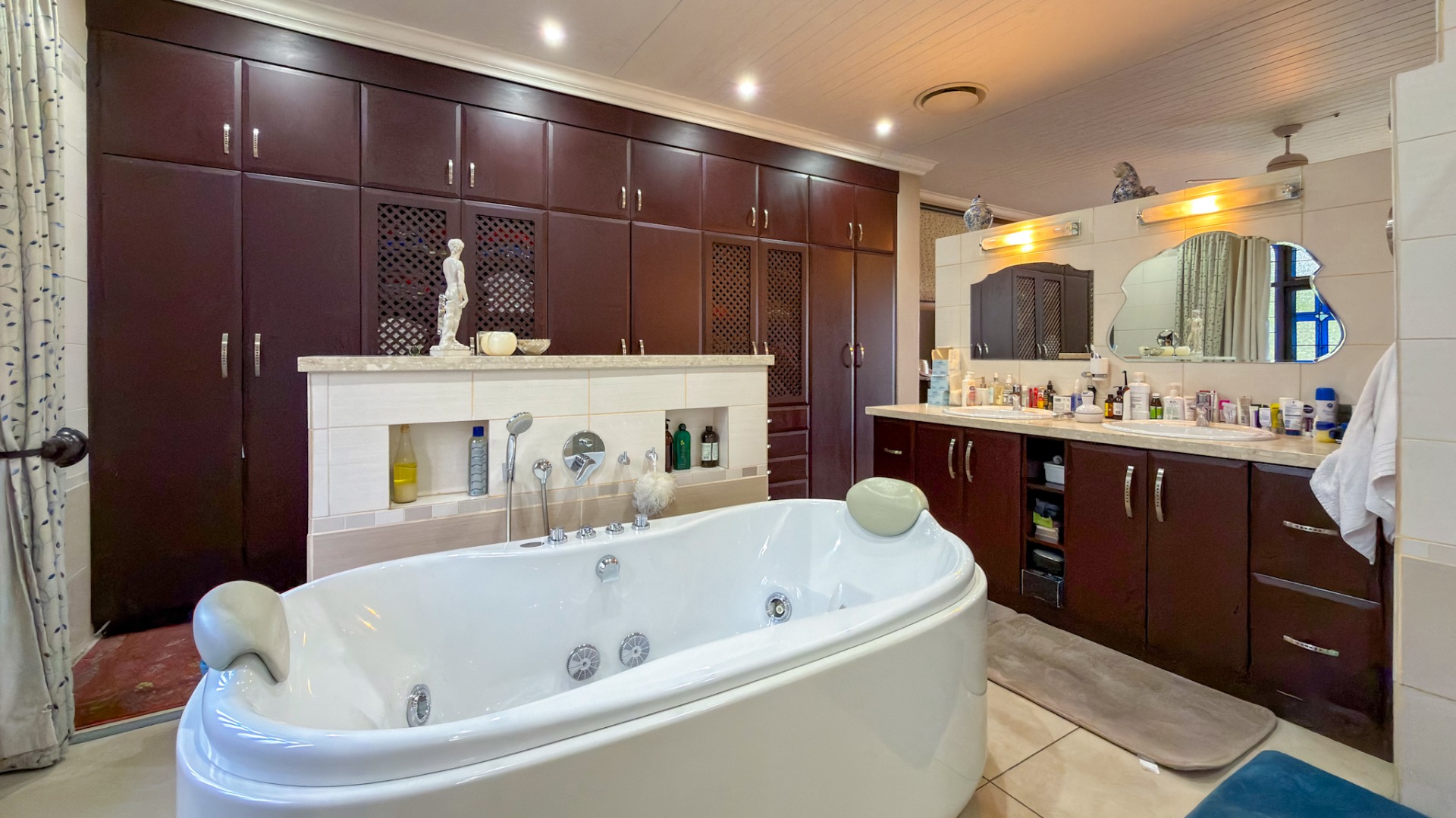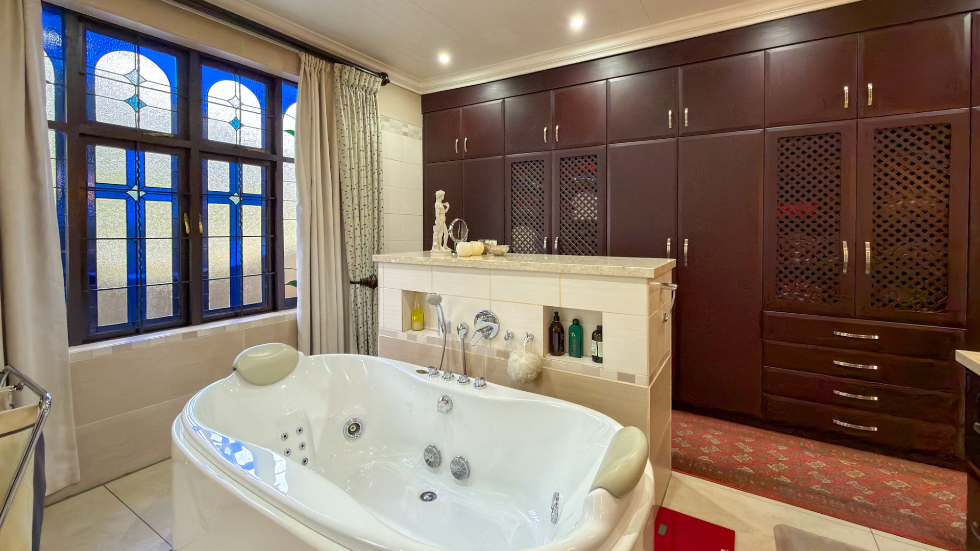 The opulent master suite boasts a dressing area, a spa-style bathroom with a generous shower, double vanity, stained-glass accents, and a jacuzzi spa bath.