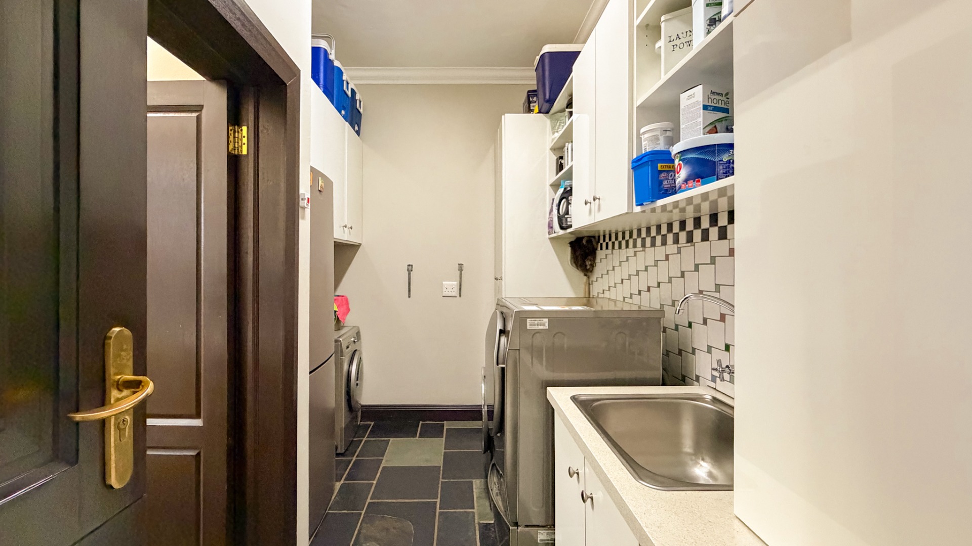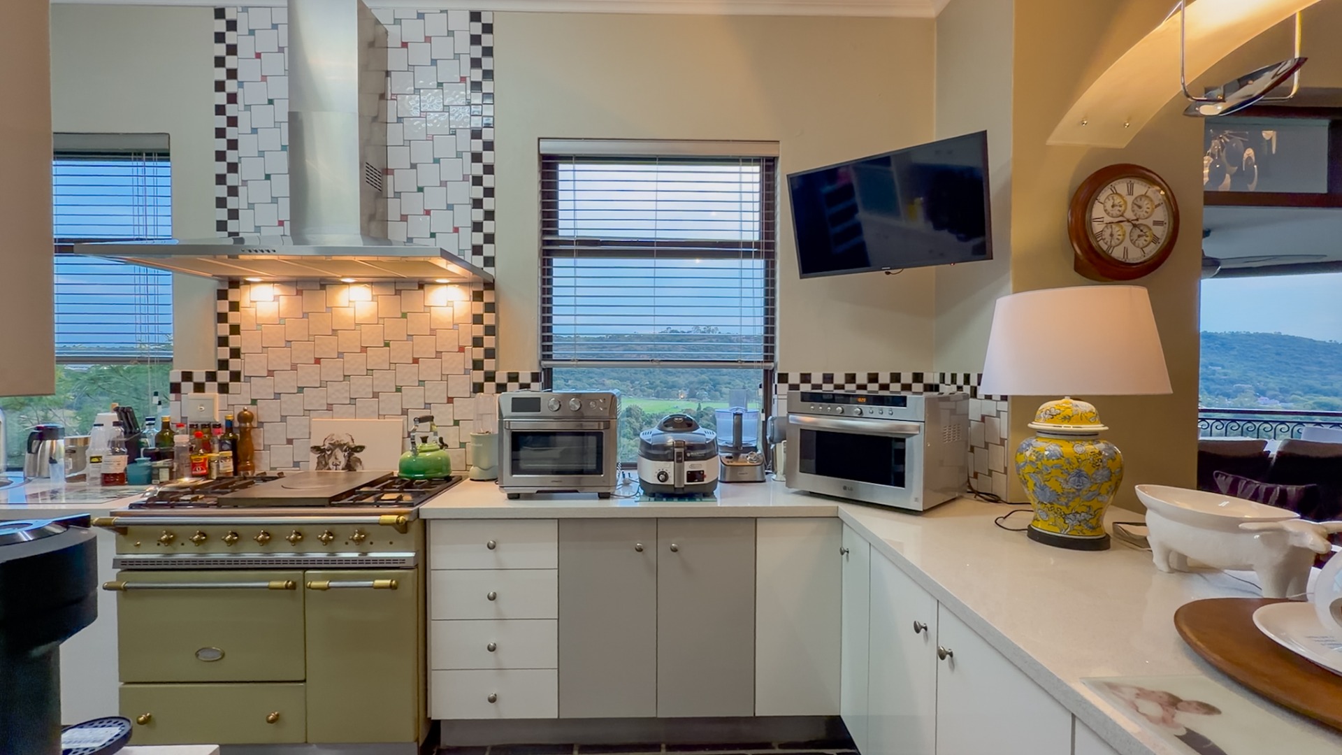 The designer kitchen is fitted with a freestanding gas stove, walk-in pantry, and a large scullery with ample appliance space. A