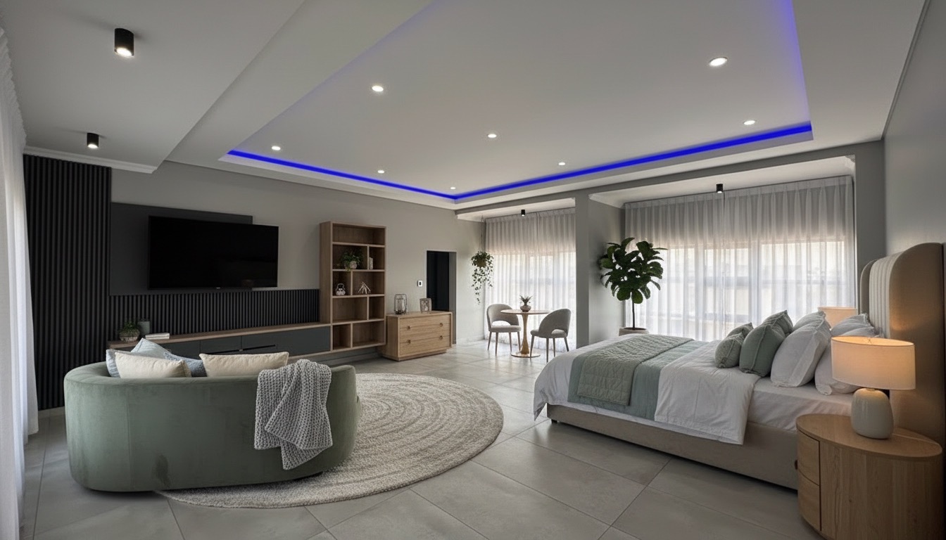 And the main bedroom? Exceptionally large. Large enough for a private lounge within the suite. The bold walk-in cupboard continues the statement design. (Rooms have been styled with AI furnishings to help you visualise the scale and potential.)