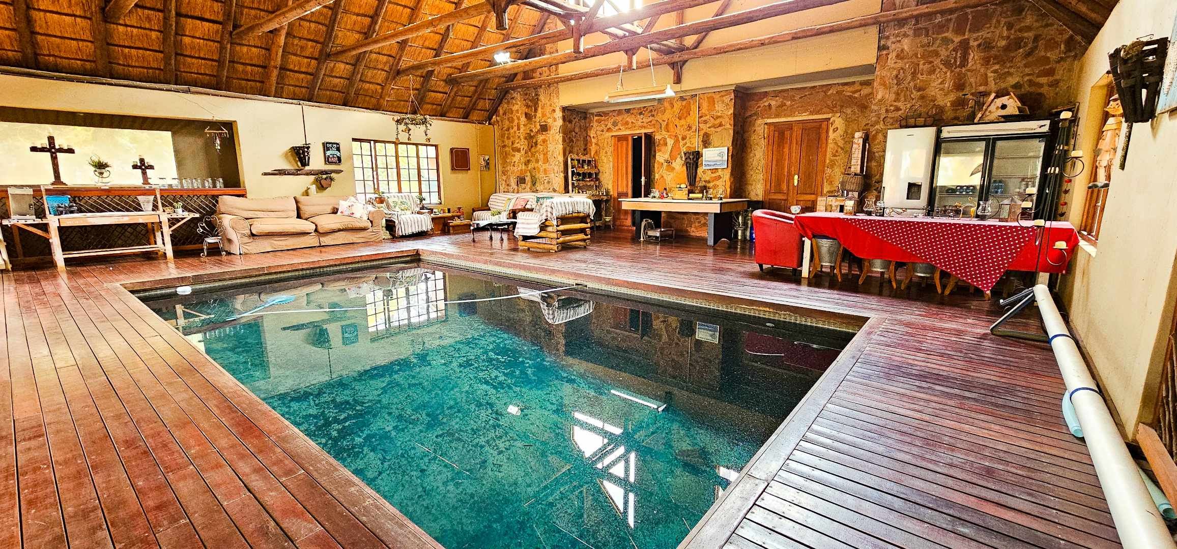 An spacious covered patio with an indoor heated swimming pool for all year-round enjoyment