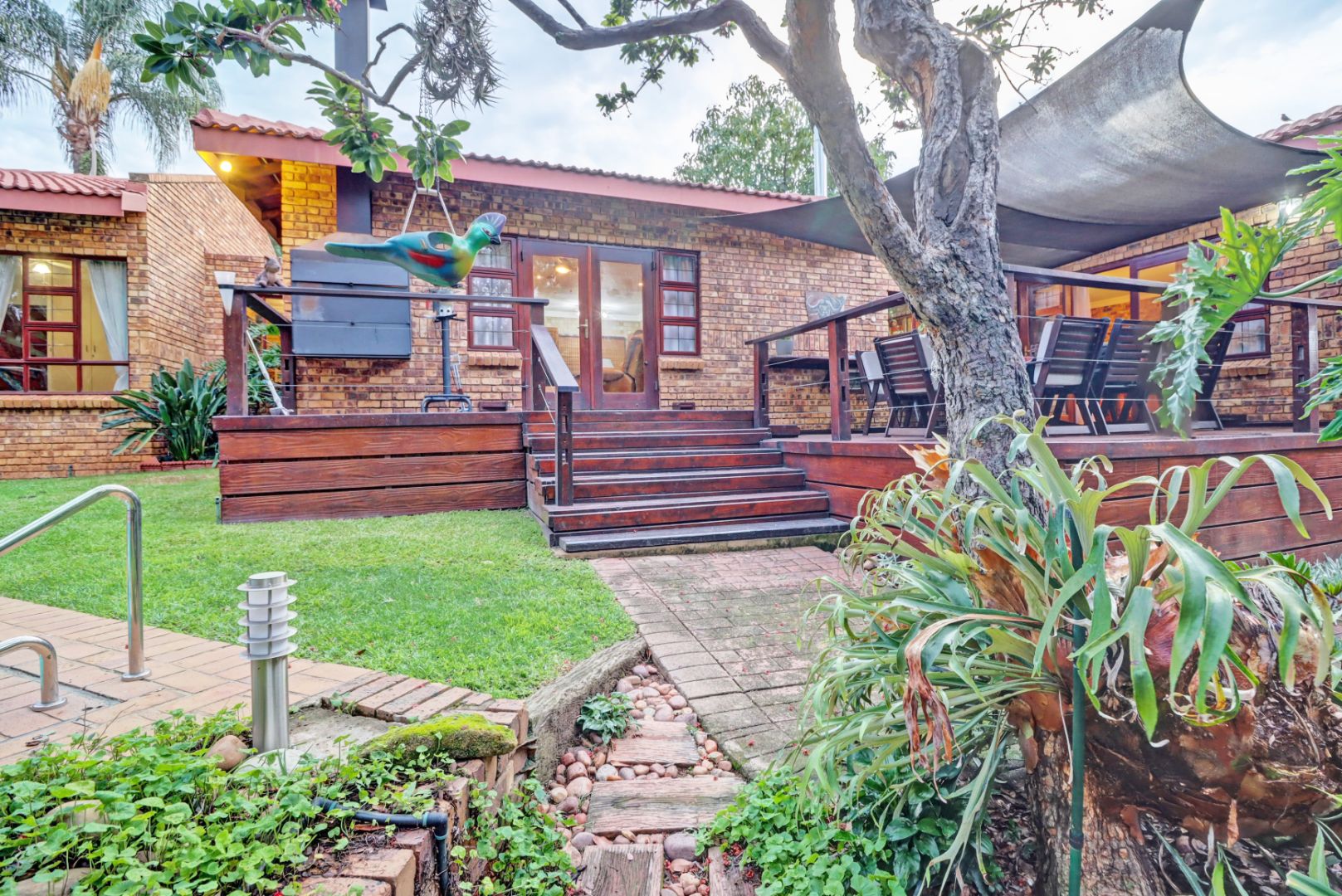 Outdoor living is a highlight, with a charming garden, a welcoming patio, and a deck perfect for alfresco dining and relaxation. The built-in braai and dedicated braai room are ideal for entertaining guests year-round. The entertaianment area can also be utilised as a office/studio/granny flatlet.The property also benefits from an irrigation system and paving, ensuring easy maintenance of the beautiful outdoor spaces. Parking is well-catered for with a double garage.