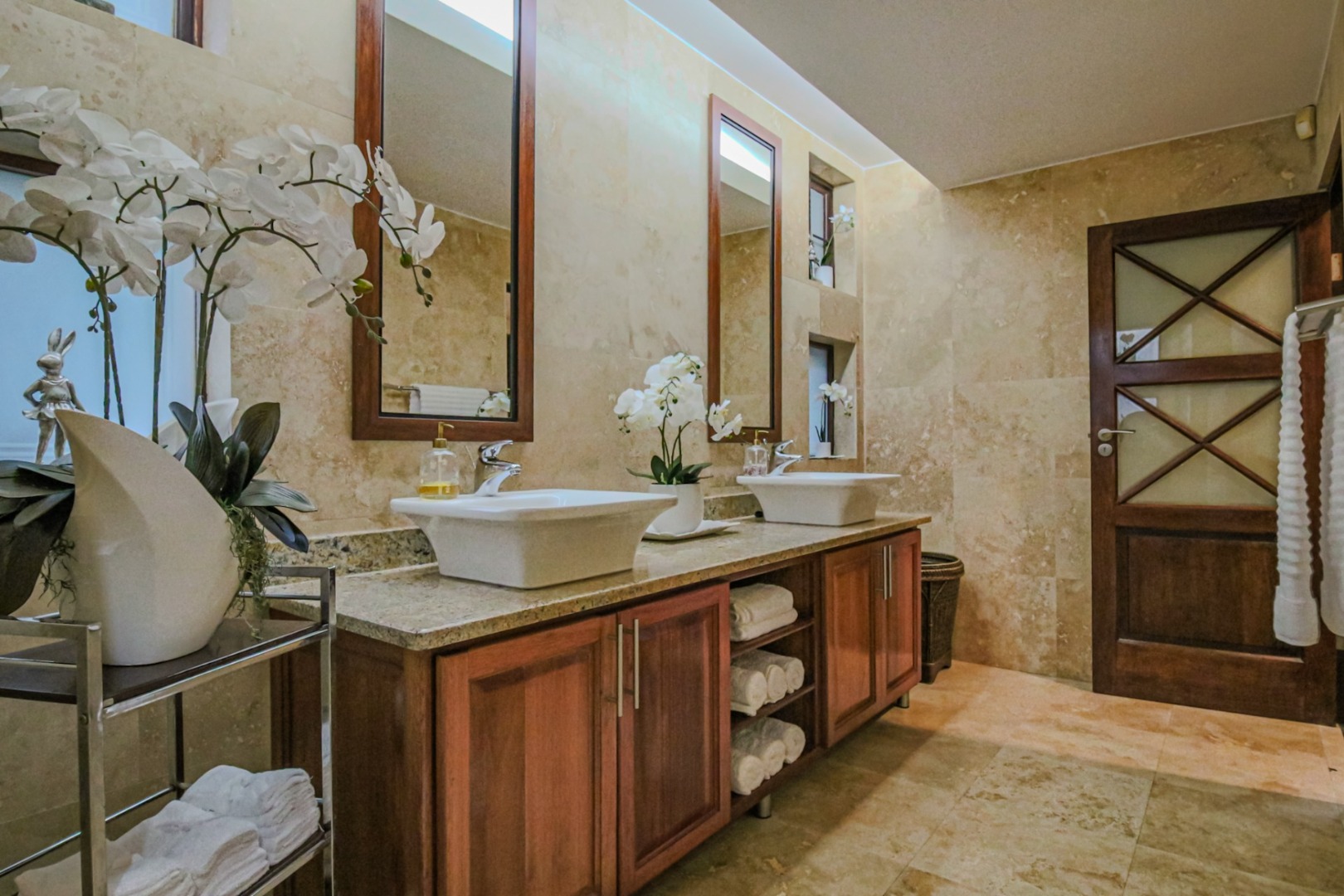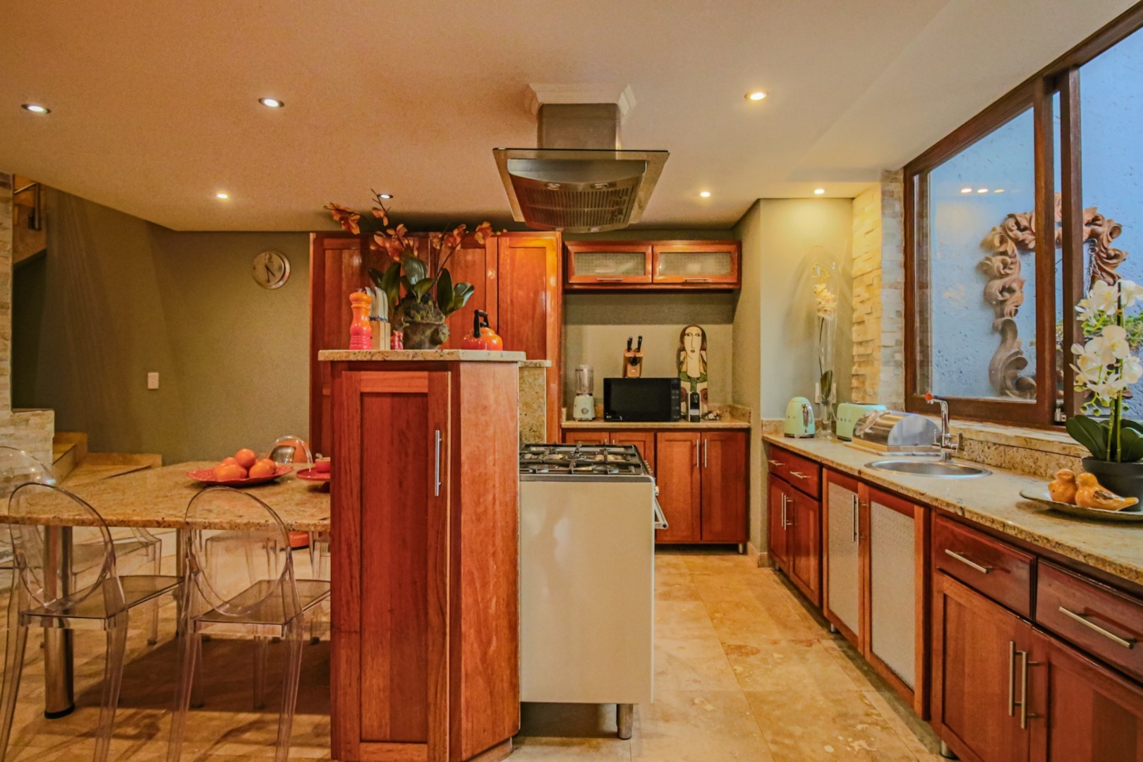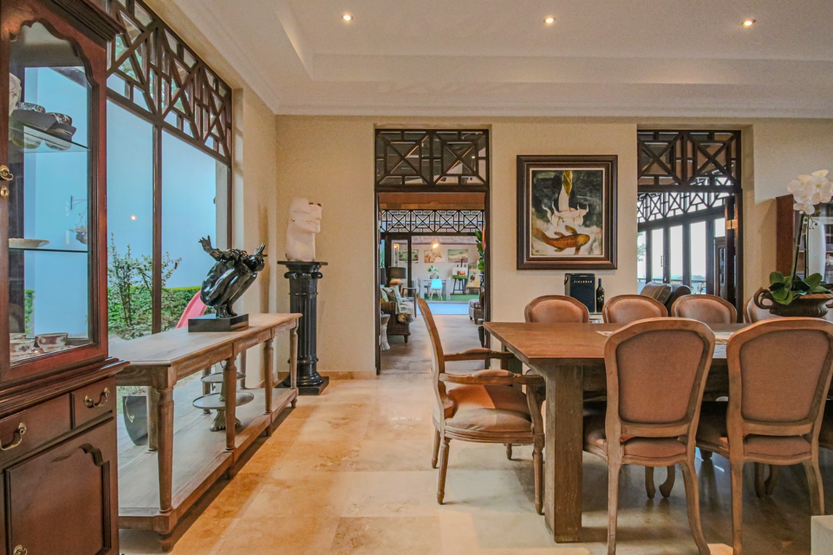 On the upper level, there are four en suite bedrooms, including the luxurious master suite, which opens onto a private garden with a gazebo.