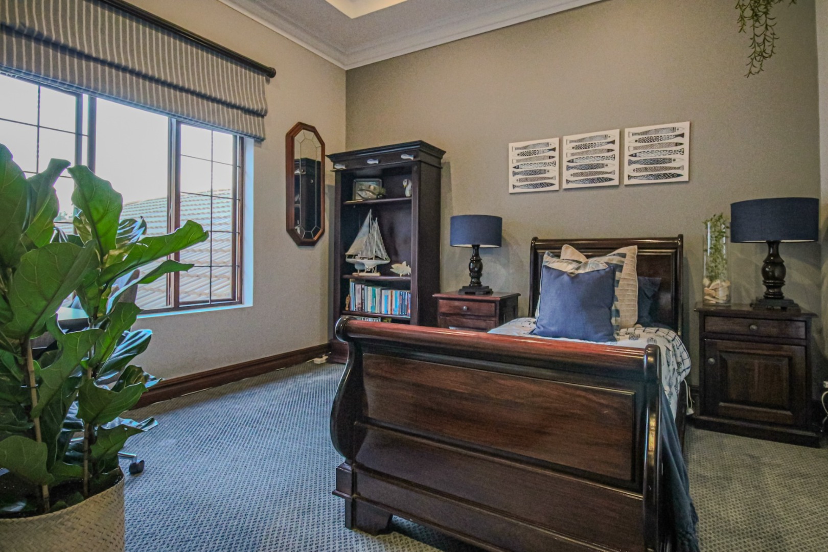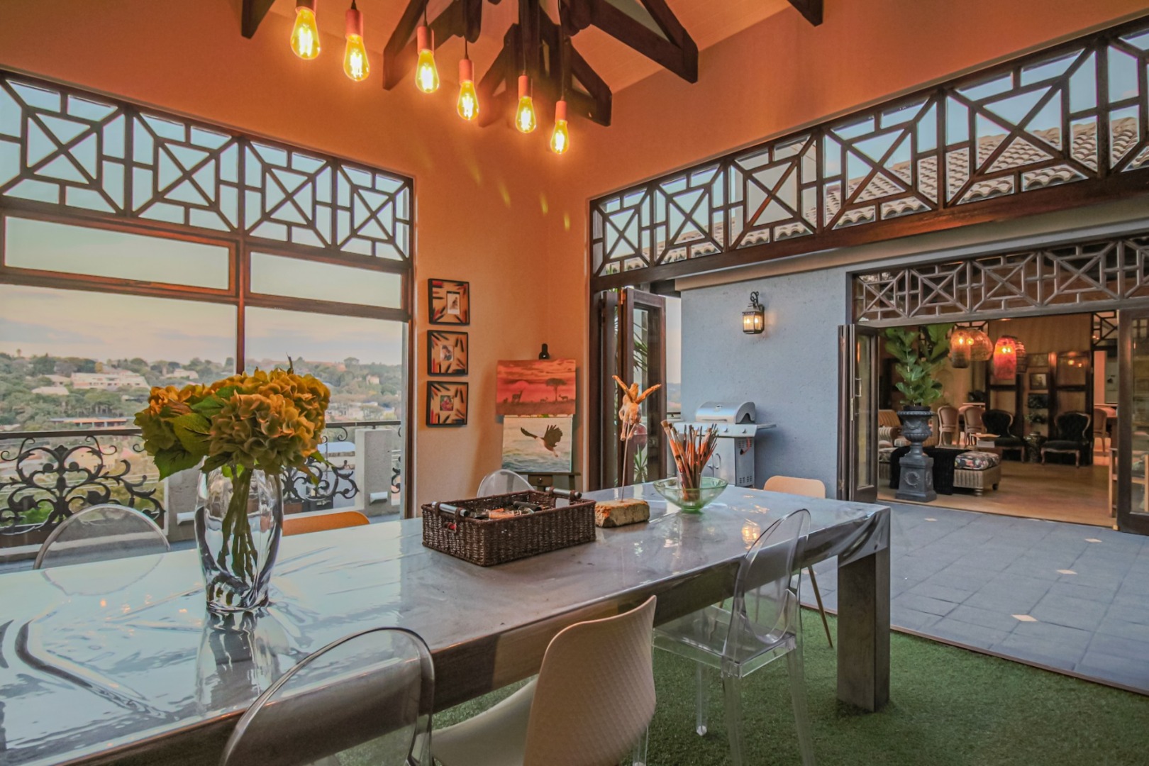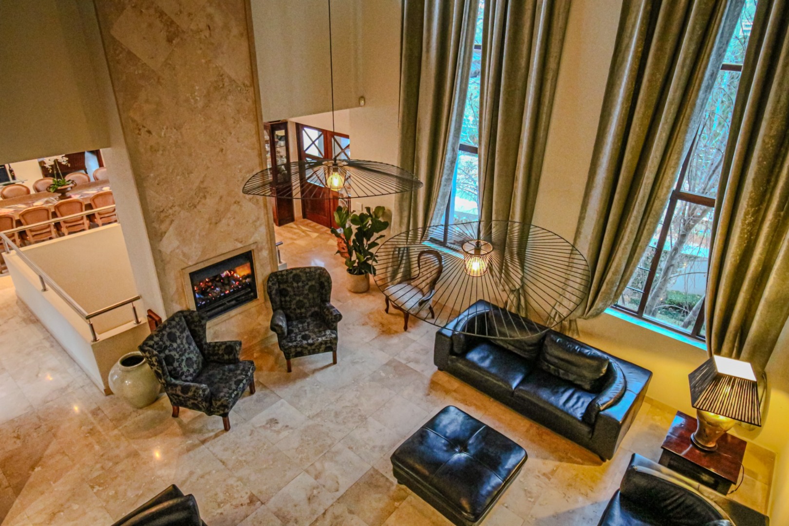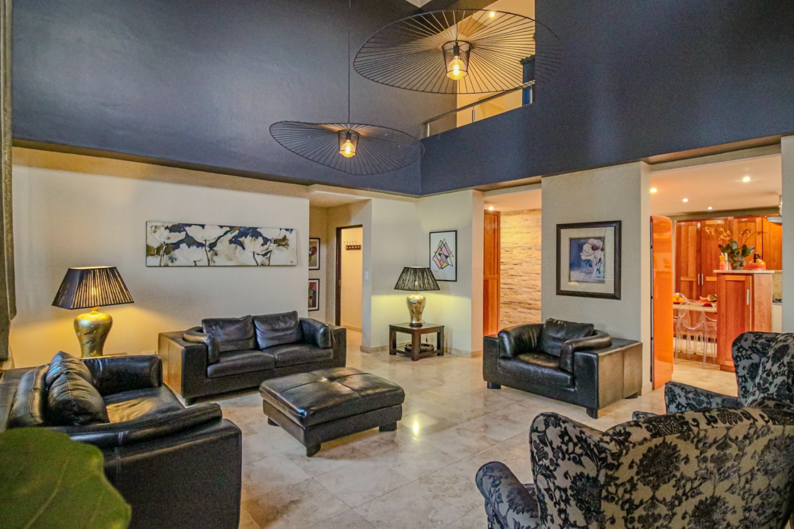 The second level is ideal for luxurious living and entertaining. The double-volume formal lounge with built-in gas fireplace creates an inviting atmosphere all year round. The open plan dining area, with space for 14 guests, seamlessly integrates with both the formal lounge and braai room. The informal braai lounge, with stacking doors and exposed rafter ceilings, showcases the epitome of indoor/outdoor living with its direct access