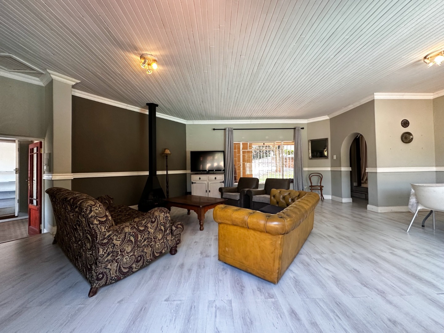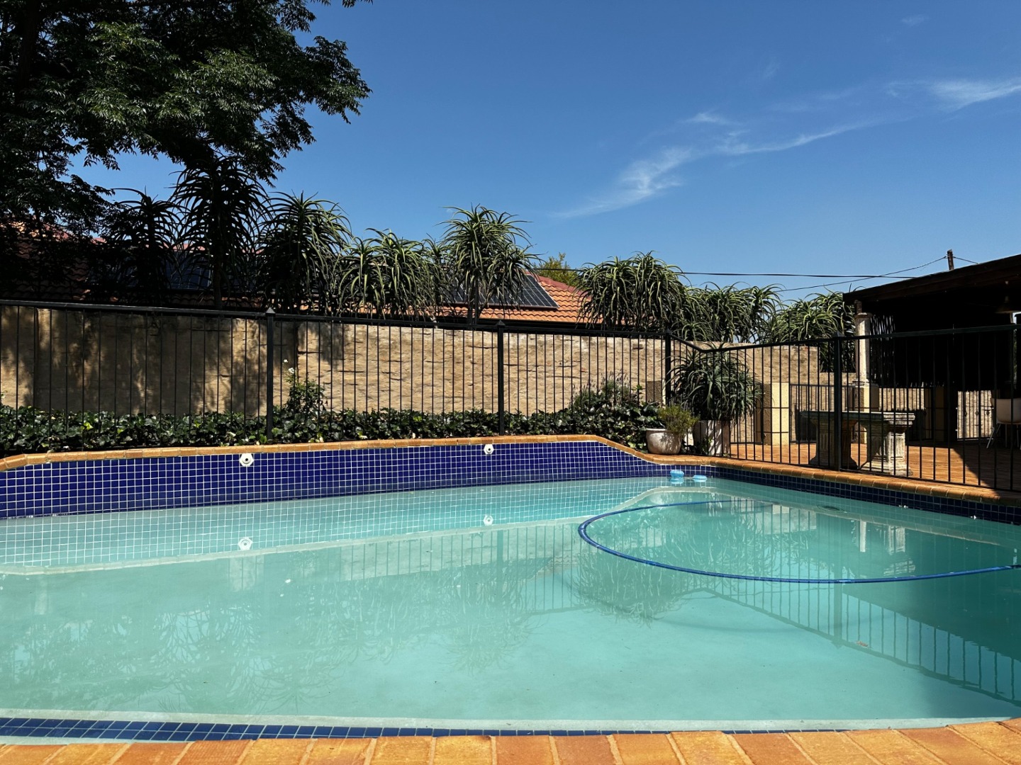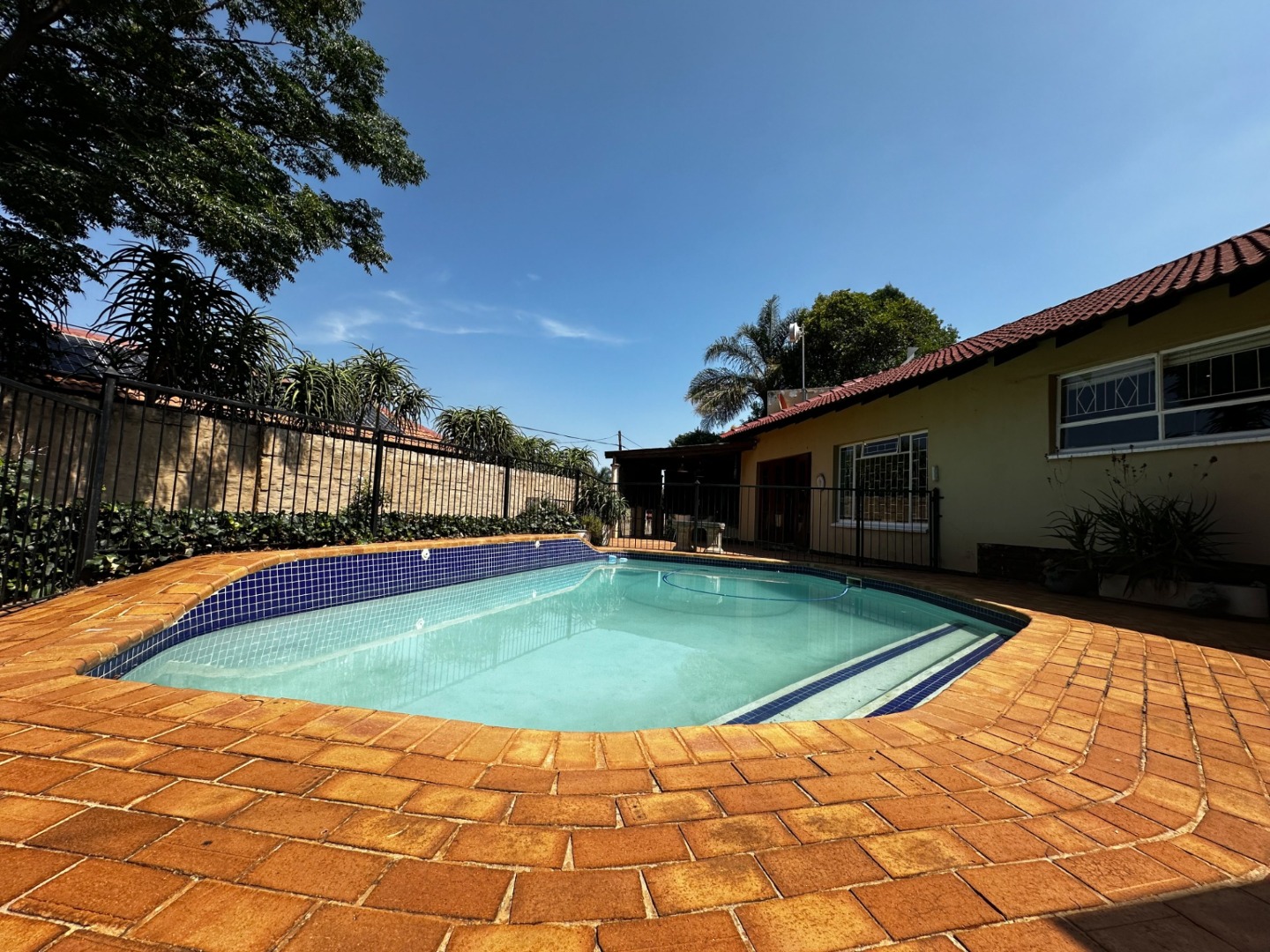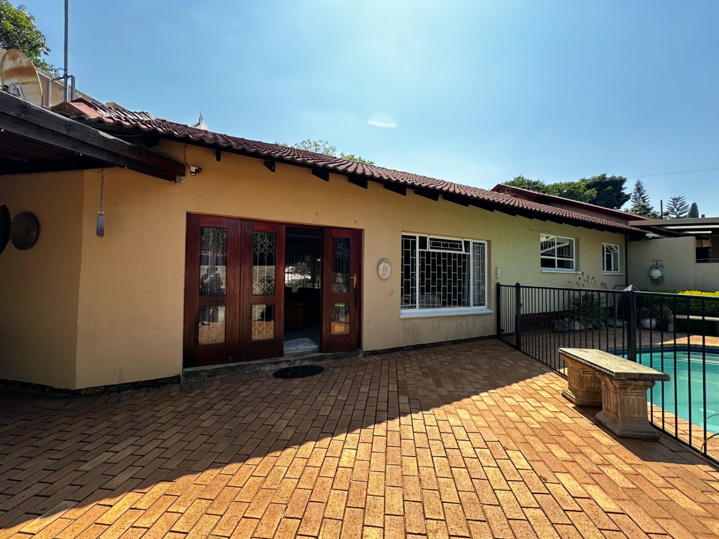 The large family room with fireplace opens onto an inviting patio with swimming pool – the ideal spot for a Sunday braai.