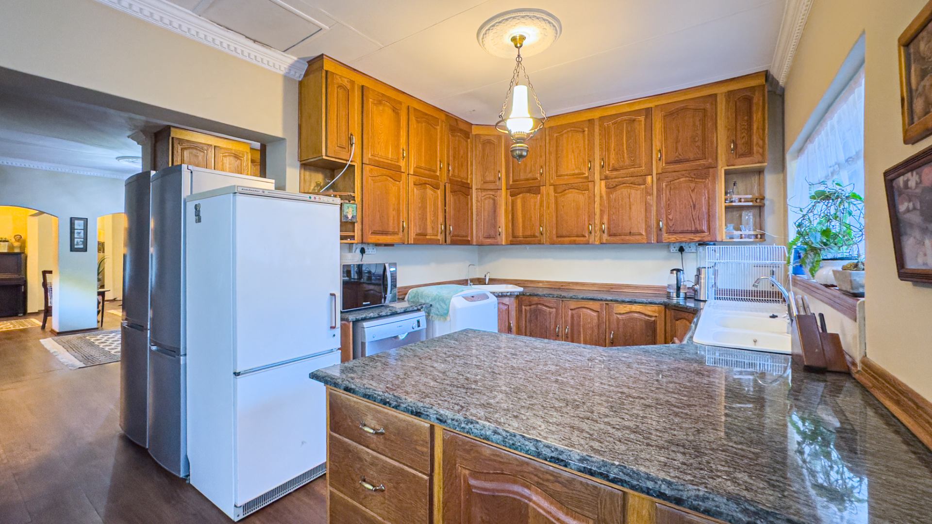 This gracious home offers a selection of versatile living spaces, including a study, formal dining room, TV lounge, and a second informal sitting area. The well-appointed kitchen is thoughtfully divided into two sections, featuring luxurious black granite countertops and solid oak cabinetry. The adjoining breakfast nook is a charming space for casual meals and morning coffee.