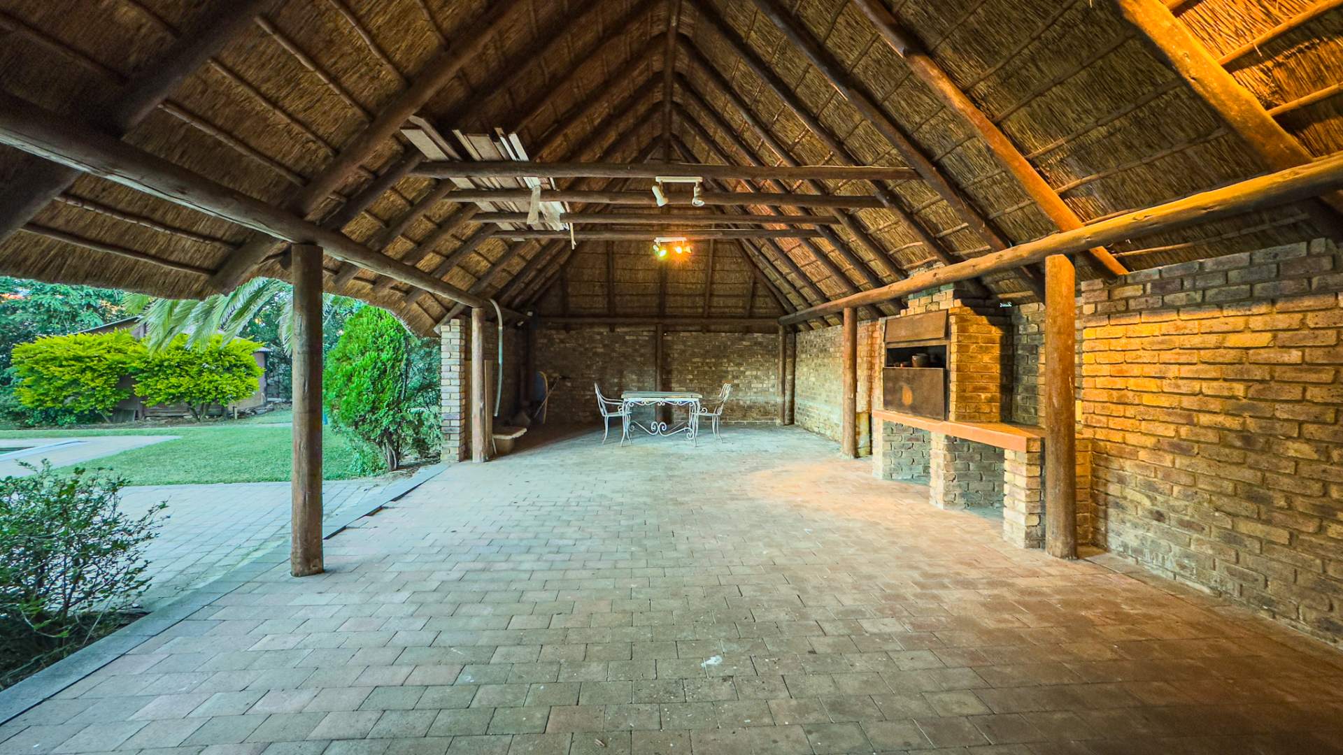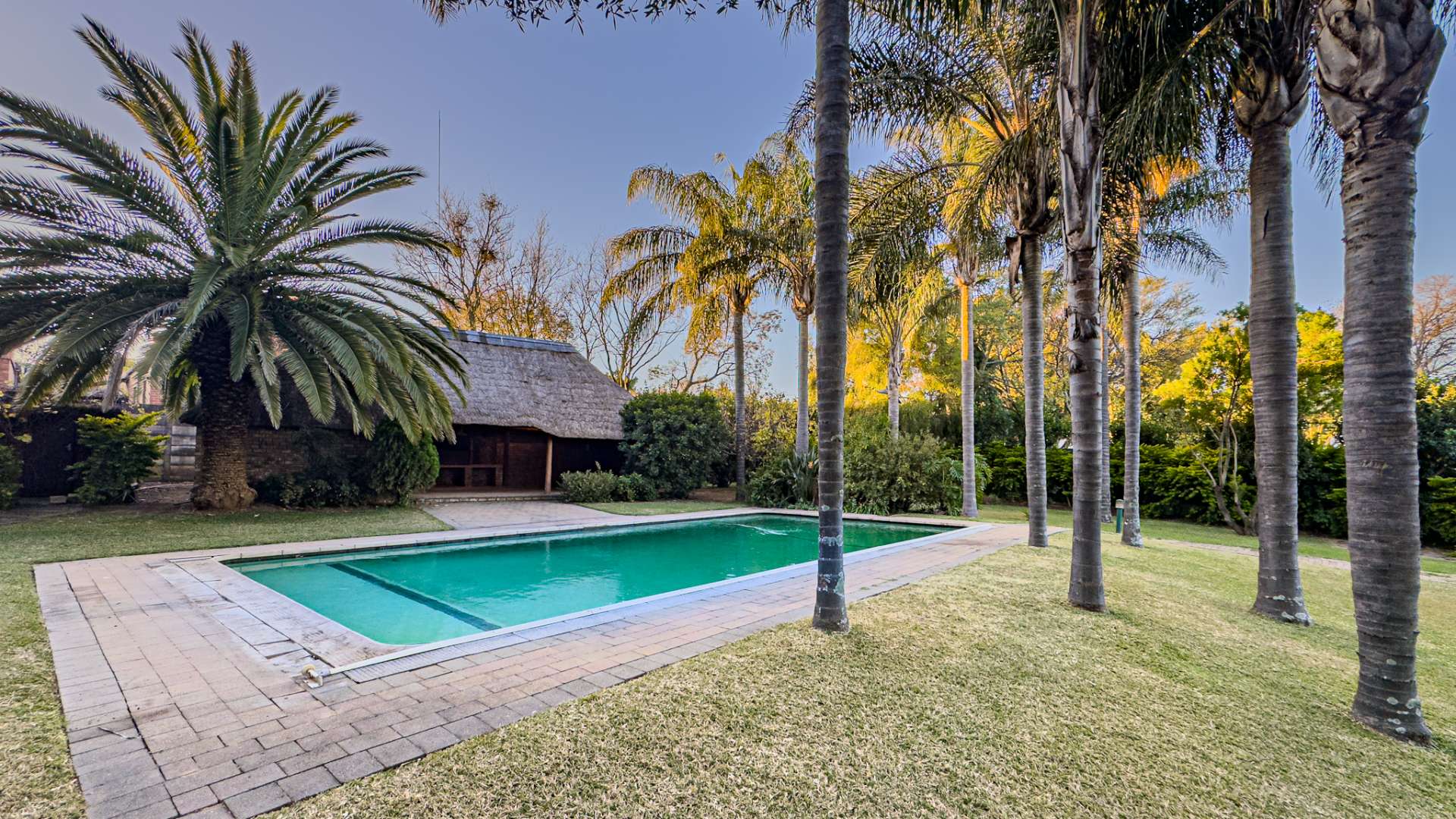 The expansive rear garden is a haven for children and perfect for entertaining. A large, sparkling swimming pool is accompanied by a substantial lapa with built-in braai — an entertainer’s dream for year-round gatherings. Further amenities include staff ablution facilities, two garages, three carports, and a garden shed discreetly positioned at the rear of the property.
