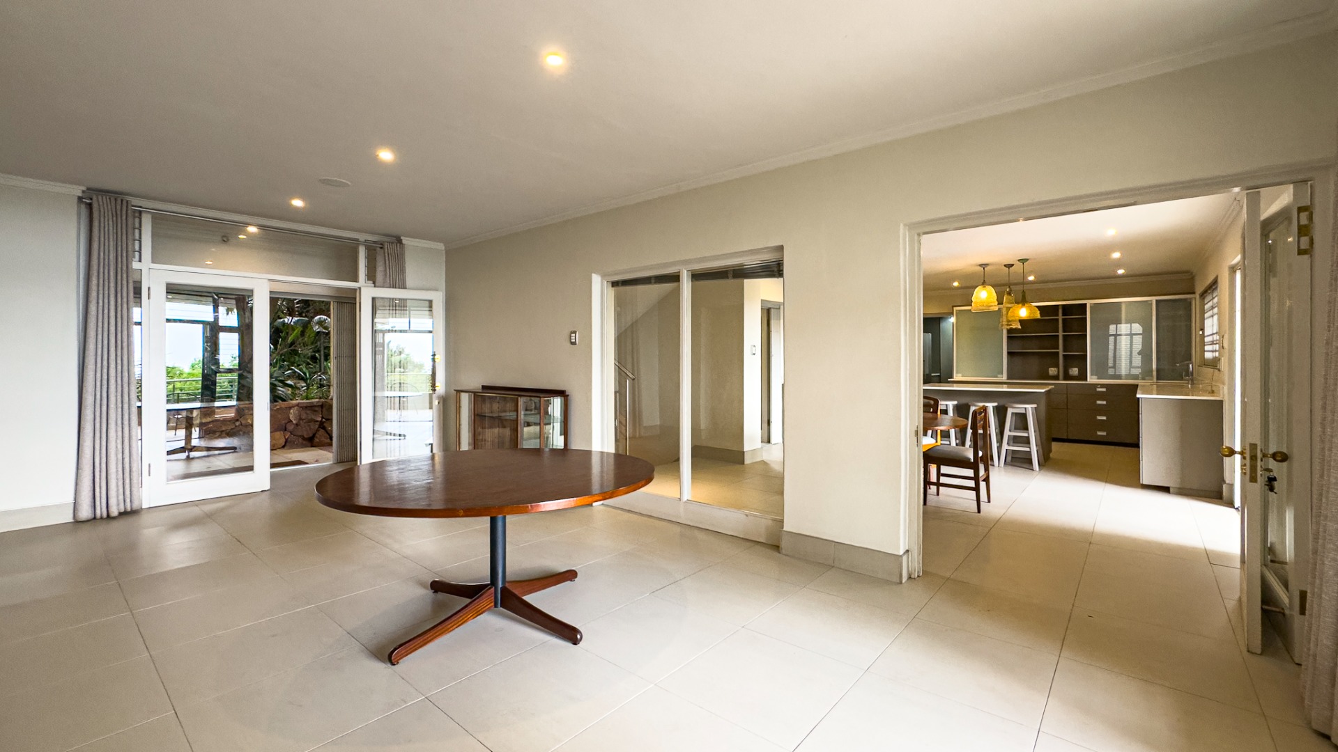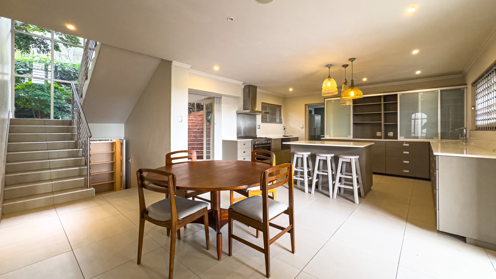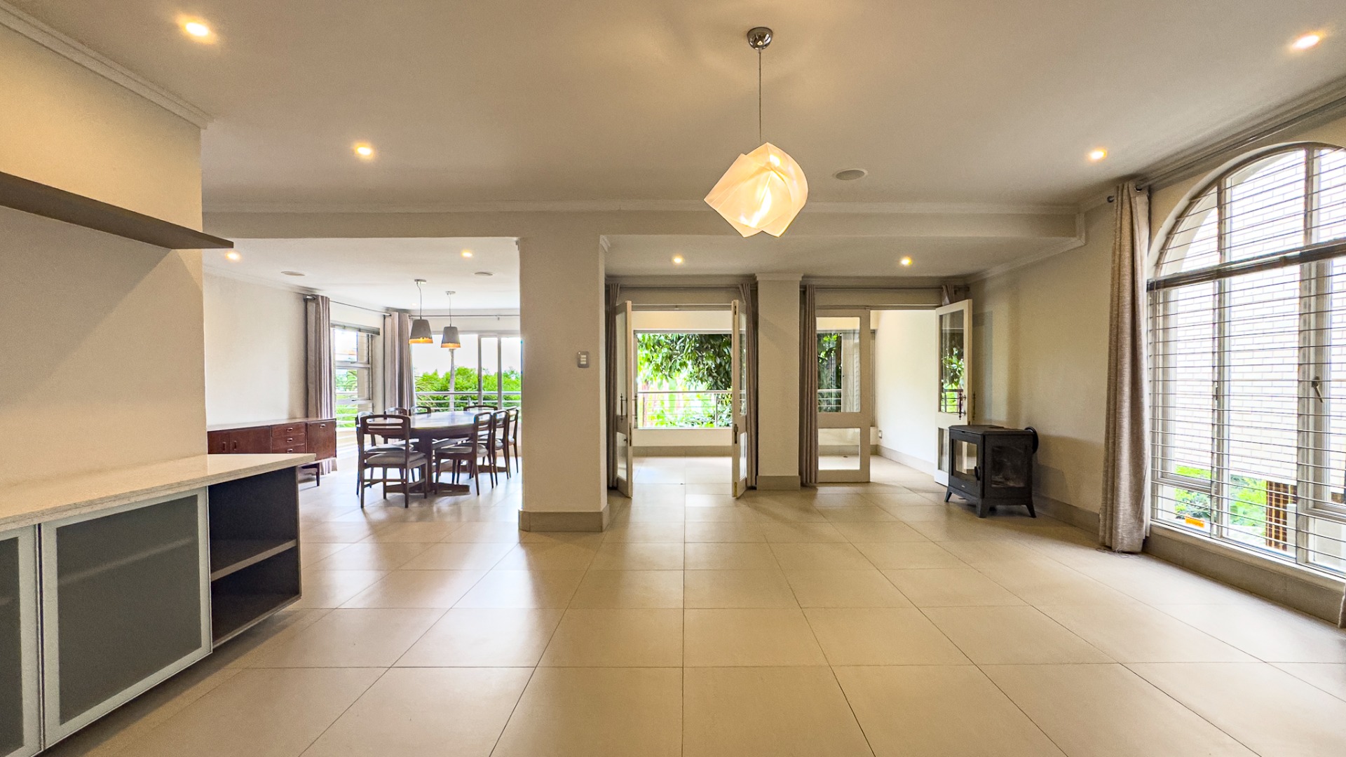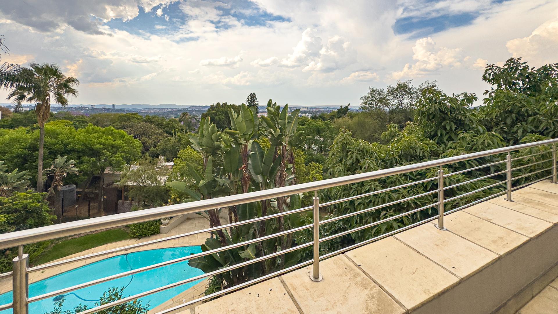 Upon entering, you are welcomed by a grand double-volume entrance hall, leading into a series of spacious open-plan living areas — including a formal lounge, TV lounge, dining room, and an additional dining space adjacent to the kitchen. These beautifully interconnected spaces flow seamlessly onto an expansive entertainment terrace with a built-in braai, all overlooking the city centre of Pretoria.