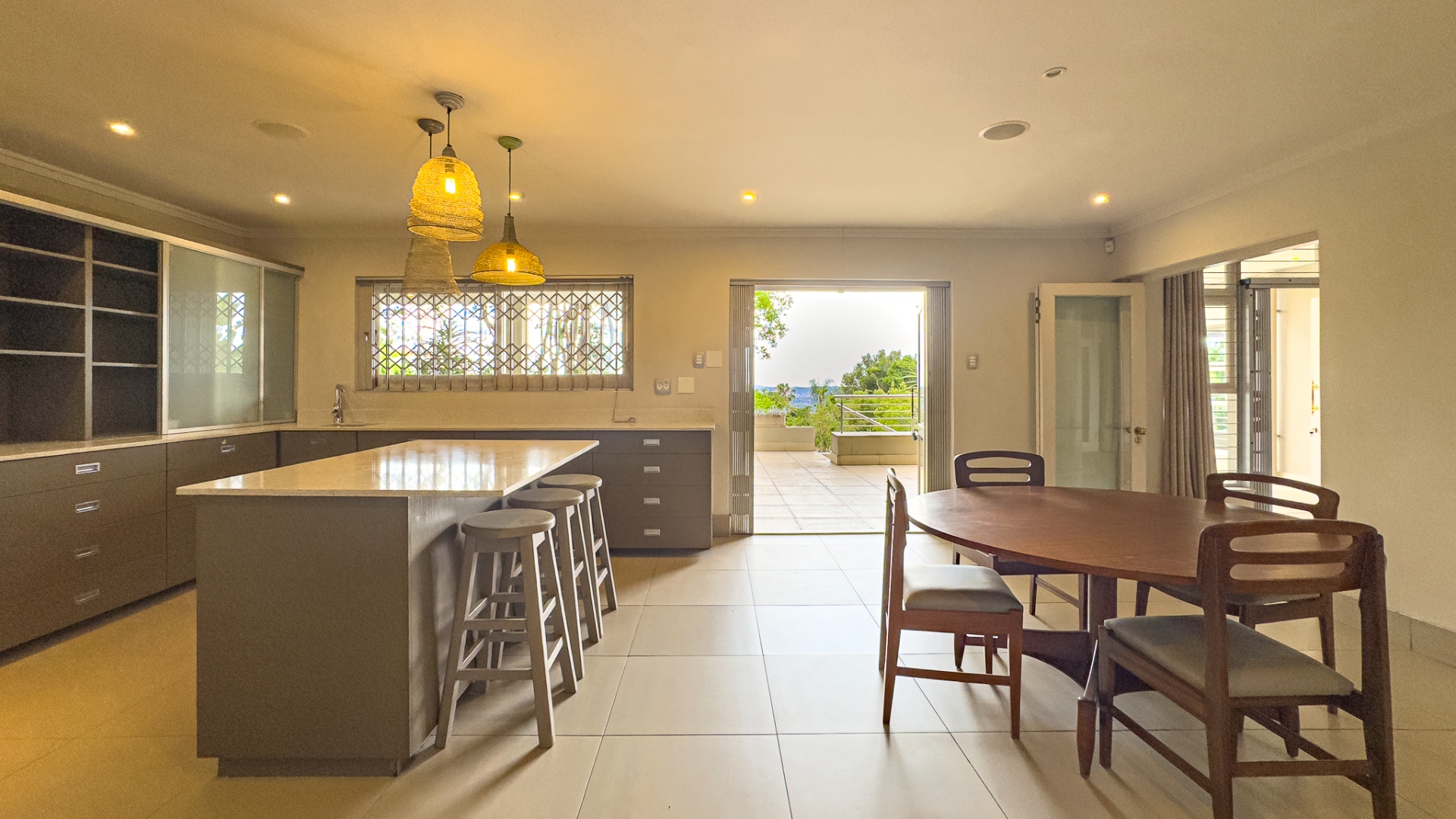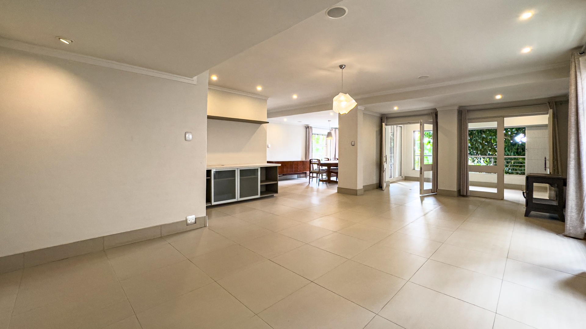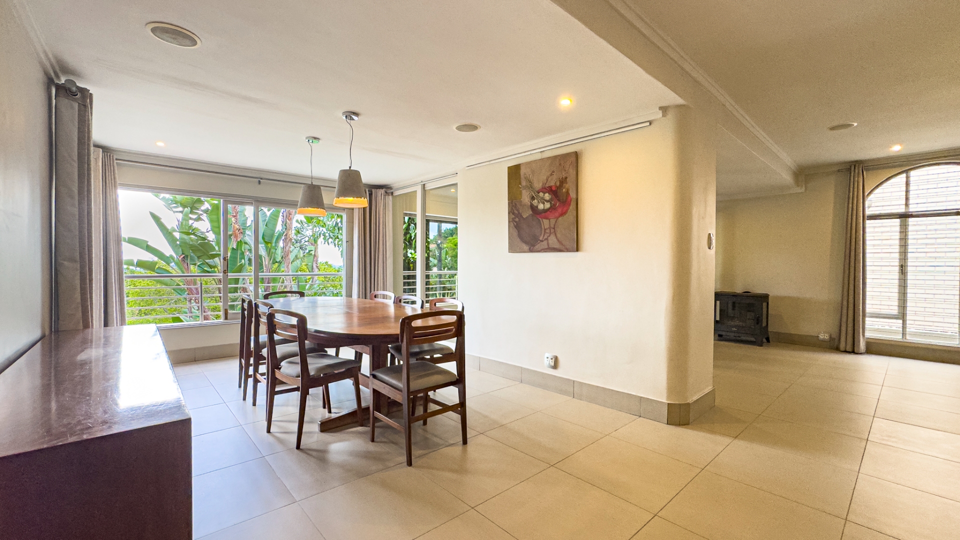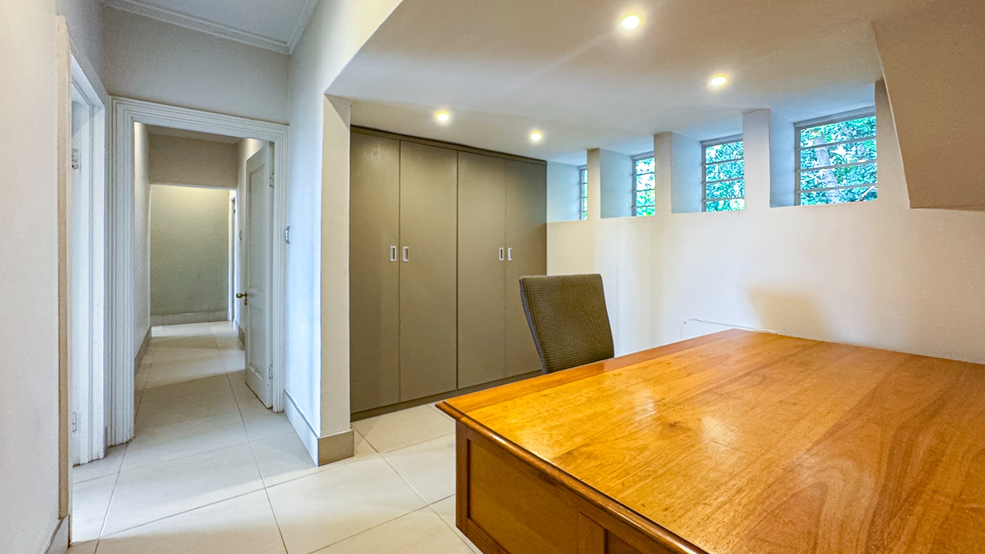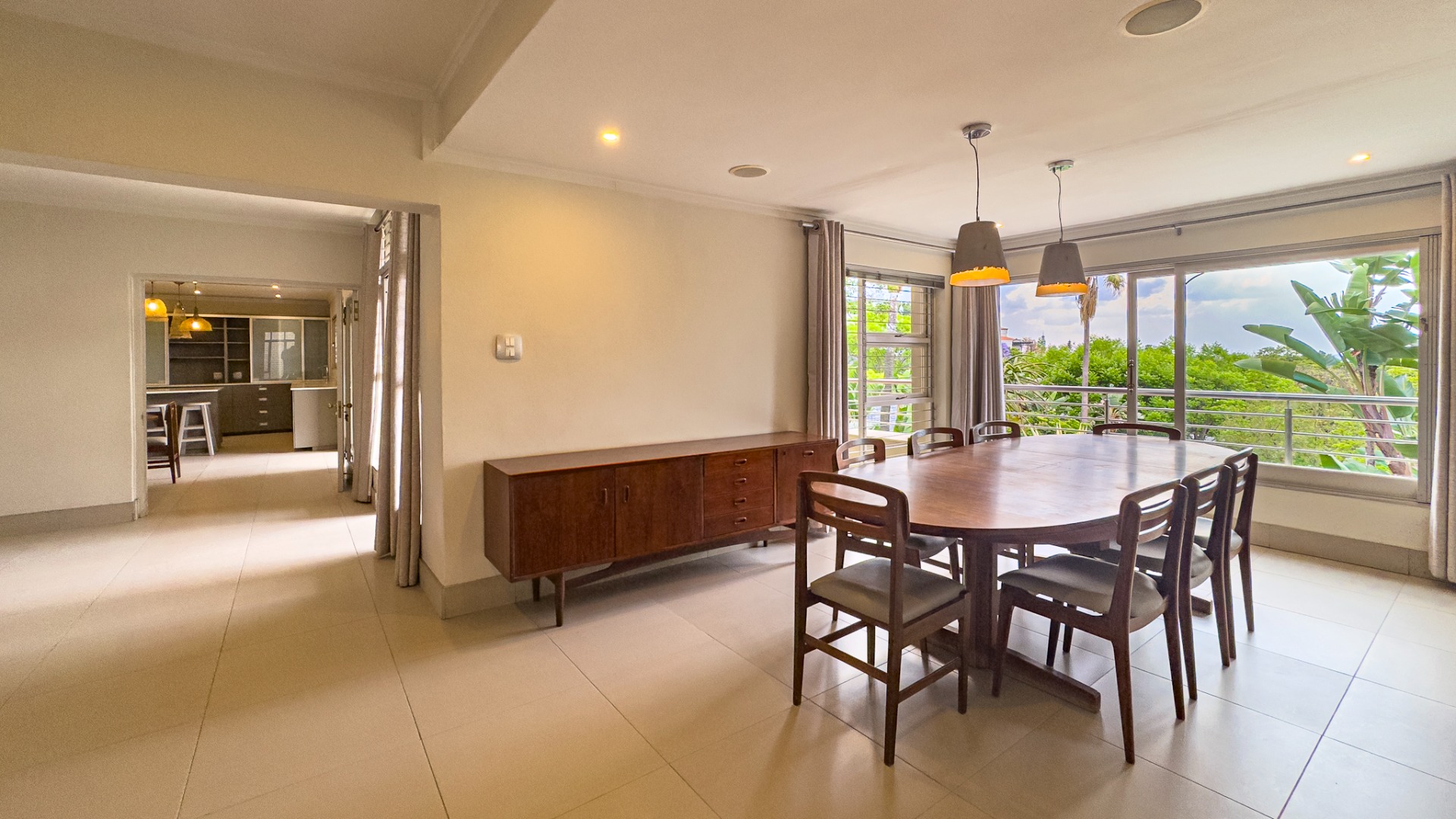 Upon entering, you are welcomed by a grand double-volume entrance hall, leading into a series of spacious open-plan living areas — including a formal lounge, TV lounge, dining room, and an additional dining space adjacent to the kitchen. These beautifully interconnected spaces flow seamlessly onto an expansive entertainment terrace with a built-in braai, all overlooking the city centre of Pretoria.