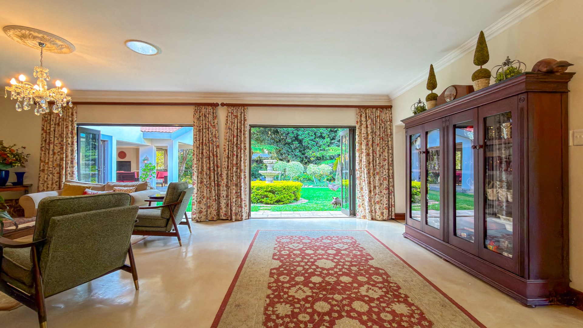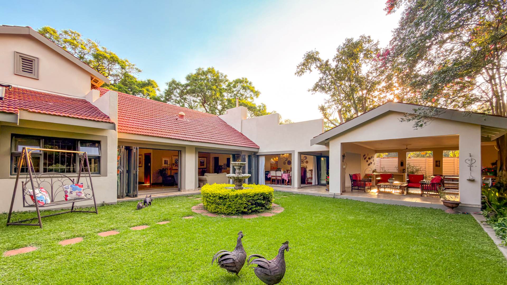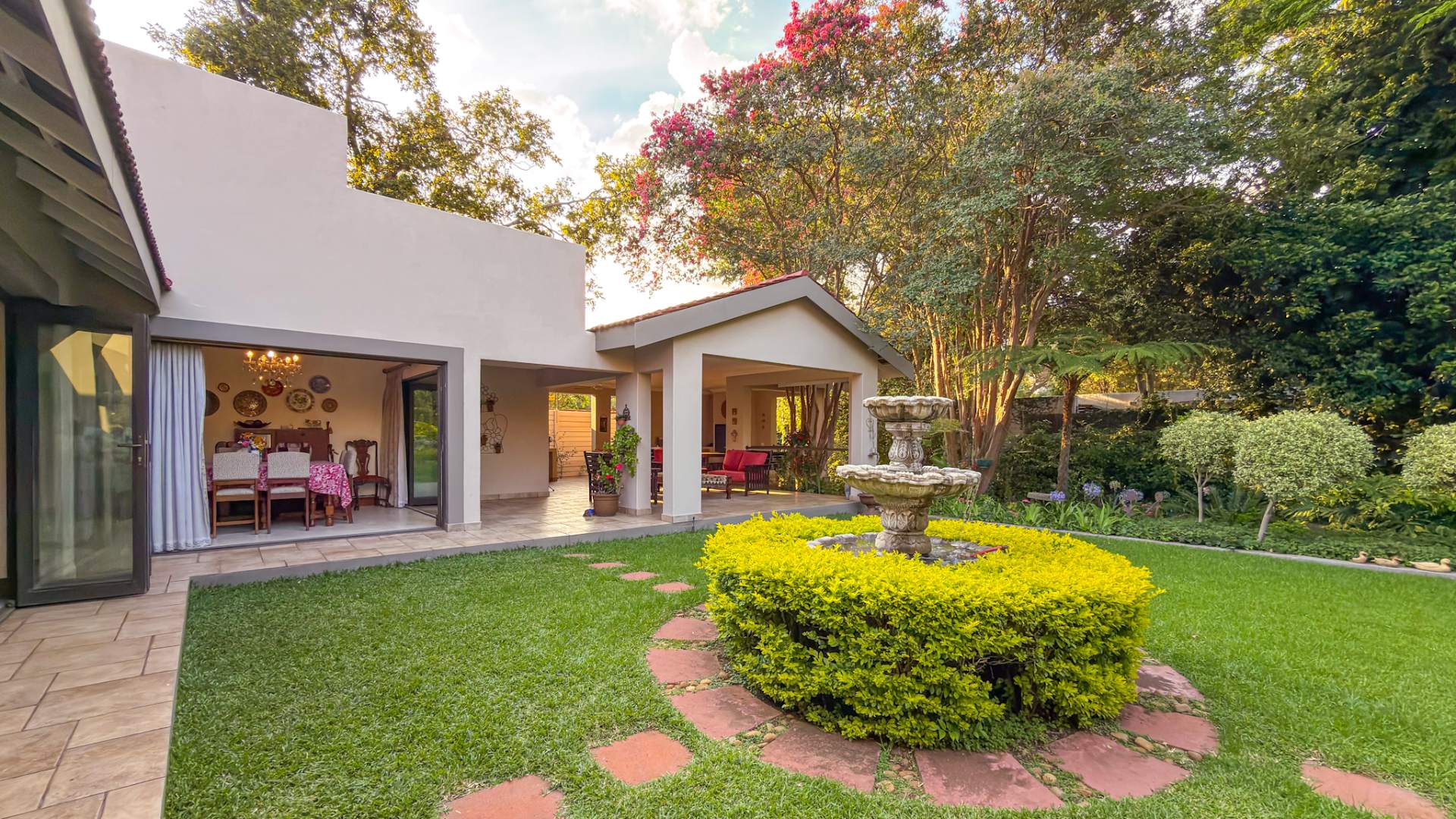 The entertainment areas flow beautifully through expansive doors onto a quaint, meticulously manicured landscaped garden, complete with a tranquil pond. This space further extends to a generous, light-filled patio and entertainment area. Truly the heartbeat of the home, this inviting stoep promises countless memorable family gatherings and relaxed evenings with friends.