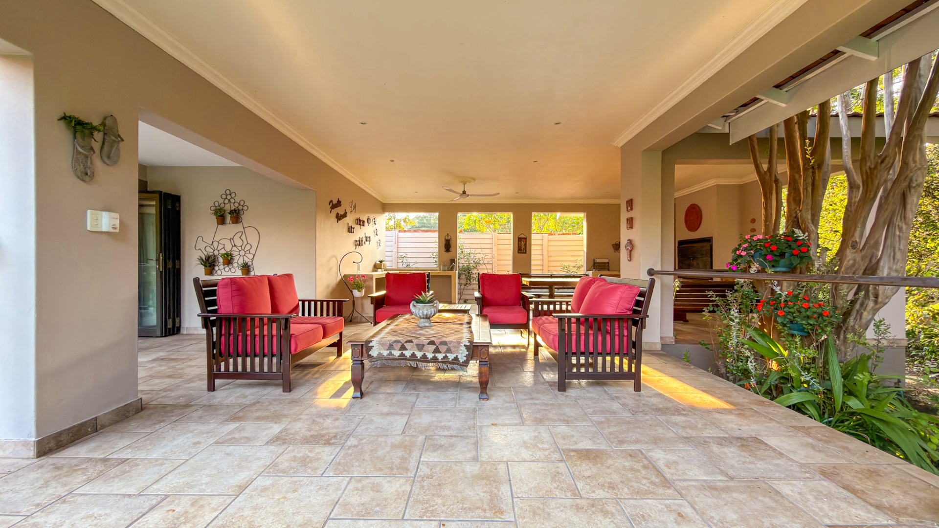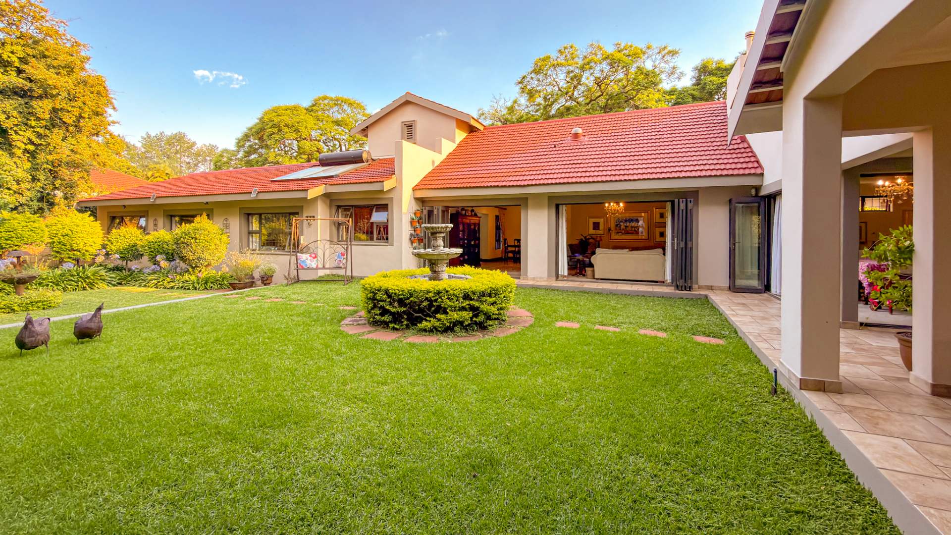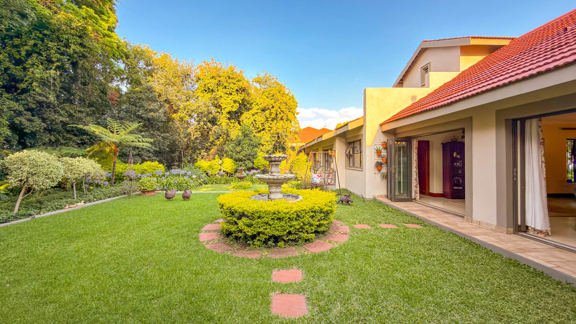 The entertainment areas flow beautifully through expansive doors onto a quaint, meticulously manicured landscaped garden, complete with a tranquil pond. This space further extends to a generous, light-filled patio and entertainment area. Truly the heartbeat of the home, this inviting stoep promises countless memorable family gatherings and relaxed evenings with friends.
