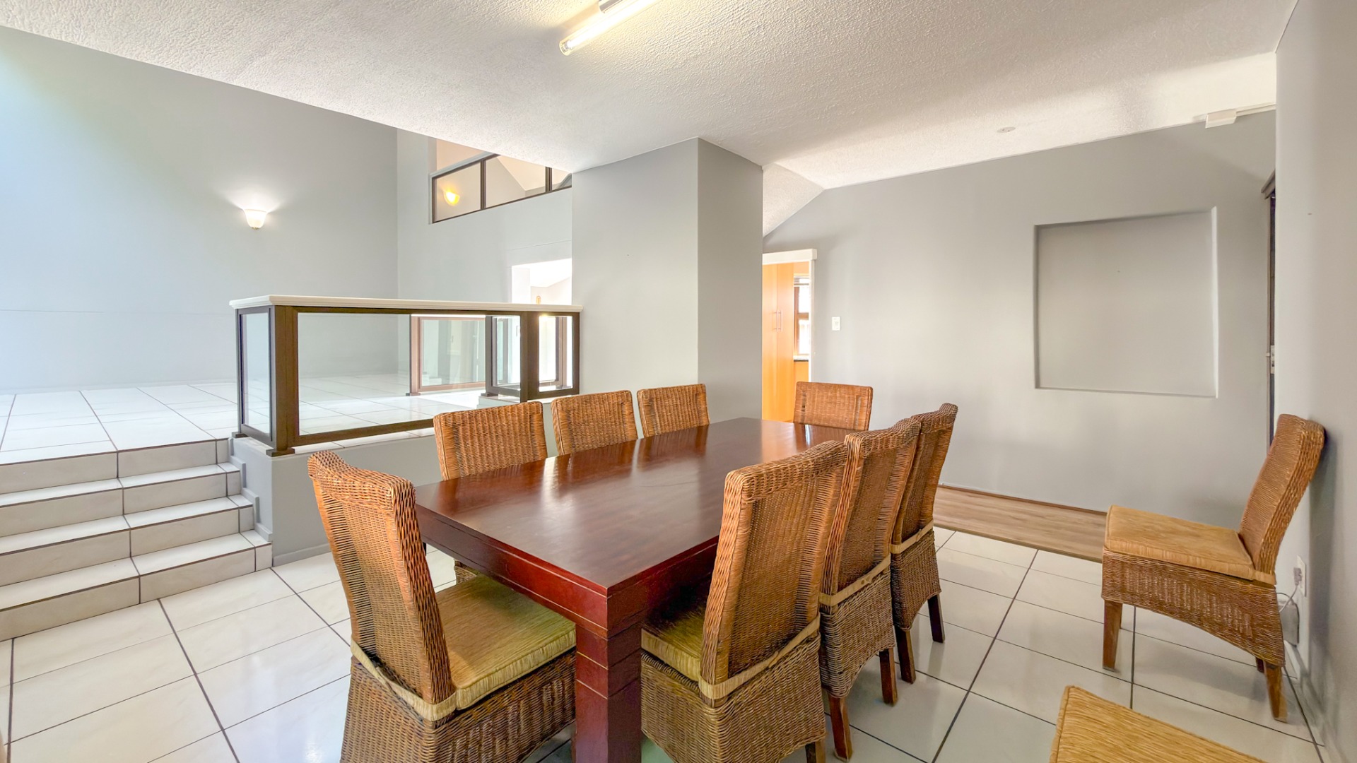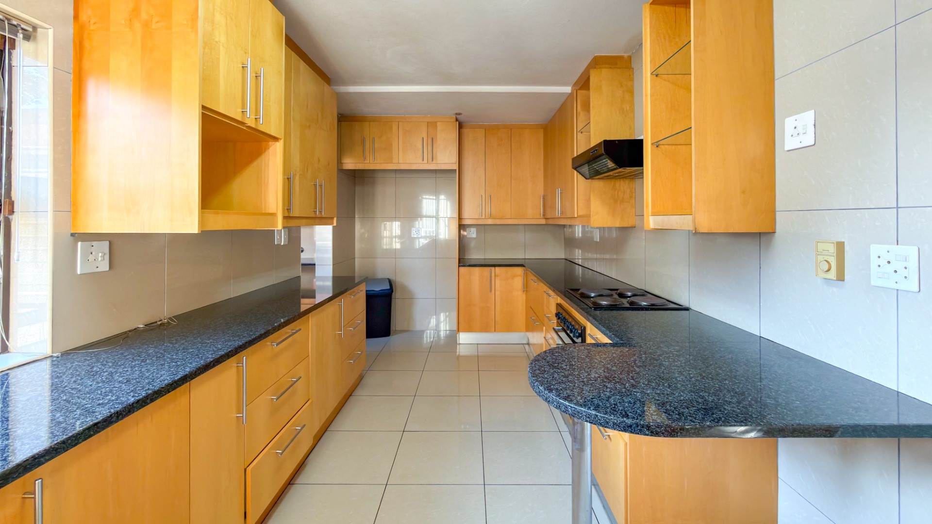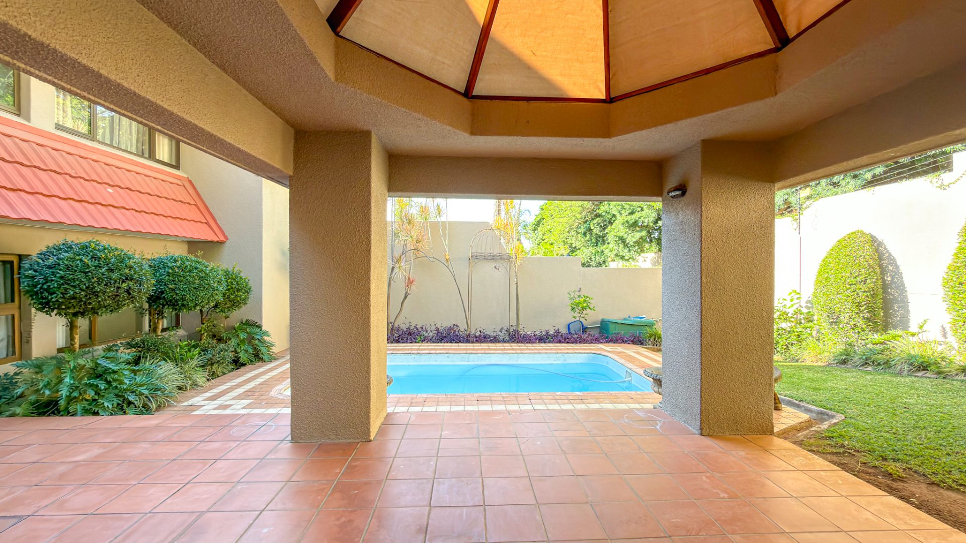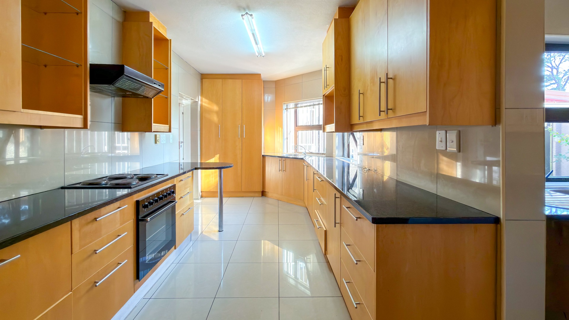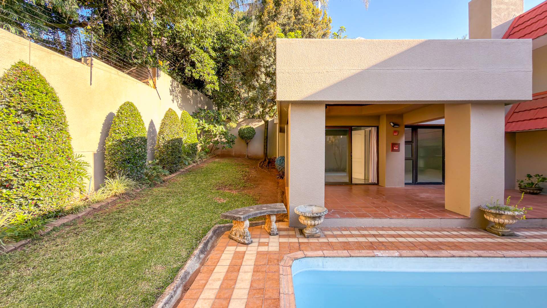 Accommodation includes four well-sized bedrooms and three bathrooms, complemented by staff quarters for added convenience. Practical extras such as a walk-in safe and dedicated storage closet enhance the home’s functionality.
