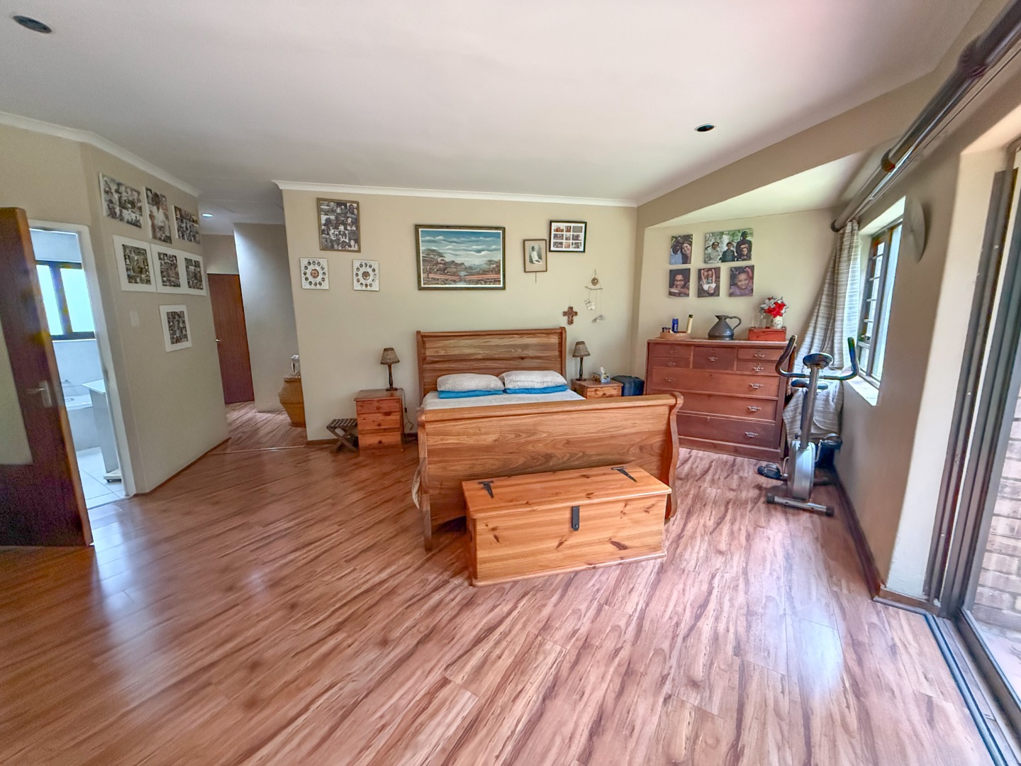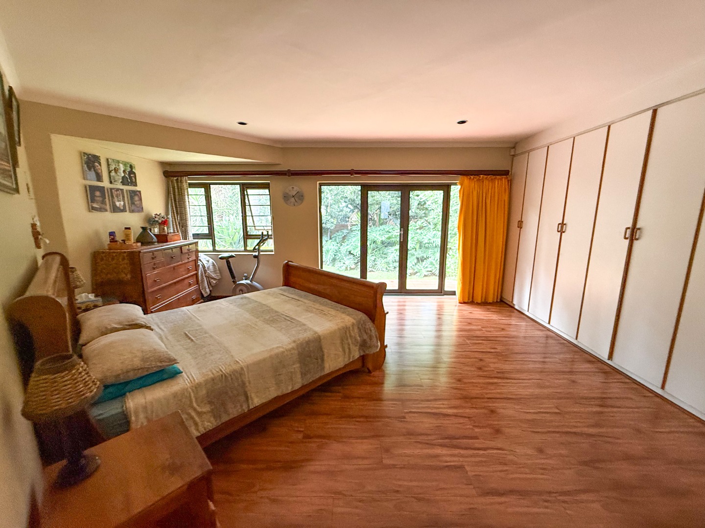 The main suite is a sanctuary of comfort and privacy. Generously sized, it opens onto its own secluded patio and private garden area, connecting to the pool. Large windows and doors allow for abundant natural light, while the en-suite bathroom is elegantly appointed with a bath, shower, basin, and toilet.