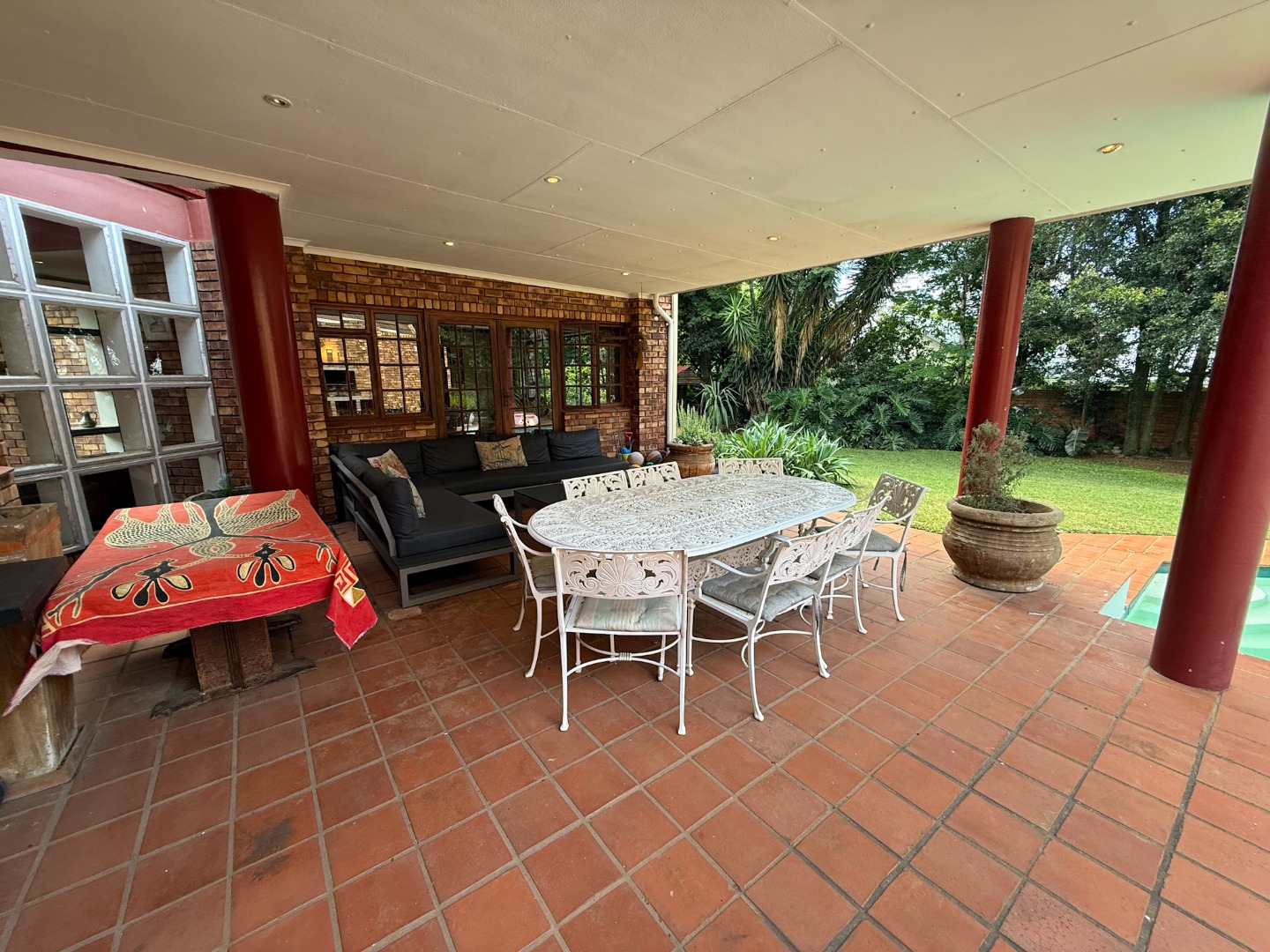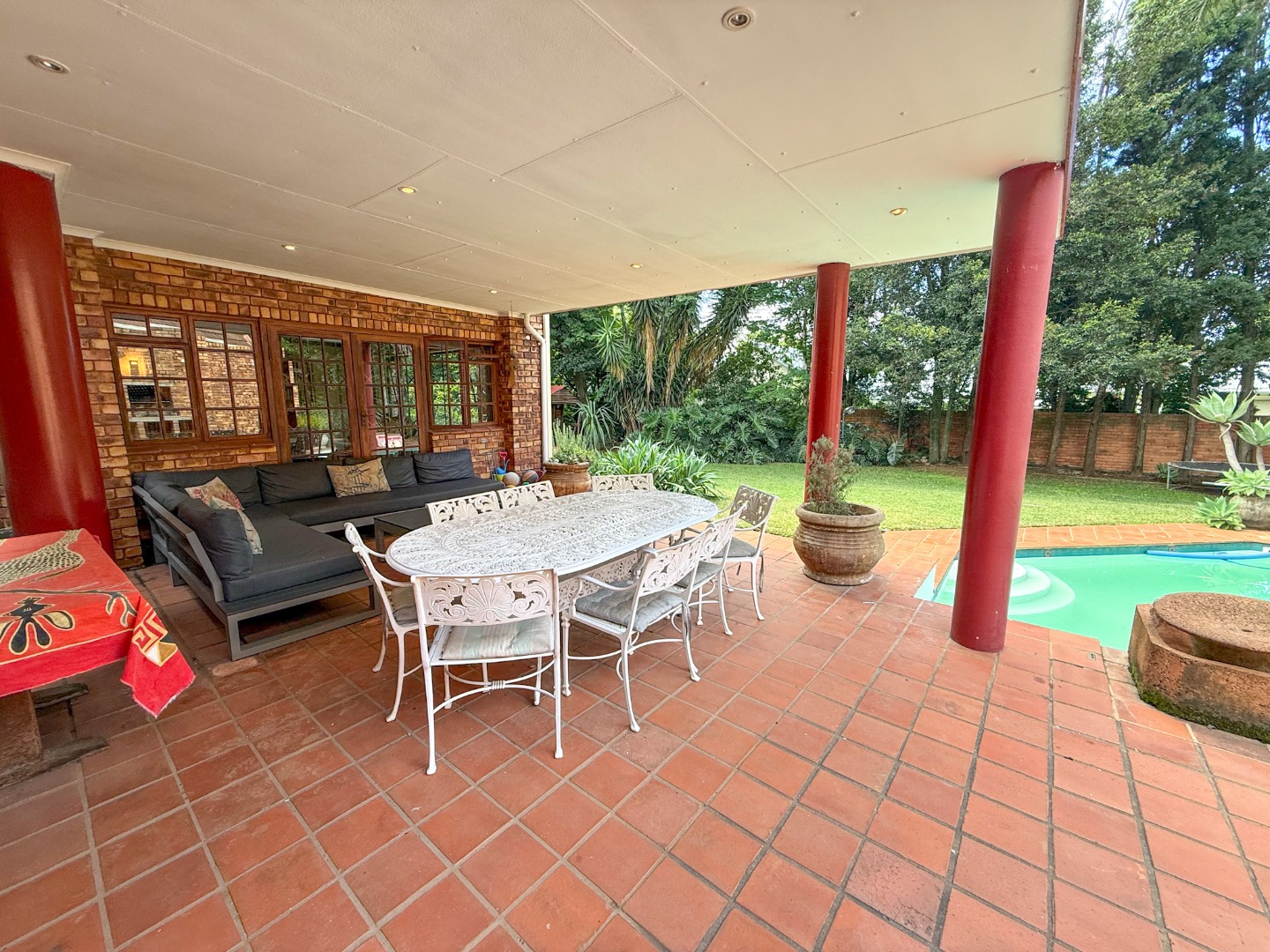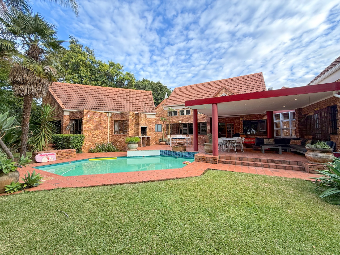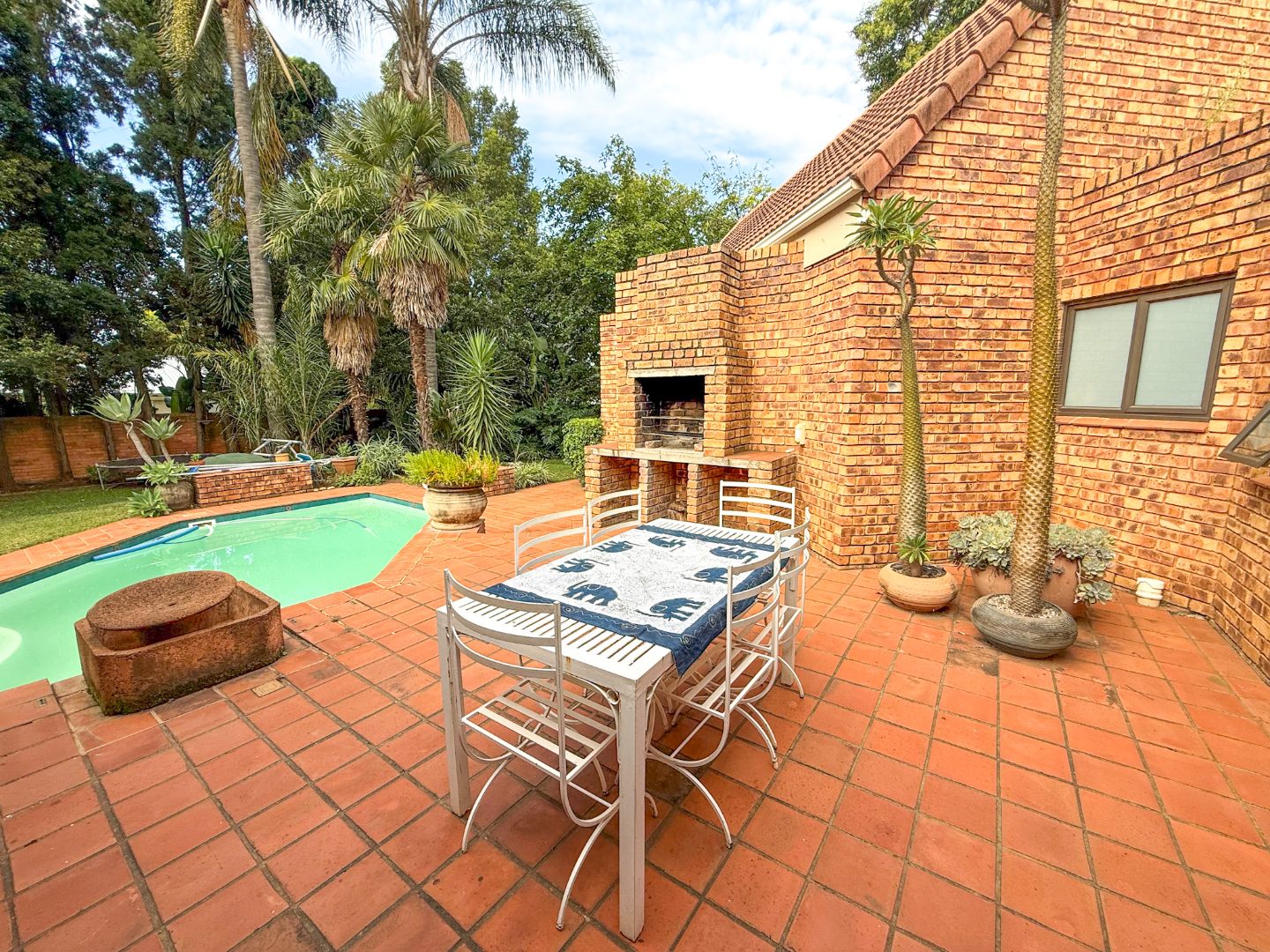 The generously proportioned stoep is a true highlight, complete with a built-in braai and ample seating space, creating the ideal setting for hosting family and friends. Overlooking the manicured garden and inviting swimming pool, this outdoor space enhances the home’s sense of relaxed luxury.