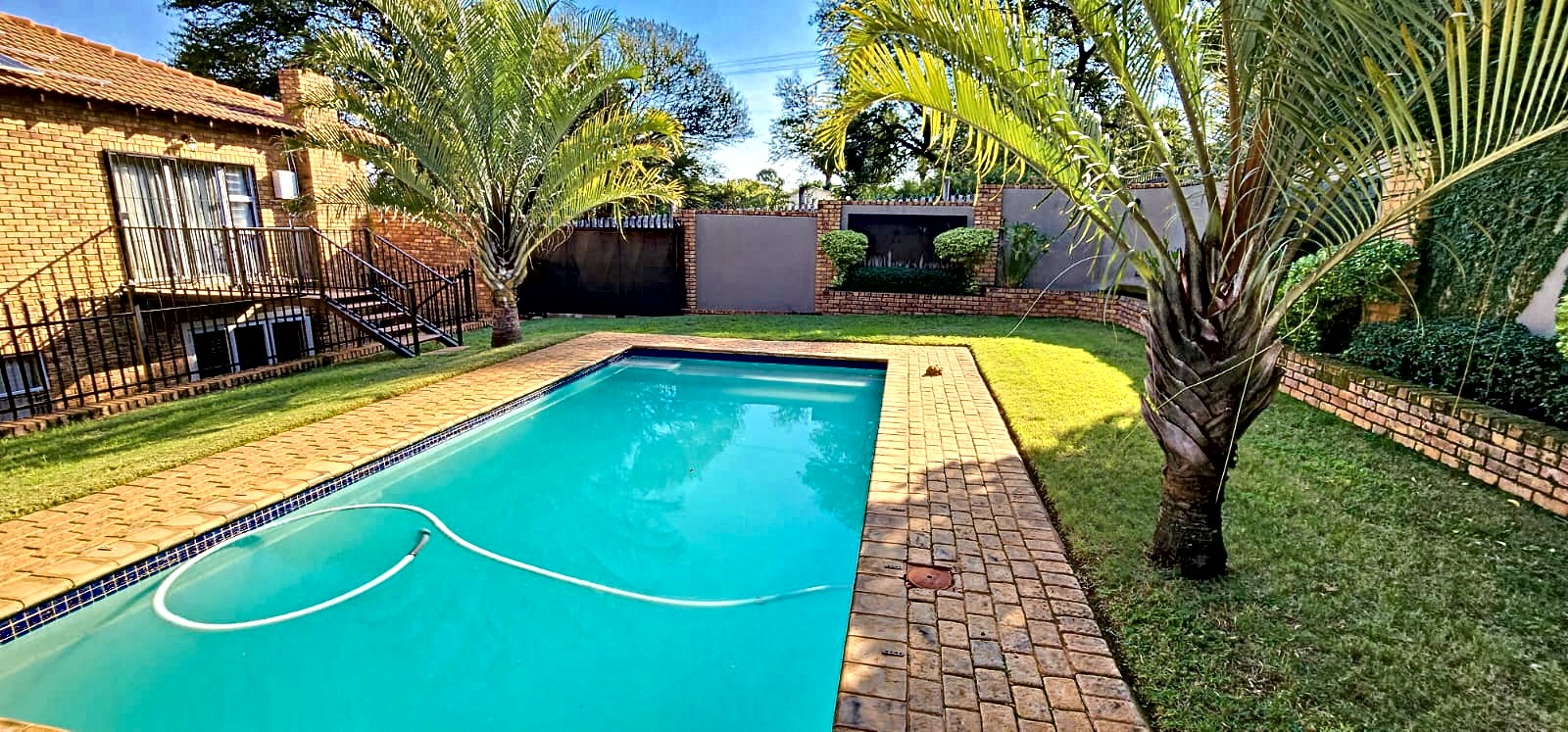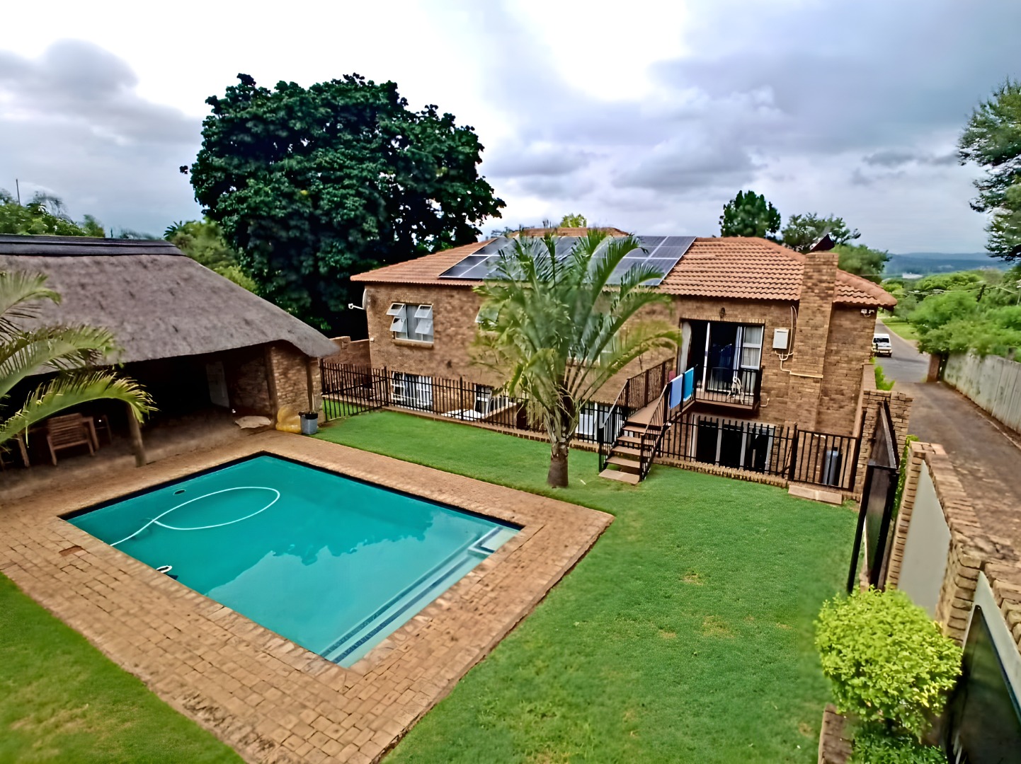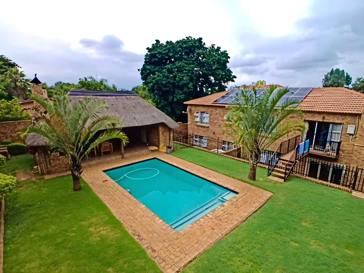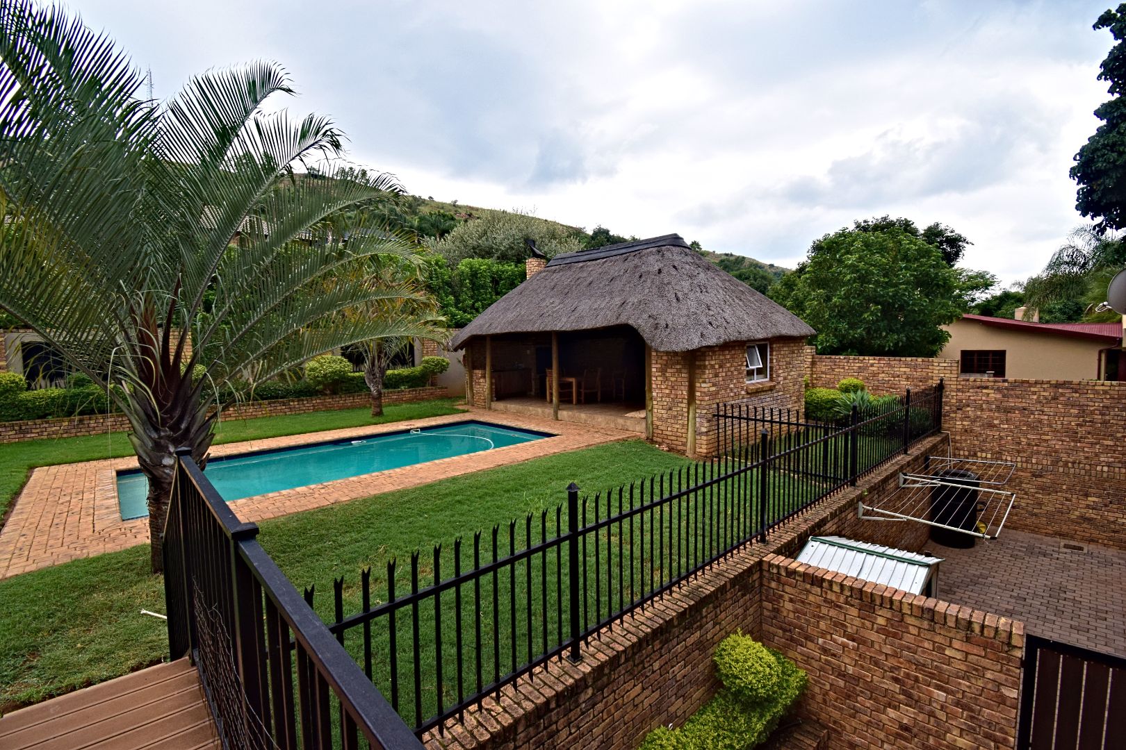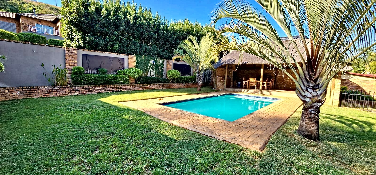 backyard with a swimming pool, thatched lapa with built-in braai & guest