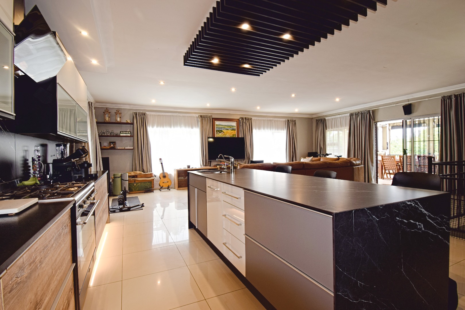 entertainment room with a built-in braai and sliding doors opening to both