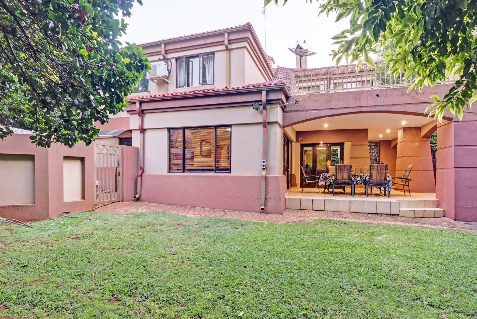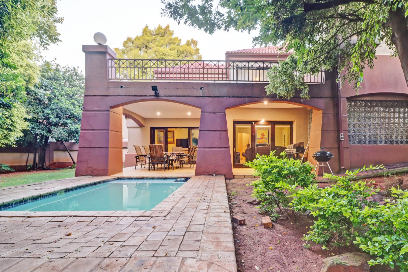 The upper level hosts five serene bedrooms and four luxurious bathrooms, including two private ensuites, offering ultimate comfort and privacy. Outside, a private swimming pool forms the centrepiece of a tranquil oasis, complemented by a spacious covered patio and a built-in braai, perfect for alfresco dining. Residents benefit from the unparalleled security of a 24-hour access-controlled estate, complete with fibre connectivity and a battery inverter. Further enhancing this luxurious lifestyle are access to a clubhouse, squash court, and tennis court, alongside staff quarters and pet-friendly premises. Woodhill, Pretoria, is a highly sought-after suburb renowned for its secure, family-friendly environment and proximity to essential amenities, offering an exclusive lifestyle within a vibrant South African community.