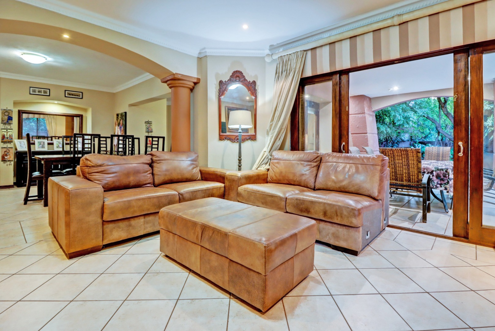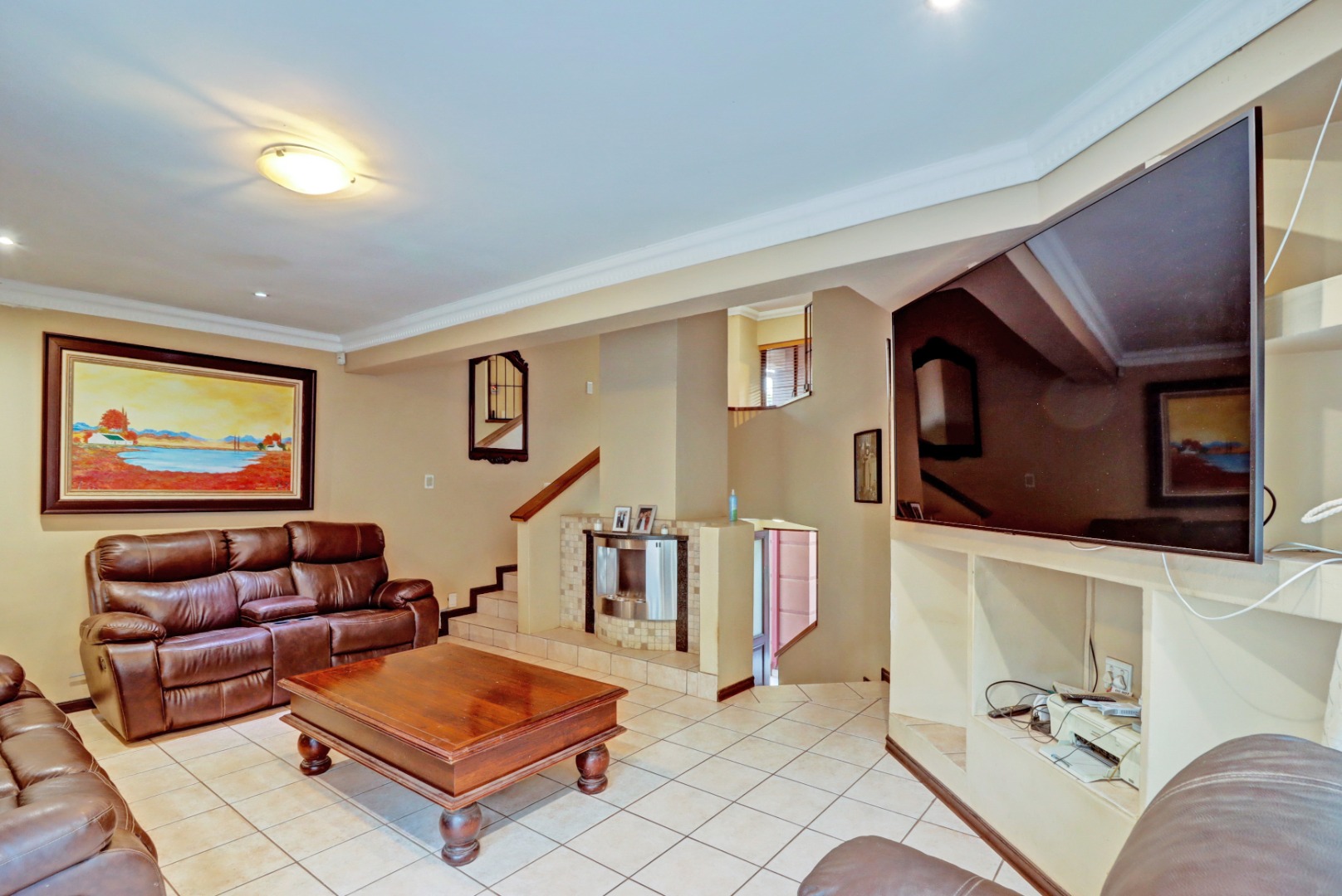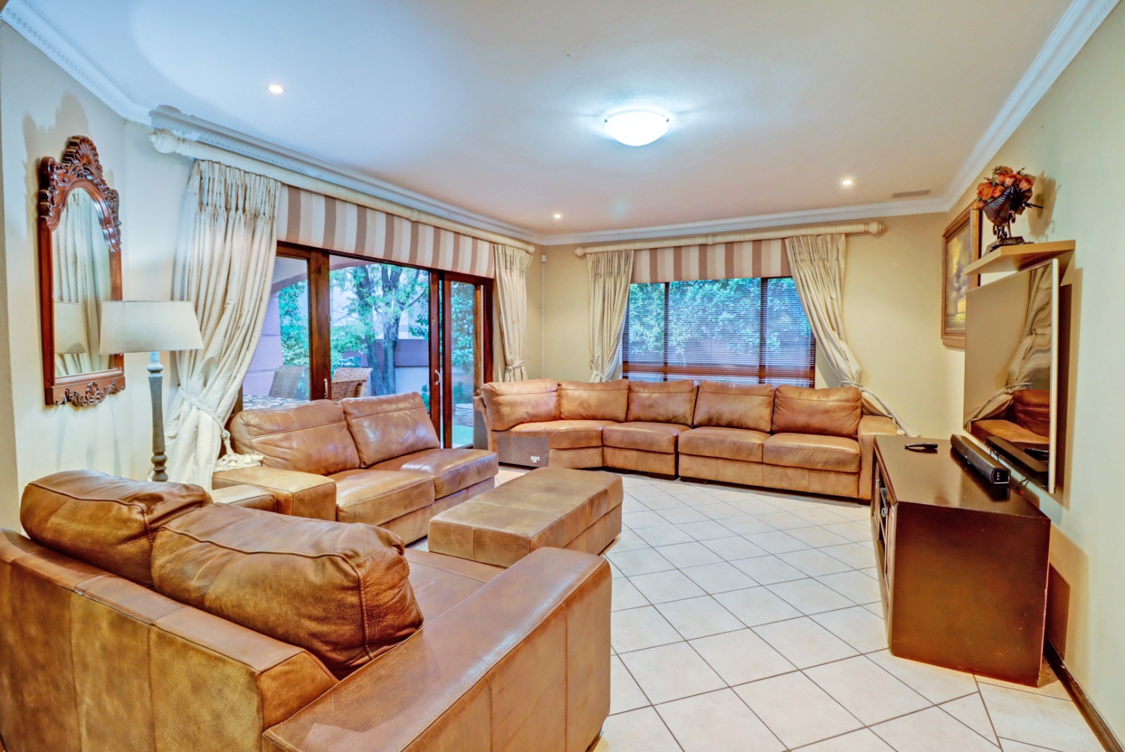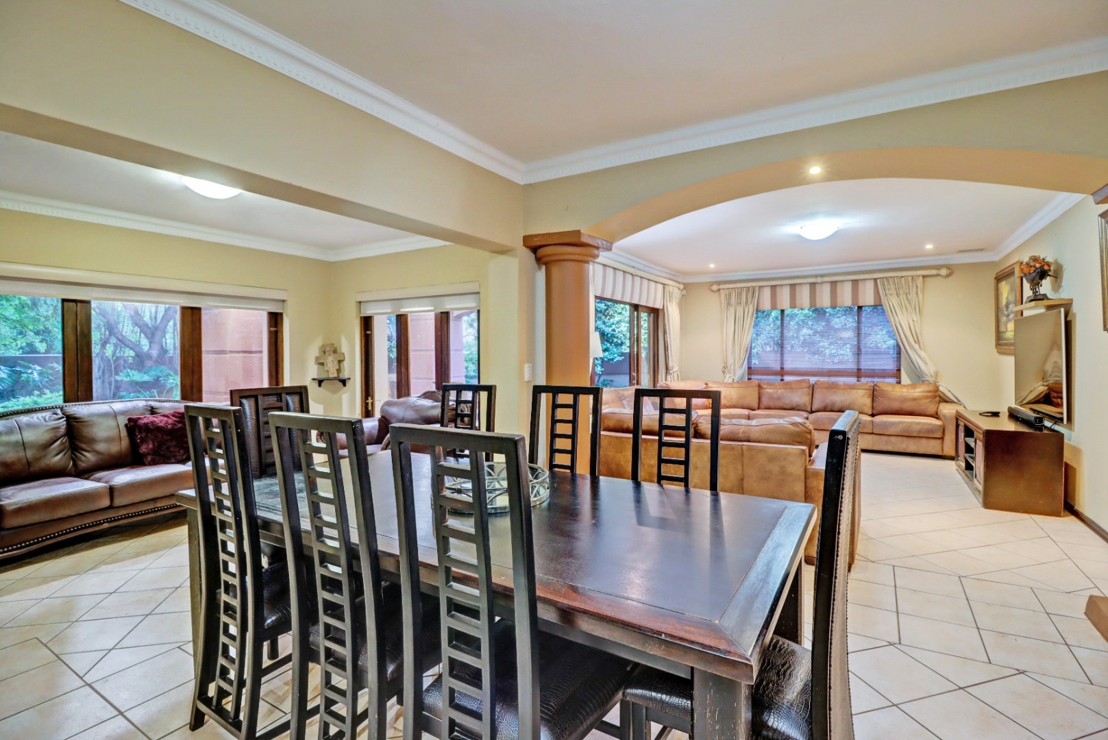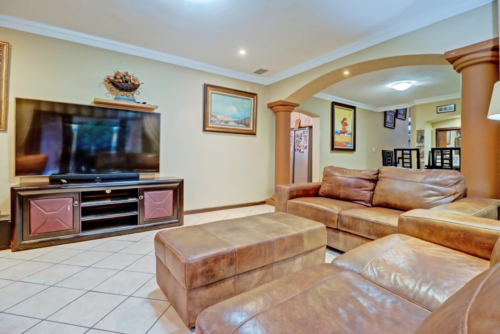 Nestled within the prestigious Woodhill Golf Estate in Pretoria, this distinguished residence presents an immediate impression of grandeur. Its distinctive architectural style, accentuated by a prominent arched entrance and classic red tiled roofs, is complemented by two private balconies. An extensive paved driveway leads to multi-car garaging, framed by mature landscaping. Inside, an expansive, open-plan layout designed for sophisticated living features two lounges, a formal dining room, and a dedicated study with built-in bookshelves. Abundant natural light fills these spaces, which boast elegant crown molding and durable tiled flooring. The functional kitchen, complete with ample cabinetry, generous counter space, and a convenient pantry, awaits your personal touch.