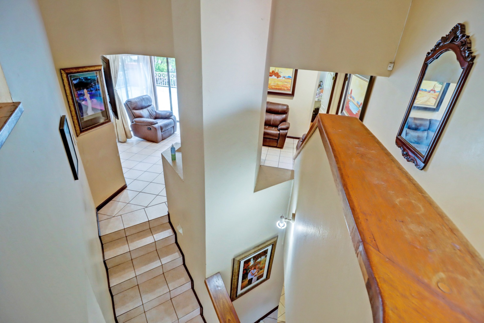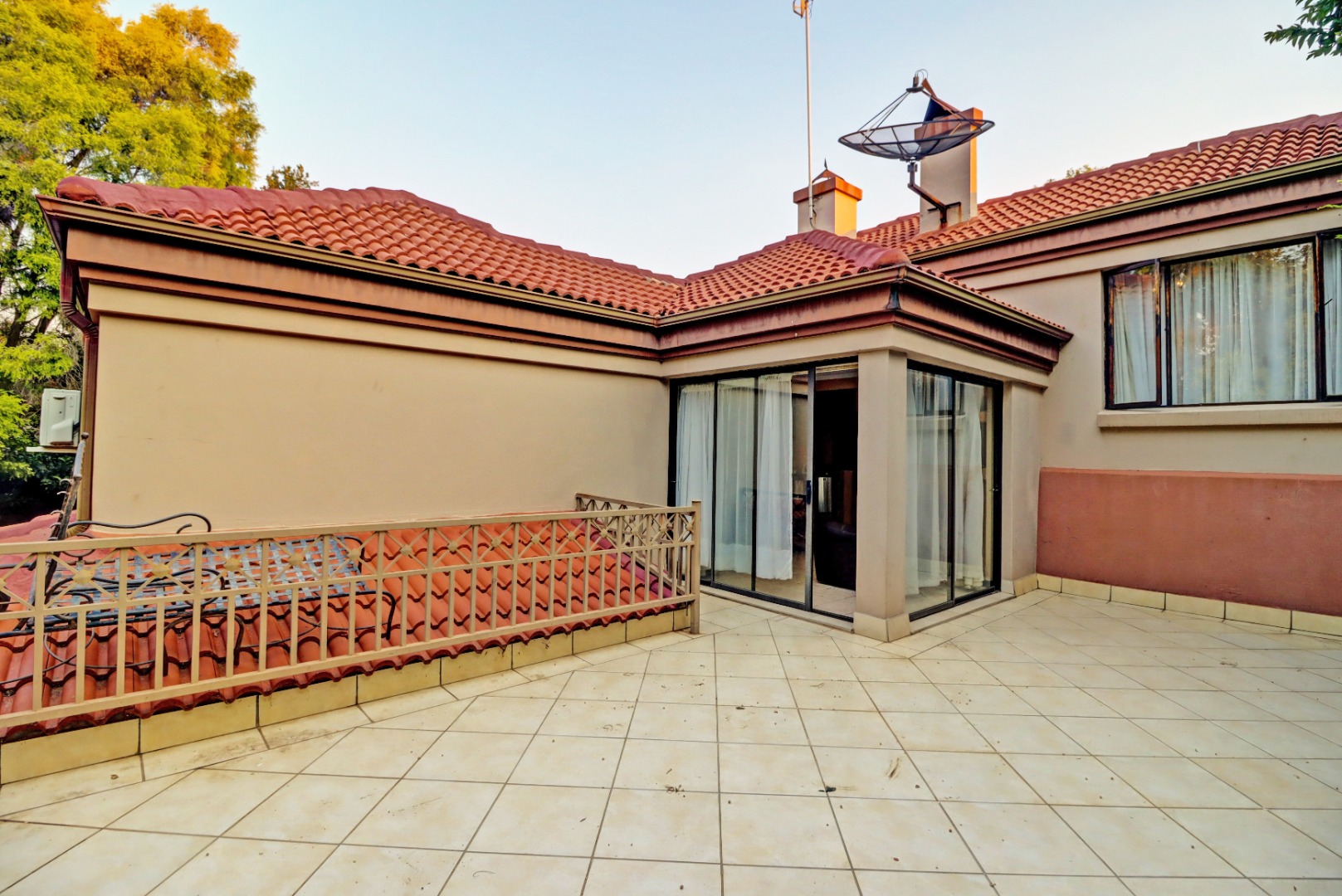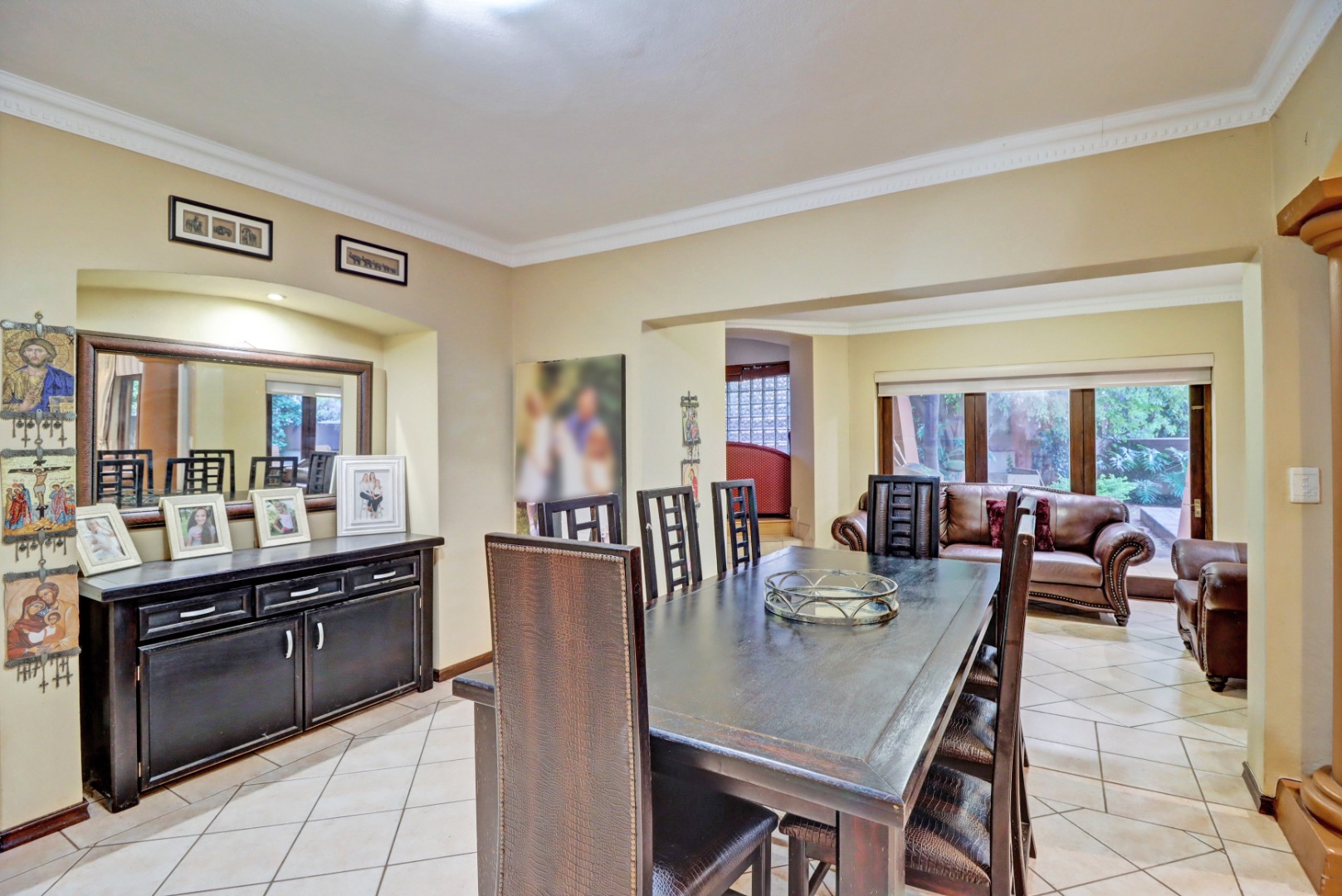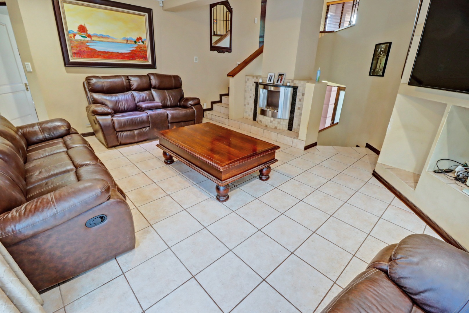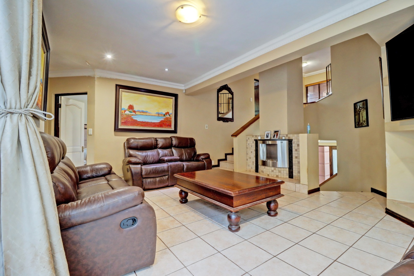 Nestled within the prestigious Woodhill Golf Estate in Pretoria, this distinguished residence presents an immediate impression of grandeur. Its distinctive architectural style, accentuated by a prominent arched entrance and classic red tiled roofs, is complemented by two private balconies. An extensive paved driveway leads to multi-car garaging, framed by mature landscaping. Inside, an expansive, open-plan layout designed for sophisticated living features two lounges, a formal dining room, and a dedicated study with built-in bookshelves. Abundant natural light fills these spaces, which boast elegant crown molding and durable tiled flooring. The functional kitchen, complete with ample cabinetry, generous counter space, and a convenient pantry, awaits your personal touch.
