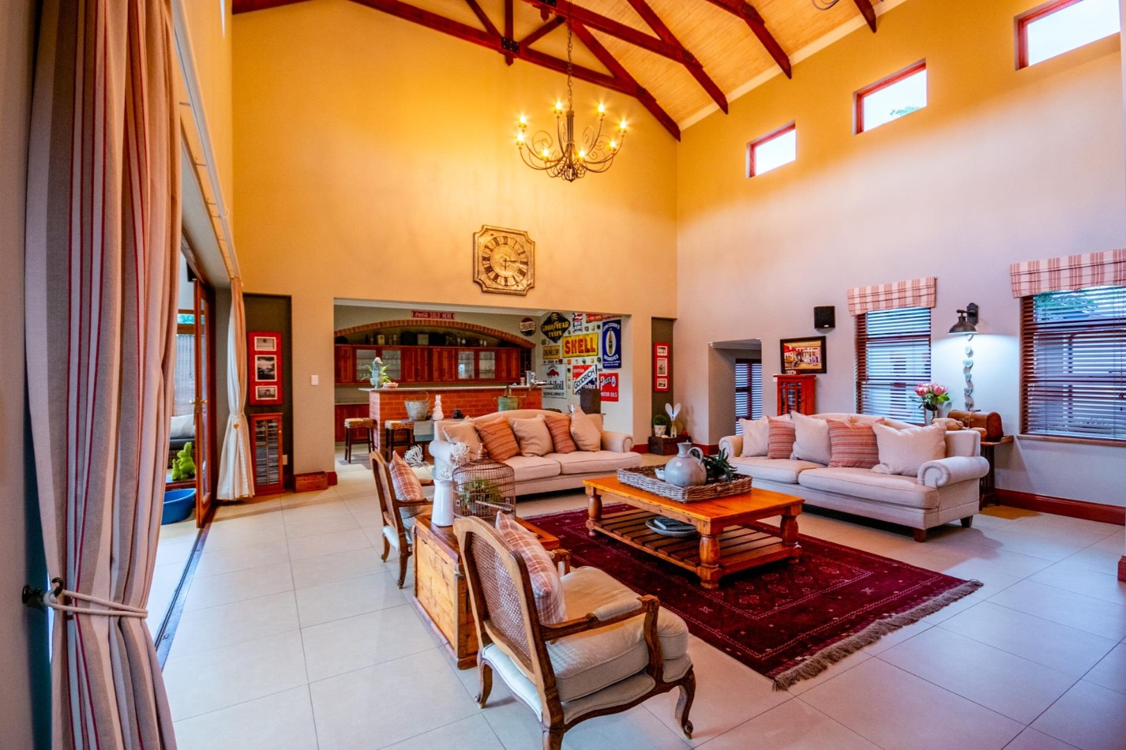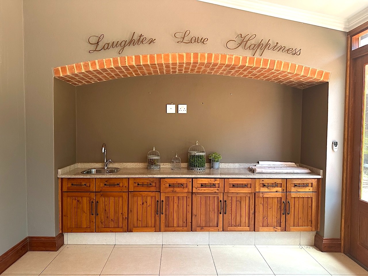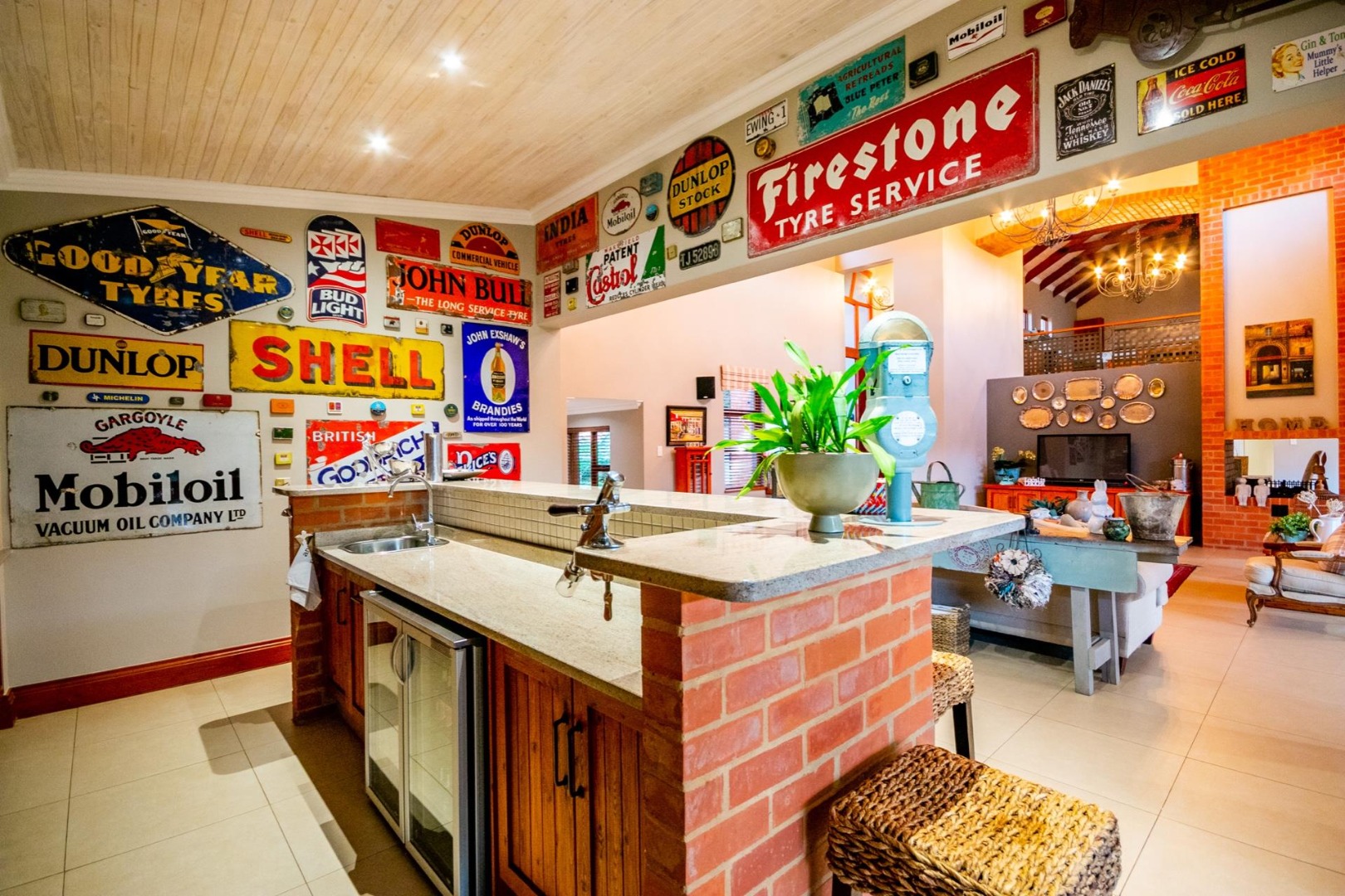 Enjoy relaxing or entertain in the spacious lounge or adjacent patio area with built-in braai (full rotisserie option) and double stacking doors opening up on the gorgeous garden. More fun times expected at the characterful bar! Open living to the masterful garden but also ideal for cosy winters...love the massive stone wall with gas fireplace...relish every corner...