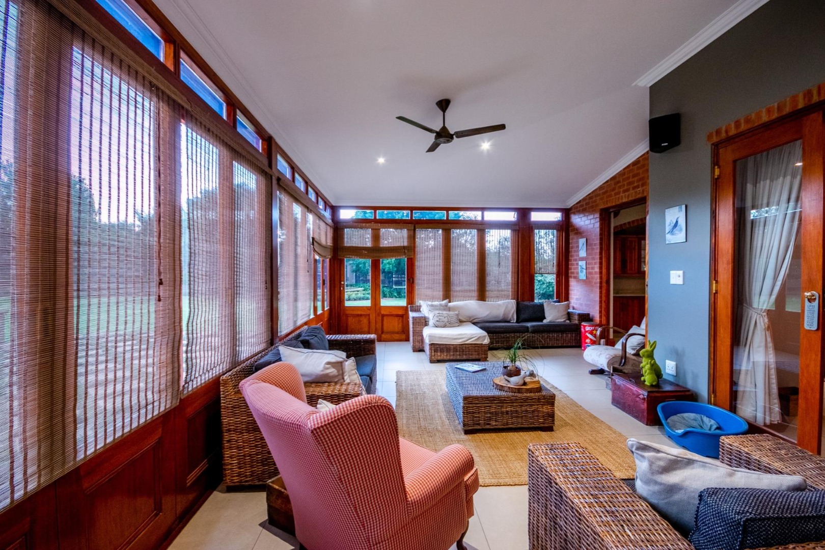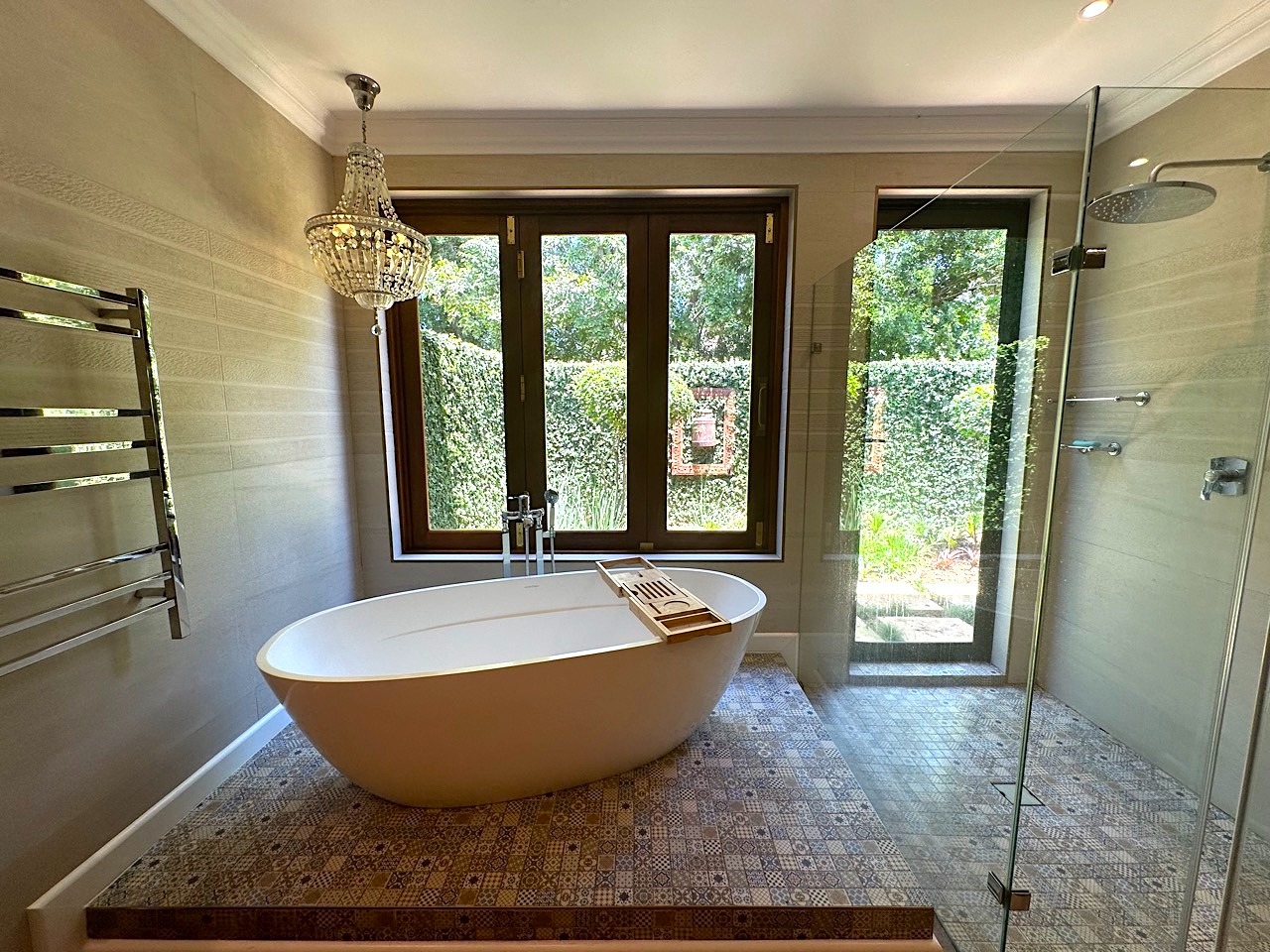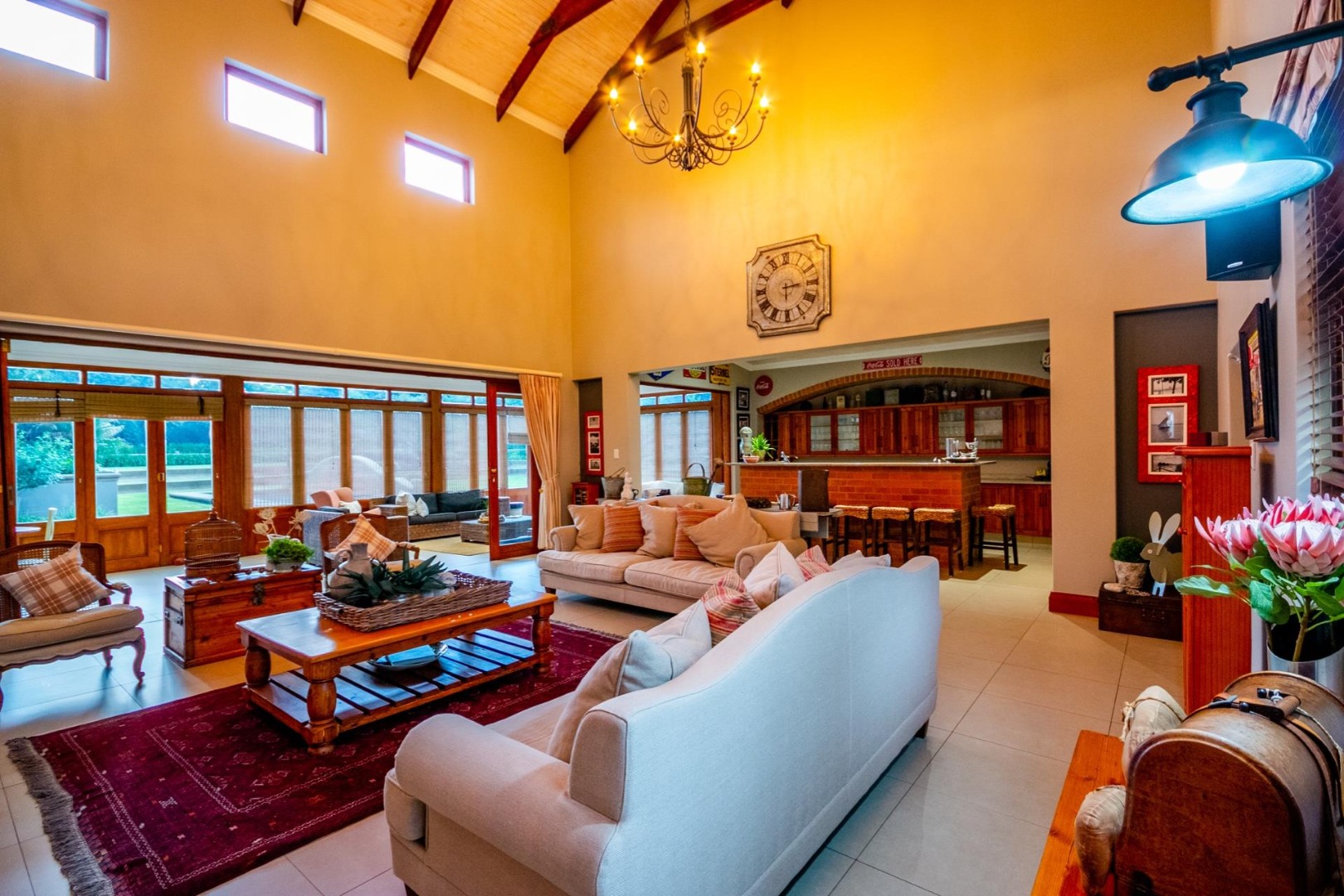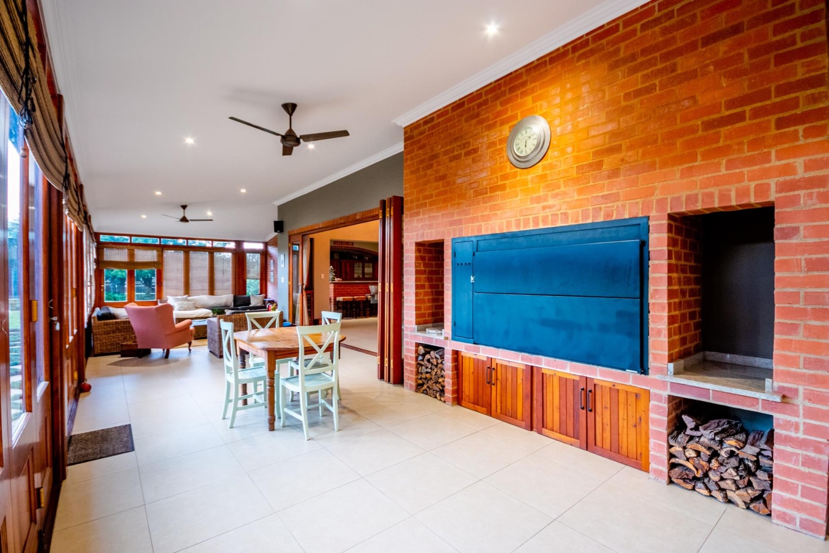 Enjoy relaxing or entertain in the spacious lounge or adjacent patio area with built-in braai (full rotisserie option) and double stacking doors opening up on the gorgeous garden. More fun times expected at the characterful bar! Open living to the masterful garden but also ideal for cosy winters...love the massive stone wall with gas fireplace...relish every corner...