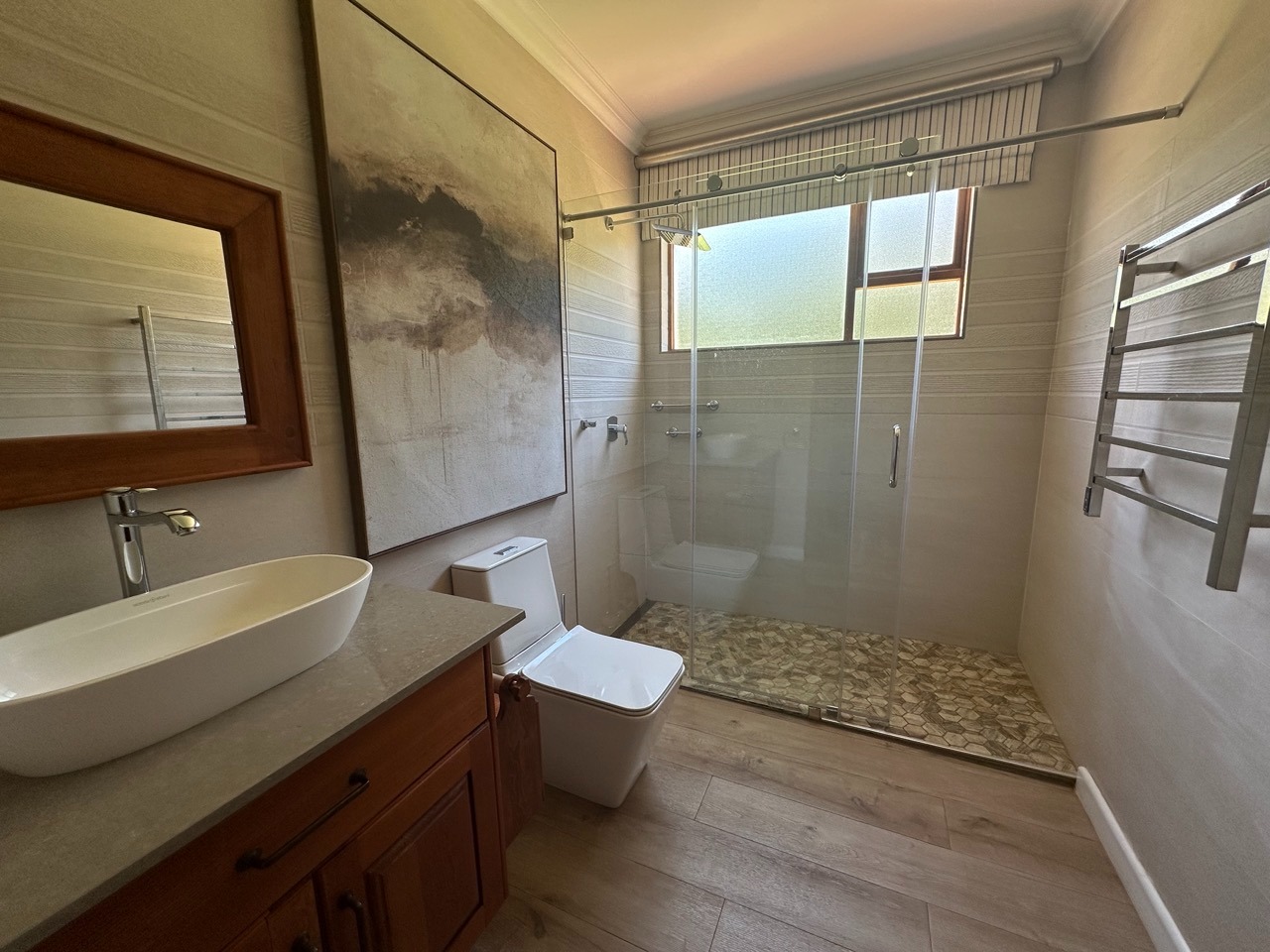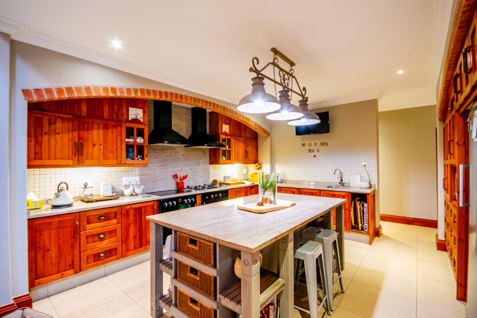 Enjoy relaxing or entertain in the spacious lounge or adjacent patio area with built-in braai (full rotisserie option) and double stacking doors opening up on the gorgeous garden. More fun times expected at the characterful bar! Open living to the masterful garden but also ideal for cosy winters...love the massive stone wall with gas fireplace...relish every corner...