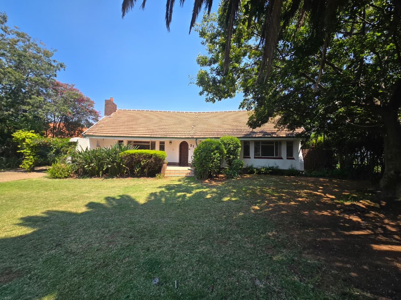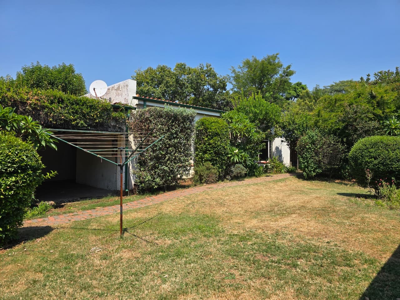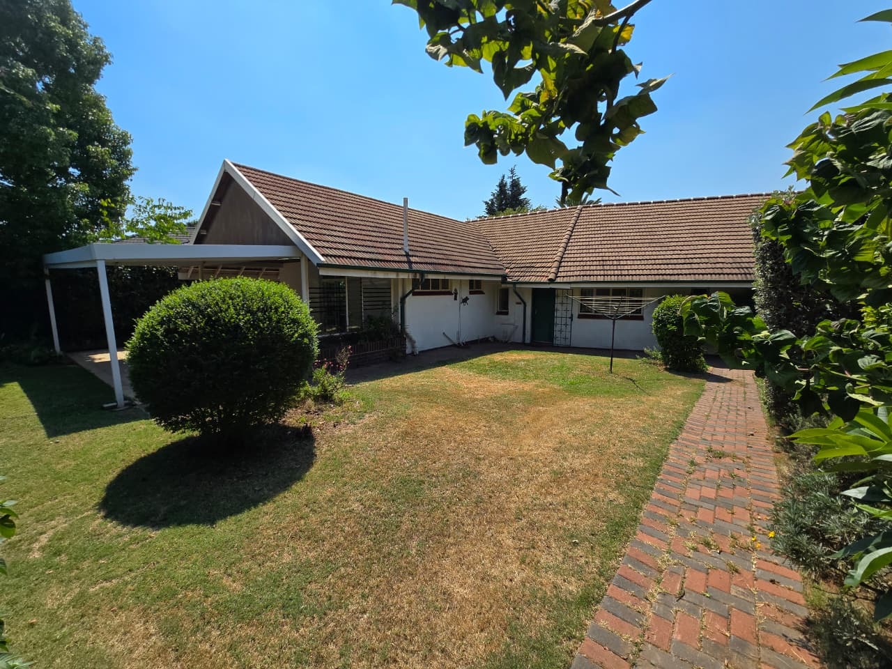 Nestled in the desirable suburb of Pine Park, Randburg, this charming single-story residence presents a welcoming facade. The property boasts established landscaping with mature trees and flowering shrubs, creating a private and serene environment. A brick paved driveway leads to the home, enhancing its traditional aesthetic and offering ample parking space for residents and visitors alike.