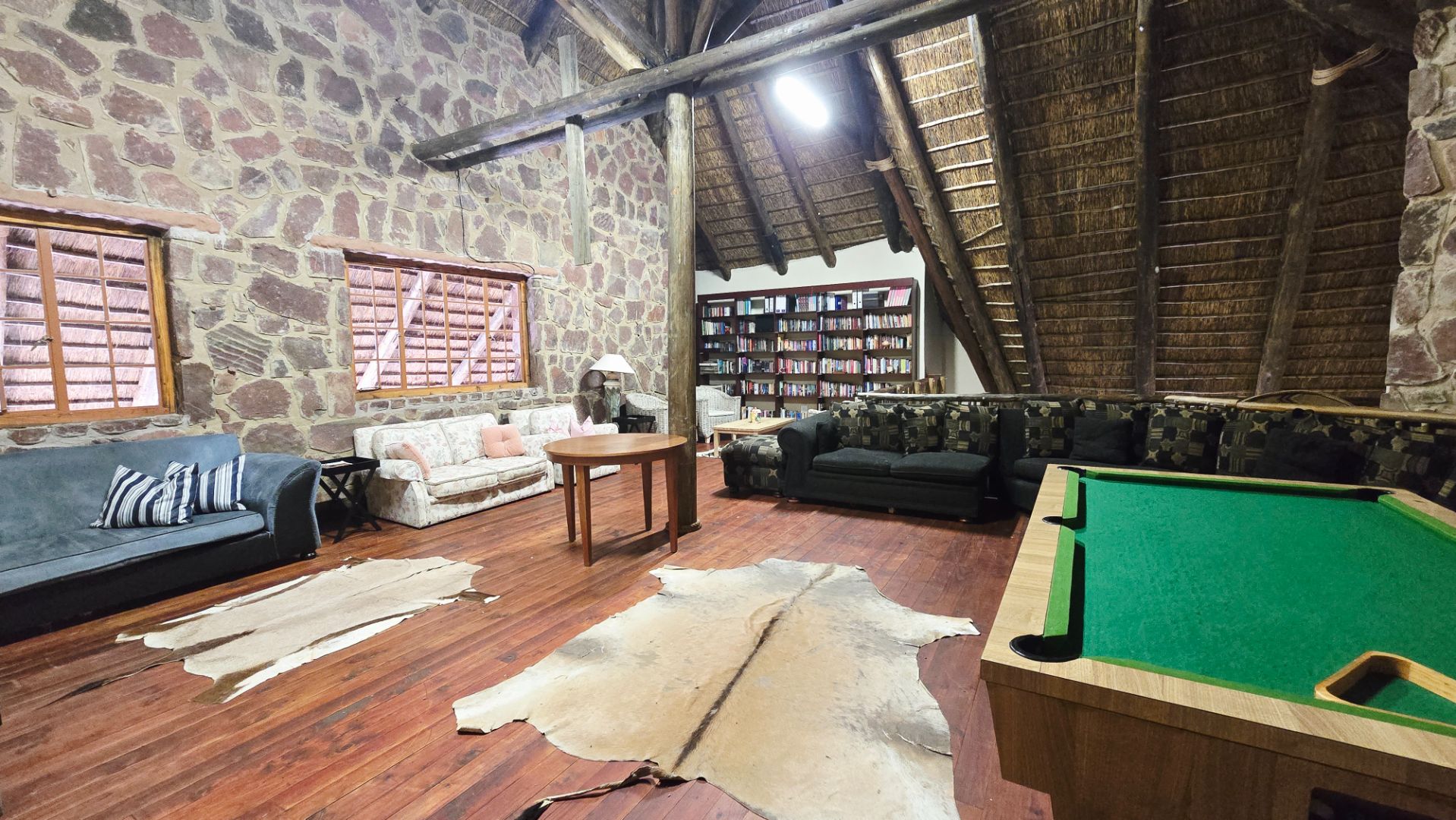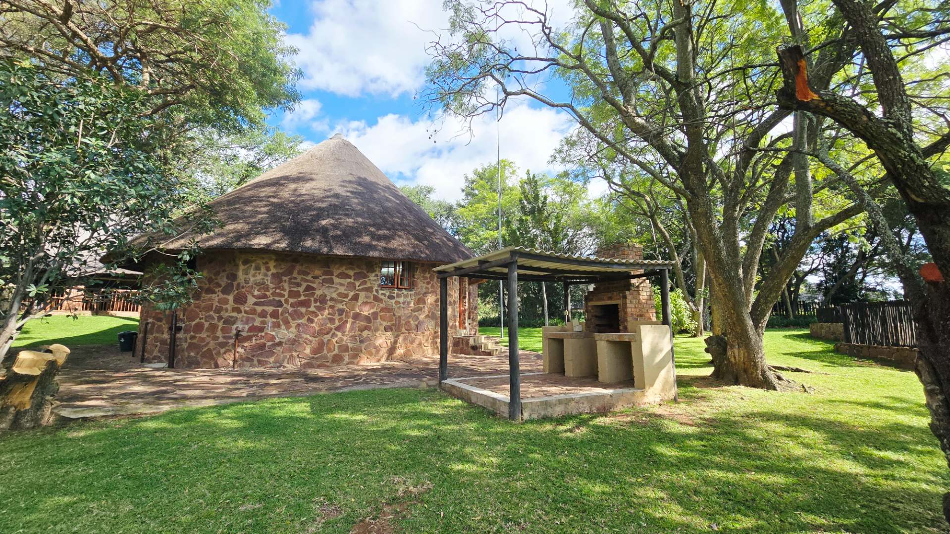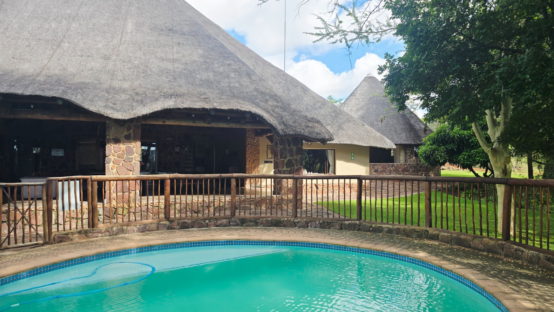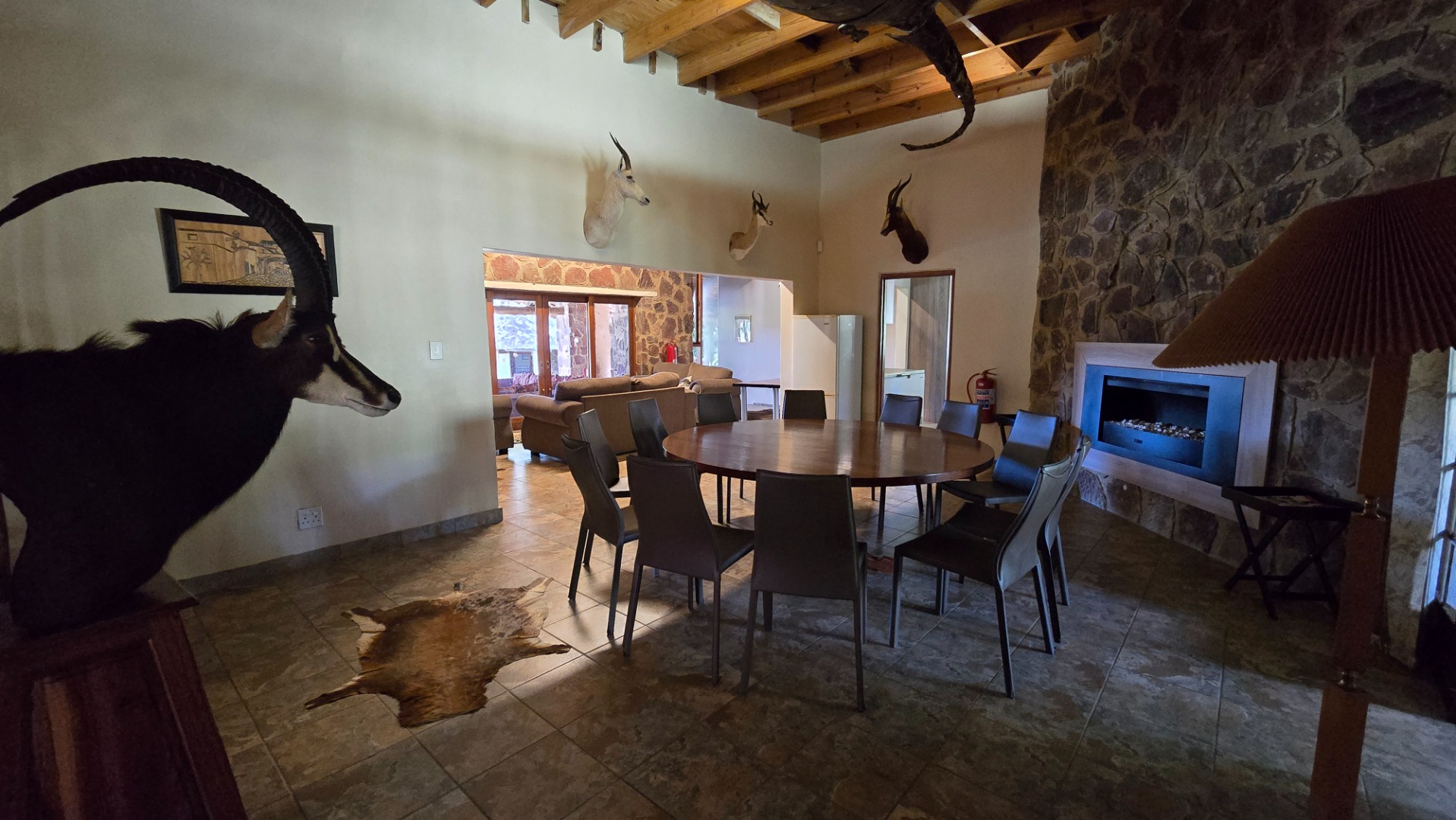 The lodge has been developed in true African style with upper class finishes and consist of a large dining area with gas fireplace, bar, conference room with internet and WiFi, industrial type kitchen, guest toilet and a large loft area used for recreation with DSTV, walk-in safe, library and pool table. Accommodation at this lodge consists of 5 chalets with en-suite bathrooms, swimming pool and braai-boma all set in lush gardening and lawns with automized irrigation systems. The lodge has a 37KVA back-up generator installed and can accommodate up to 24 guests.