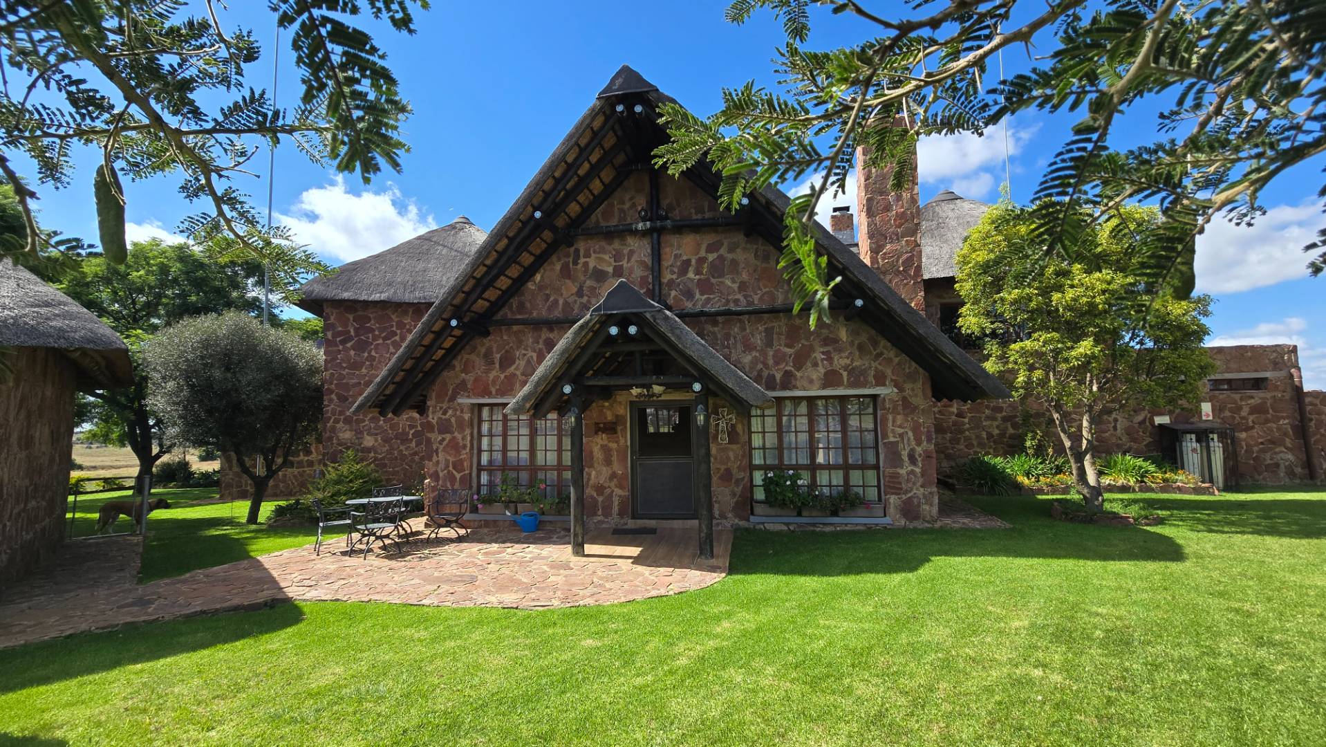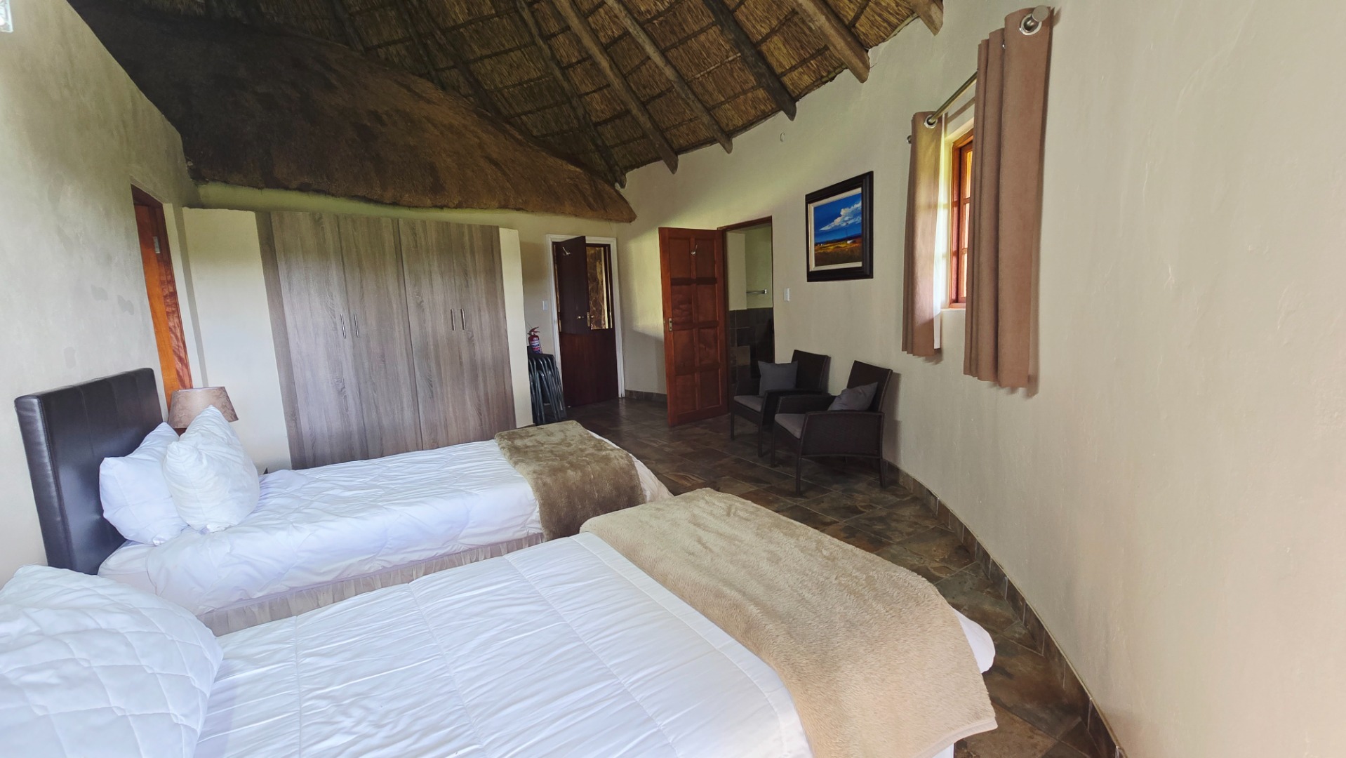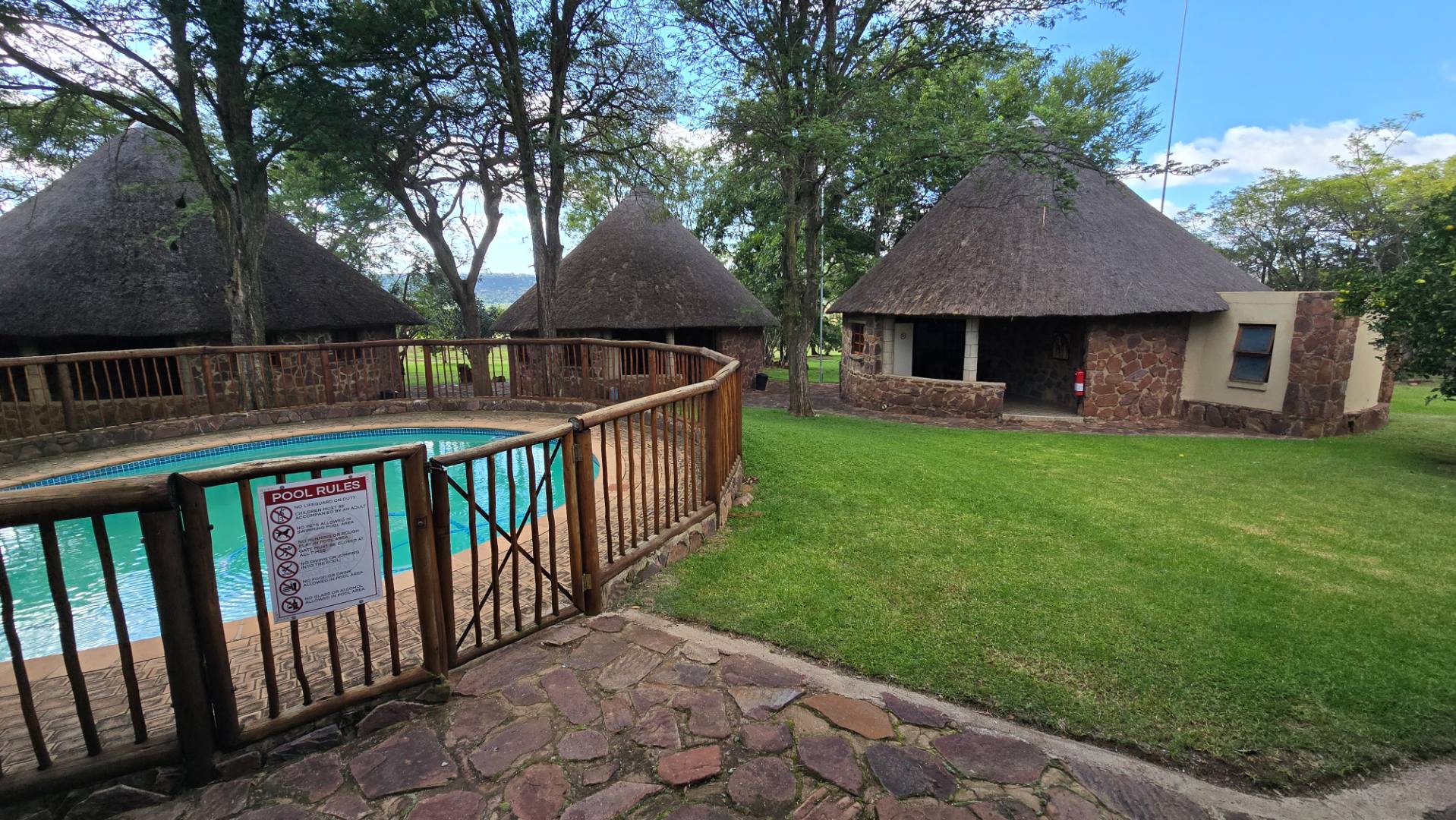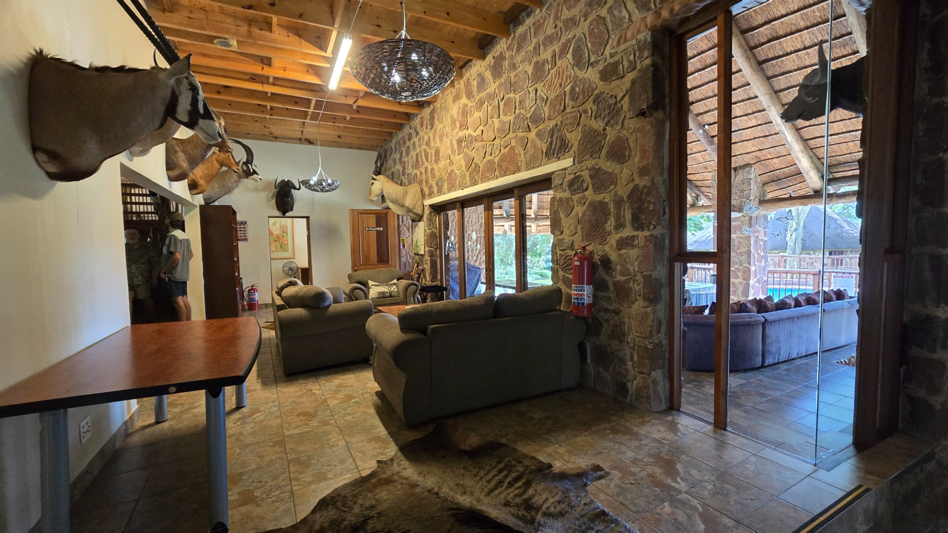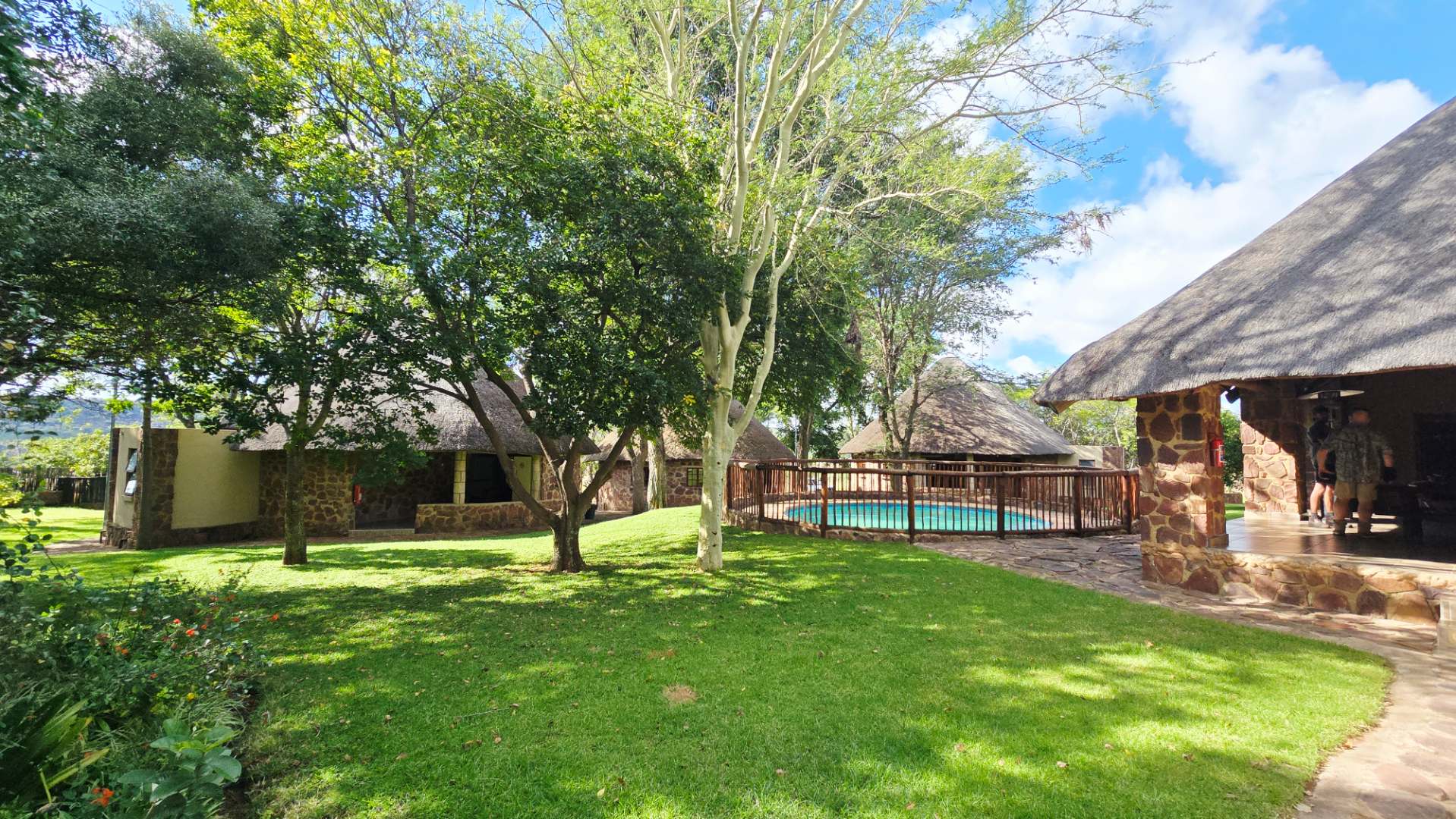 The lodge has been developed in true African style with upper class finishes and consist of a large dining area with gas fireplace, bar, conference room with internet and WiFi, industrial type kitchen, guest toilet and a large loft area used for recreation with DSTV, walk-in safe, library and pool table. Accommodation at this lodge consists of 5 chalets with en-suite bathrooms, swimming pool and braai-boma all set in lush gardening and lawns with automized irrigation systems. The lodge has a 37KVA back-up generator installed and can accommodate up to 24 guests.