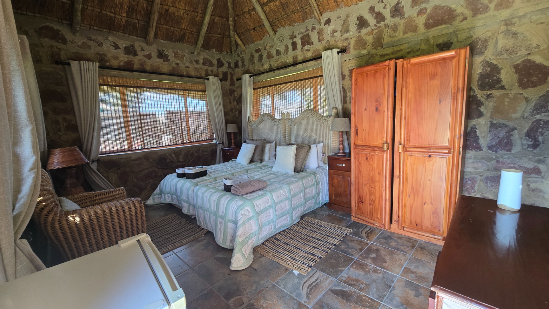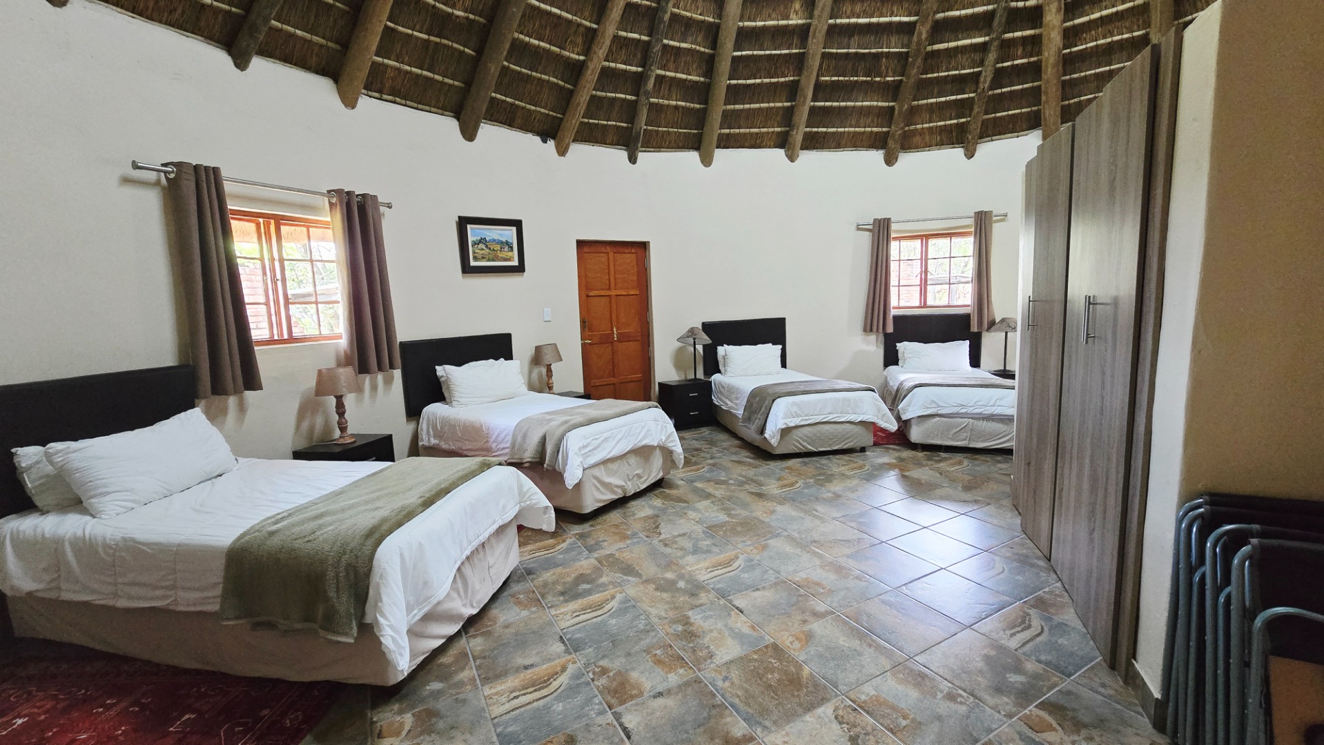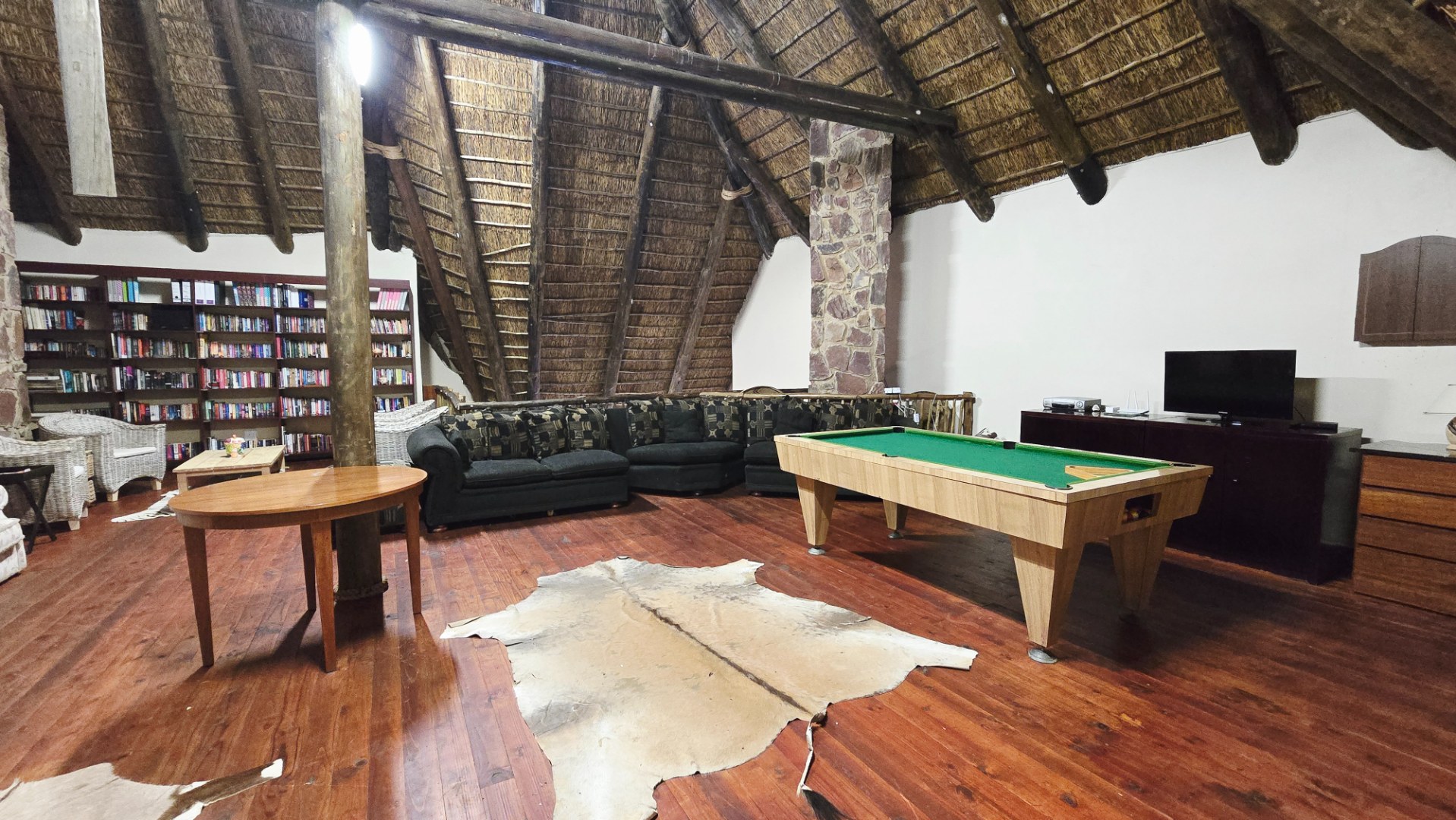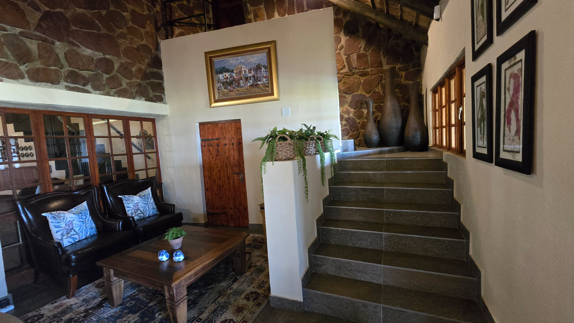 The lodge has been developed in true African style with upper class finishes and consist of a large dining area with gas fireplace, bar, conference room with internet and WiFi, industrial type kitchen, guest toilet and a large loft area used for recreation with DSTV, walk-in safe, library and pool table. Accommodation at this lodge consists of 5 chalets with en-suite bathrooms, swimming pool and braai-boma all set in lush gardening and lawns with automized irrigation systems. The lodge has a 37KVA back-up generator installed and can accommodate up to 24 guests.