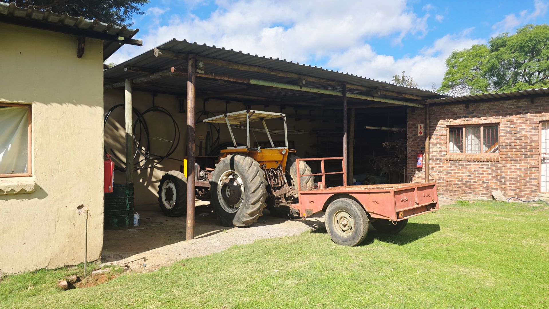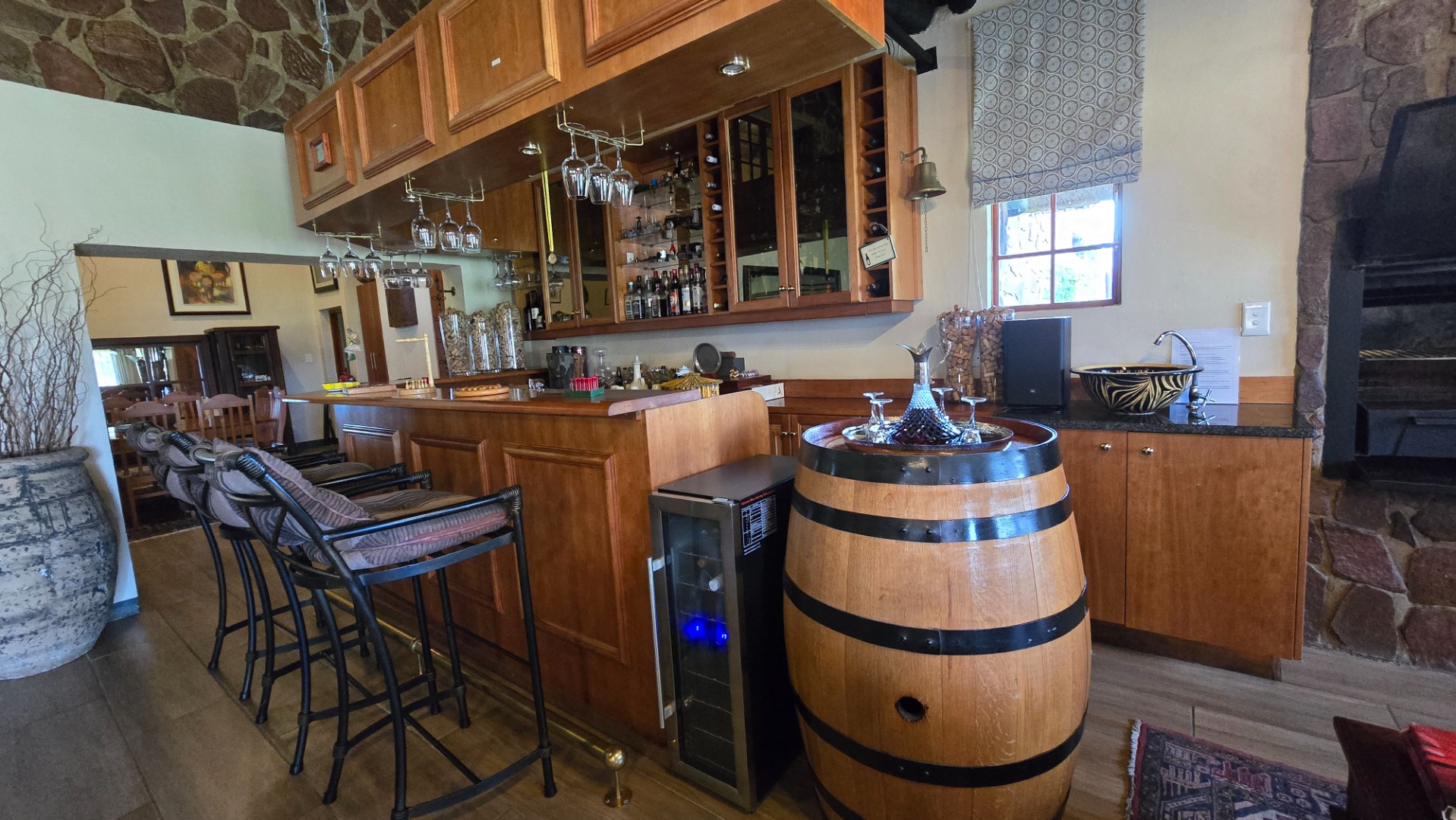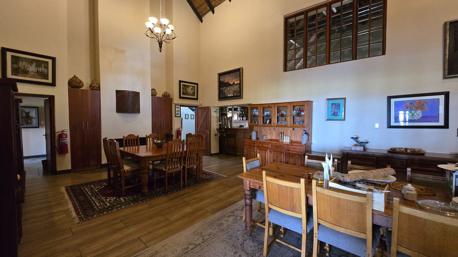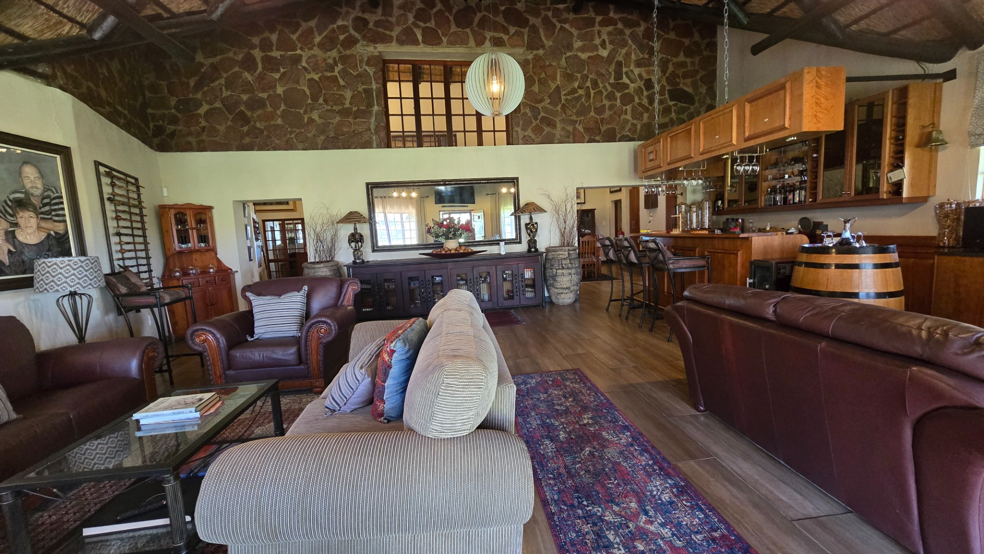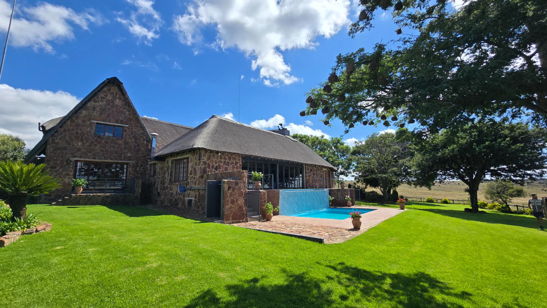 The Main House which can also very well being utilized as a luxury lodge situated in an altogether different location on the farm built on the Plato with incredible views. It boasts a bar, spacious lounge area with built-in braai, large dining room with gas fireplace, well-equipped double kitchen, cellar, guest toilet and large braai room with built in braai and pizza oven. The main en-suite bedroom has a private study area and large dressing room. Furthermore four en-suite bedrooms and two loft bedrooms, garden cottage with en-suite bathroom and swimming pool with heating panels. This garden is also fitted with computerized irrigation system and the house with 37 KVA Generator as back-up power, double lockable garages and 5 additional garages.
