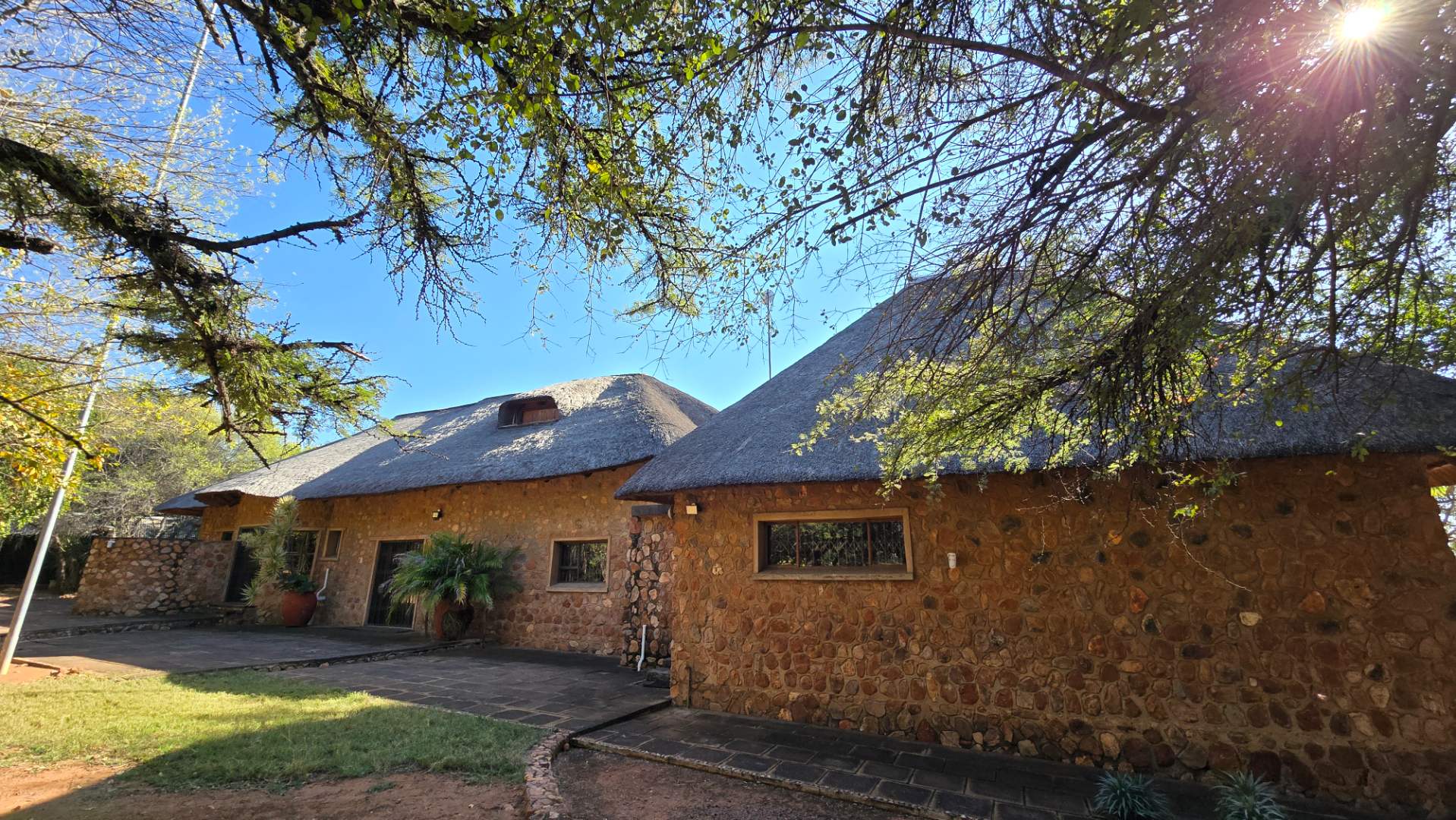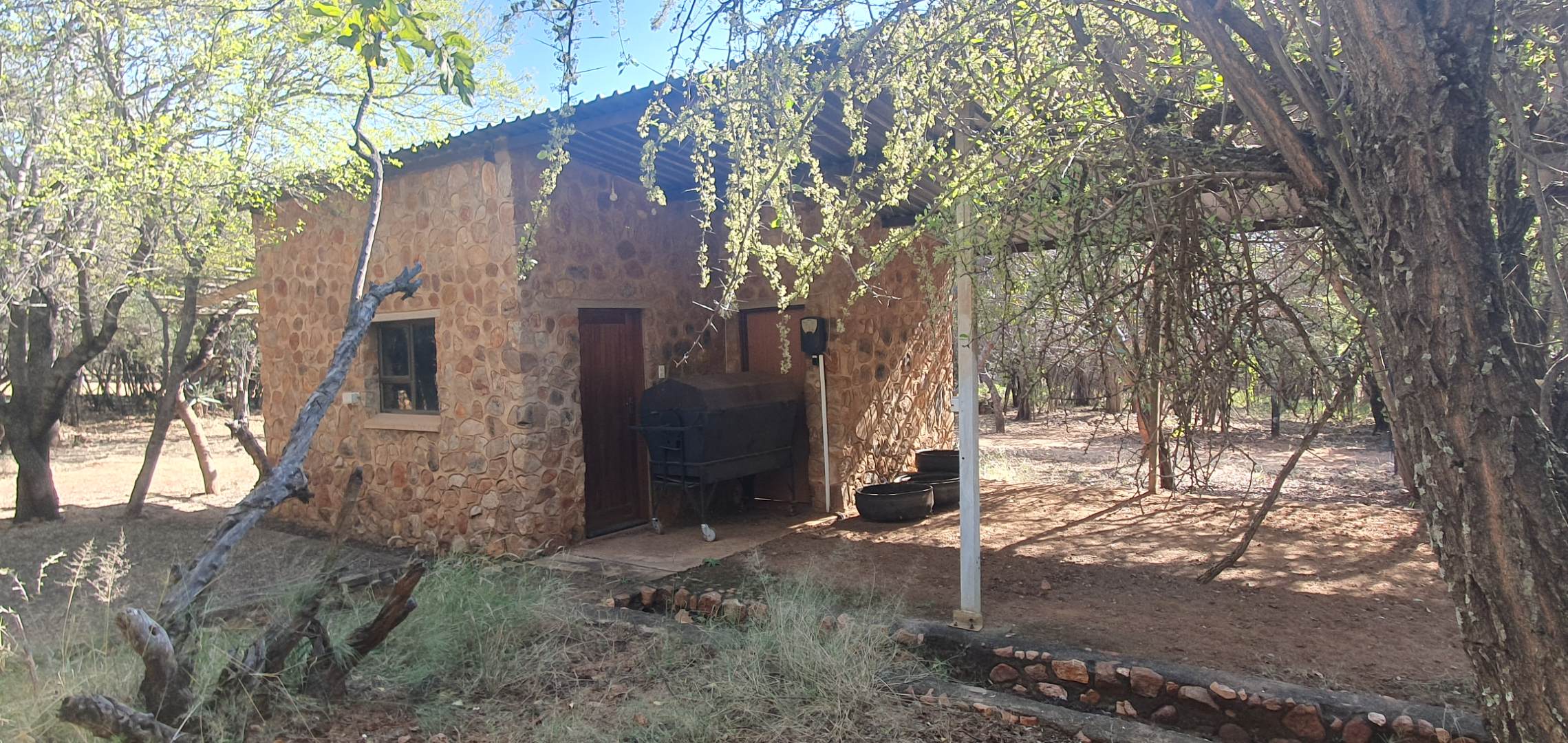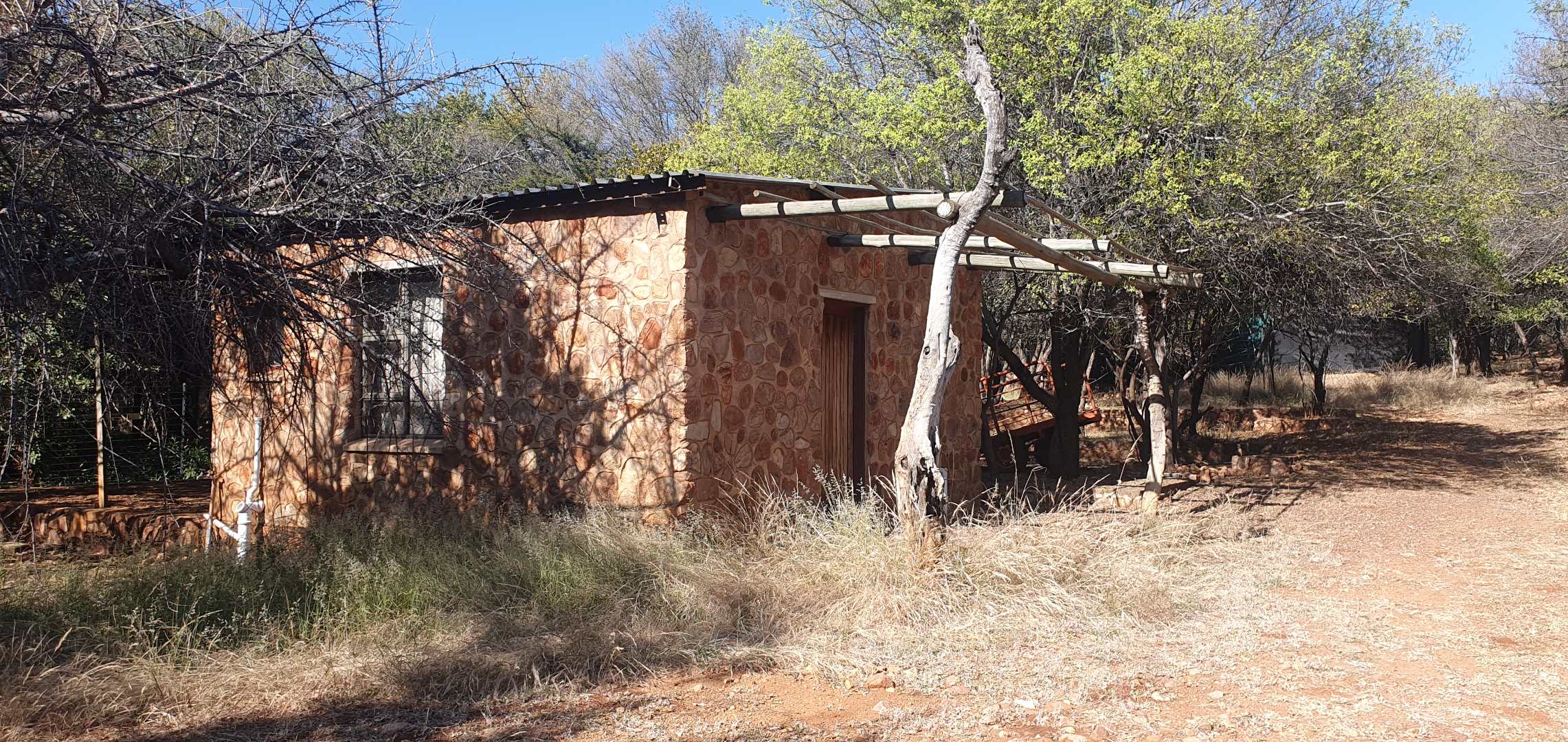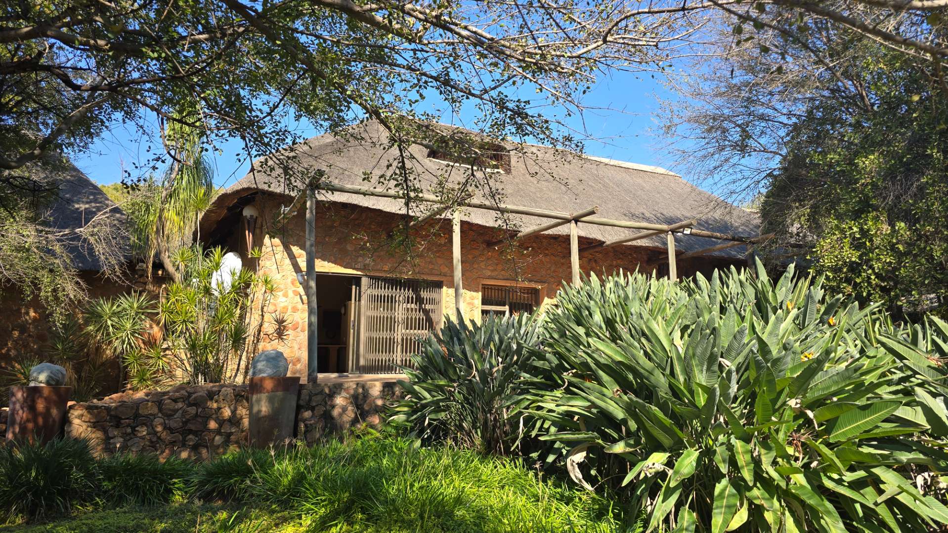 The property boasts a new, thatch-roofed house of absolutely excellent stone construction featuring two en-suite bedrooms, Spacious open plan kitchen and living areas with solid wood cupboards, even in the study that can be used as a third bedroom and lending a lovely ambiance to the house. The dwelling is nestled in a beautiful and well cultivated garden with proper irrigation system and enclosed with high standard electrified security fence and remote-controlled gates. Security further include alarm systems, beams and proper burglar bars.