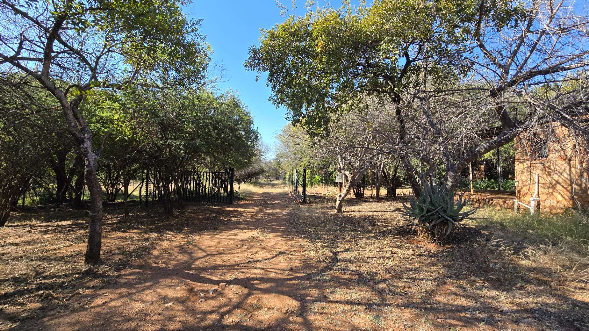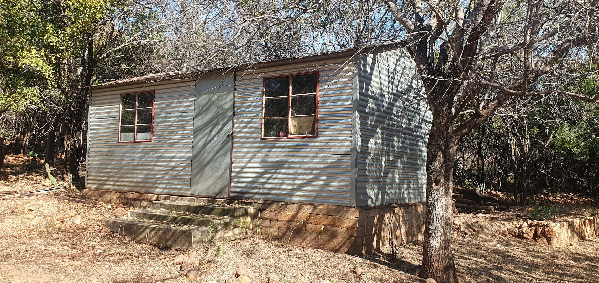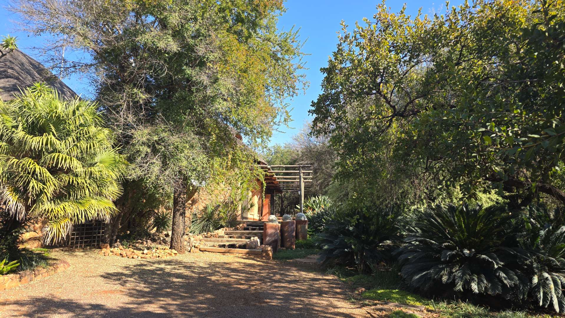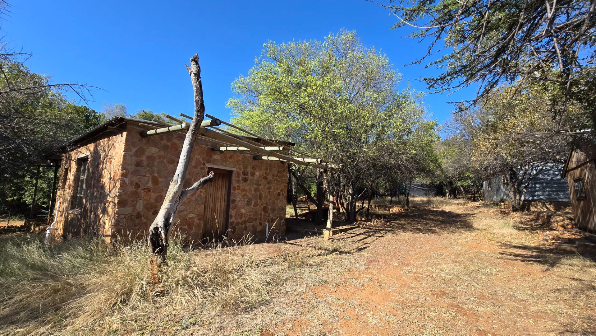 The property boasts a new, thatch-roofed house of absolutely excellent stone construction featuring two en-suite bedrooms, Spacious open plan kitchen and living areas with solid wood cupboards, even in the study that can be used as a third bedroom and lending a lovely ambiance to the house. The dwelling is nestled in a beautiful and well cultivated garden with proper irrigation system and enclosed with high standard electrified security fence and remote-controlled gates. Security further include alarm systems, beams and proper burglar bars.