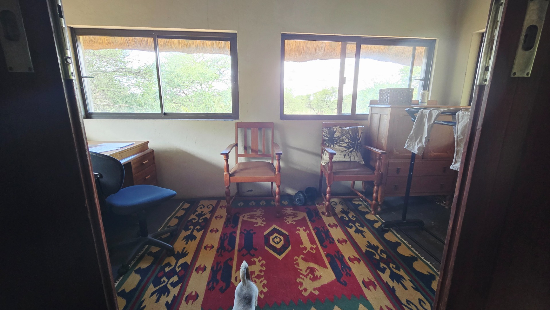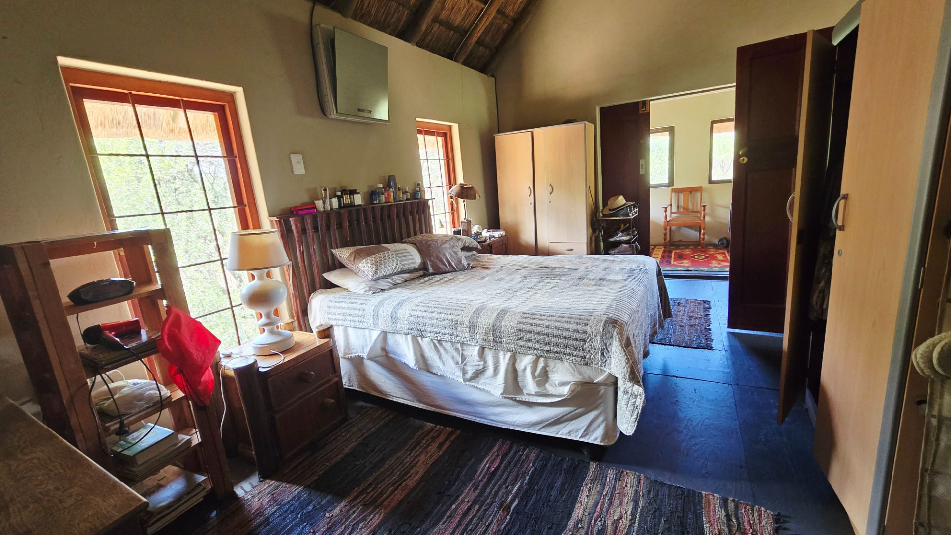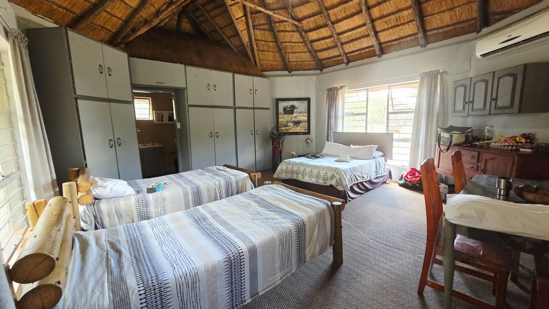 Furthermore store rooms, slaughtering facilities and cool room, stand by generator, large shed, carports, labourers quarters and cattle and sheep handling facilities. Eskom supply power to the farm and lodge and water are being sourced from two equipped boreholes. Ther are two soil dams on the farm, one of which is quite large. Ample r roads allow access to all corners of the farm, the topography is mostly flat and the veldt is typical Mixed Bushveld with numerous large bushveld trees and good grass coverage.