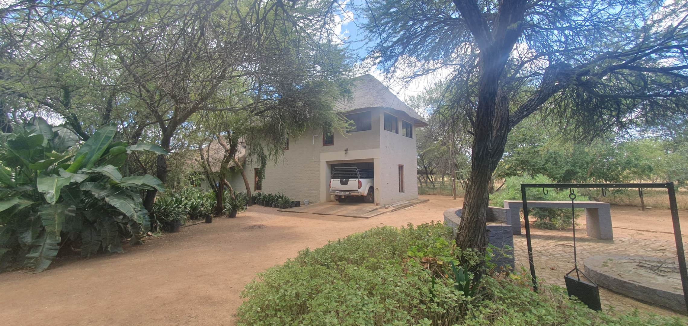 Furthermore store rooms, slaughtering facilities and cool room, stand by generator, large shed, carports, labourers quarters and cattle and sheep handling facilities. Eskom supply power to the farm and lodge and water are being sourced from two equipped boreholes. Ther are two soil dams on the farm, one of which is quite large. Ample r roads allow access to all corners of the farm, the topography is mostly flat and the veldt is typical Mixed Bushveld with numerous large bushveld trees and good grass coverage.