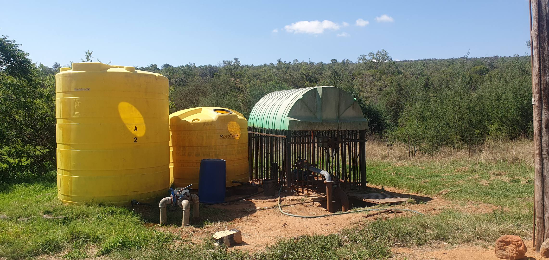 There are four Centre pivot irrigation systems of which three are irrigating 10ha; 8ha and 4.5ha respectively. The fourth Centre pivot covers 6ha. and power need to be connected to this system before it can be put into operation. With further developments it will be possible to irrigate 50Ha. in total. There is a dam fed by a perennial spring, 4ha. in extent and 10m deep from where the irrigation systems are being serviced with water through a proper pump station. The dam is registered as is the water rights for irrigation. One borehole is being used to supply water to the buildings on the farm.