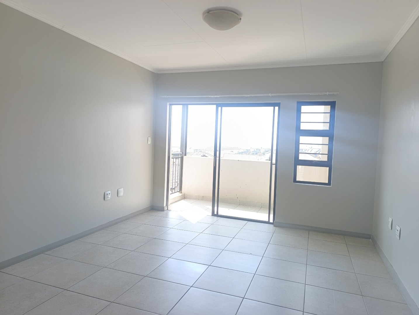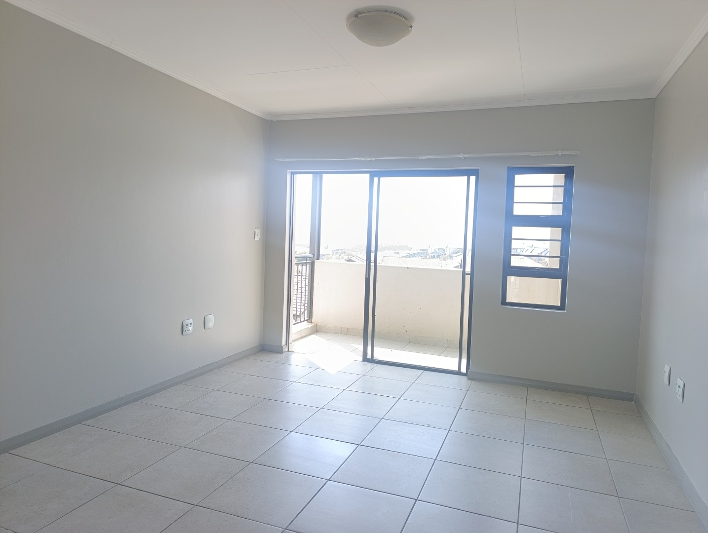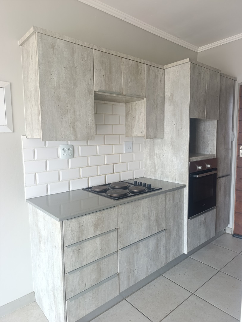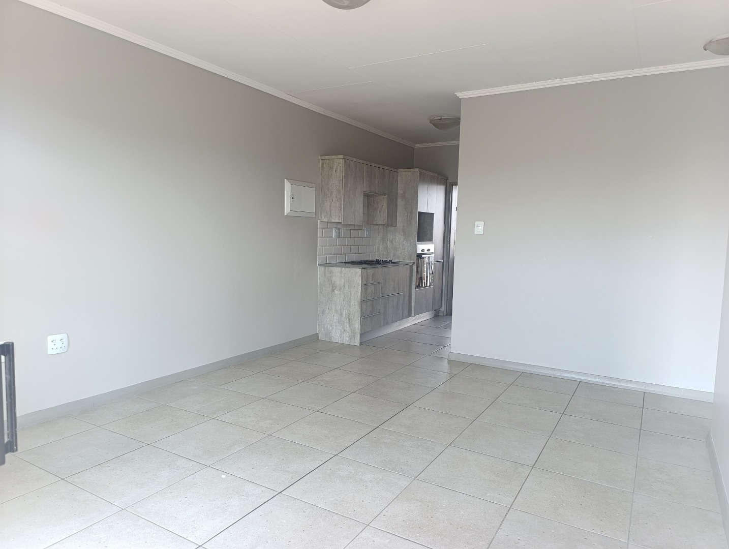 Discover this contemporary 2-bedroom, 1-bathroom apartment situated within a sought-after complex in Amberfield, Centurion. The heart of this home is its modern, open-plan living area, seamlessly integrating a stylish kitchen. The kitchen boasts sleek light wood-look cabinetry, grey countertops, and is fully equipped with a built-in Bosch oven, induction hob, and extractor fan. Consistent light-colored tiled flooring extends throughout, complemented by neutral walls and refined crown molding, creating a bright and inviting atmosphere.