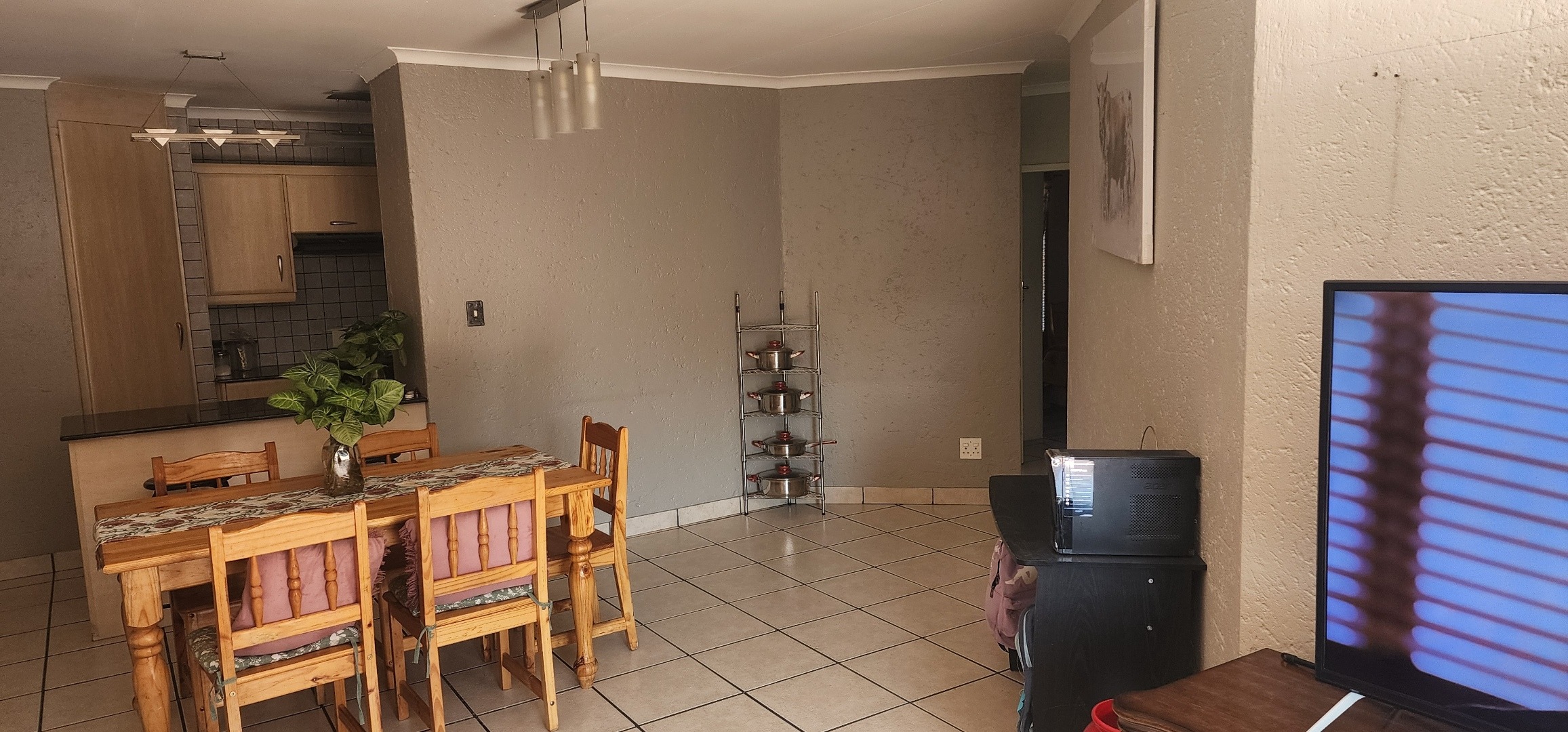 This inviting 135 sqm rental property in Clubview, Centurion, offers a comfortable and practical living space. The open-plan design seamlessly connects the lounge, dining area, and kitchen, creating a versatile environment for daily life and entertaining. The kitchen is well-appointed with modern light wood-look cabinetry, dark granite-style countertops, a tiled backsplash, and includes a built-in oven, electric hob. A convenient breakfast bar provides additional seating and counter space, enhancing the functional layout.