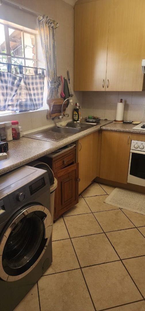 The well-equipped kitchen boasts a practical U-shaped design with light wood cabinetry, speckled countertops, a built-in oven, stove, extractor fan, and space for a washing machine. Step outside to a private patio featuring a built-in braai, ideal for entertaining. Ample parking is provided with two garages and two additional parking spaces, ensuring convenience.