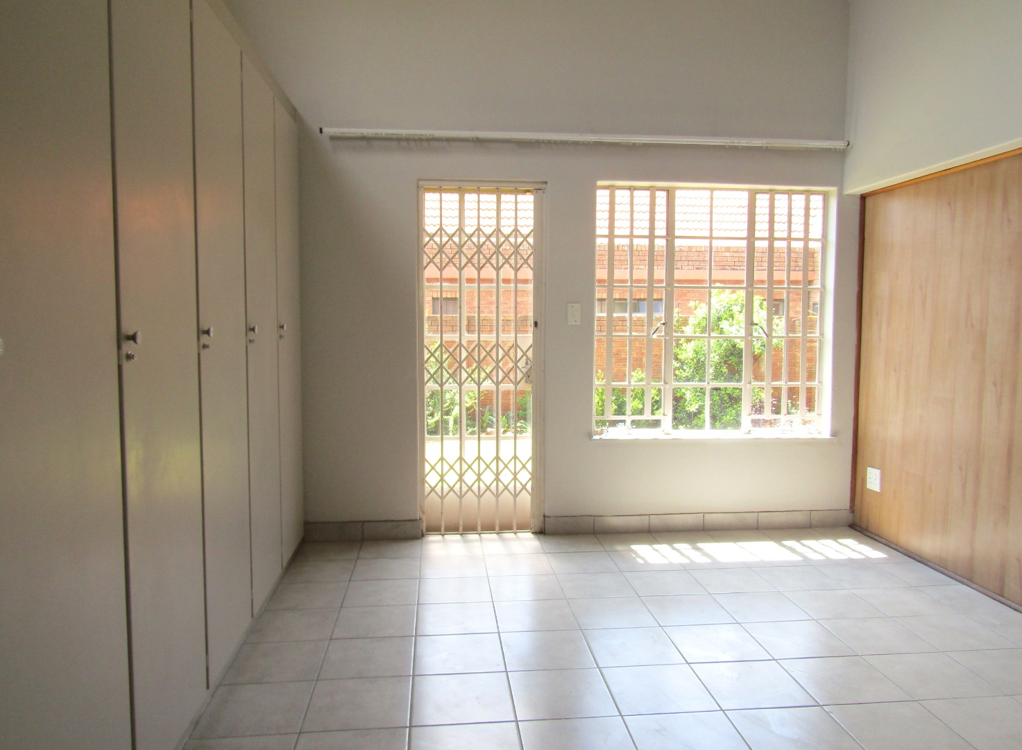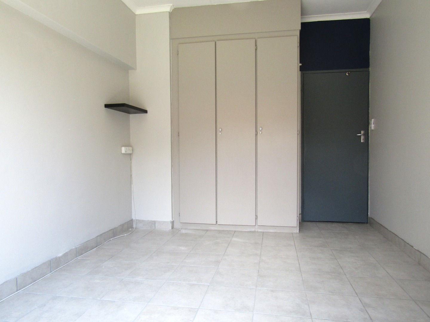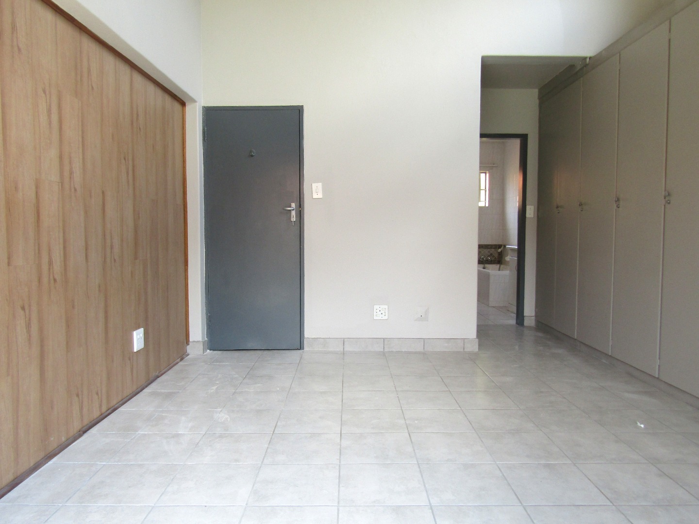 bedroom with ample built in cupboards, curtain rails, neatly tiled with an en-suite