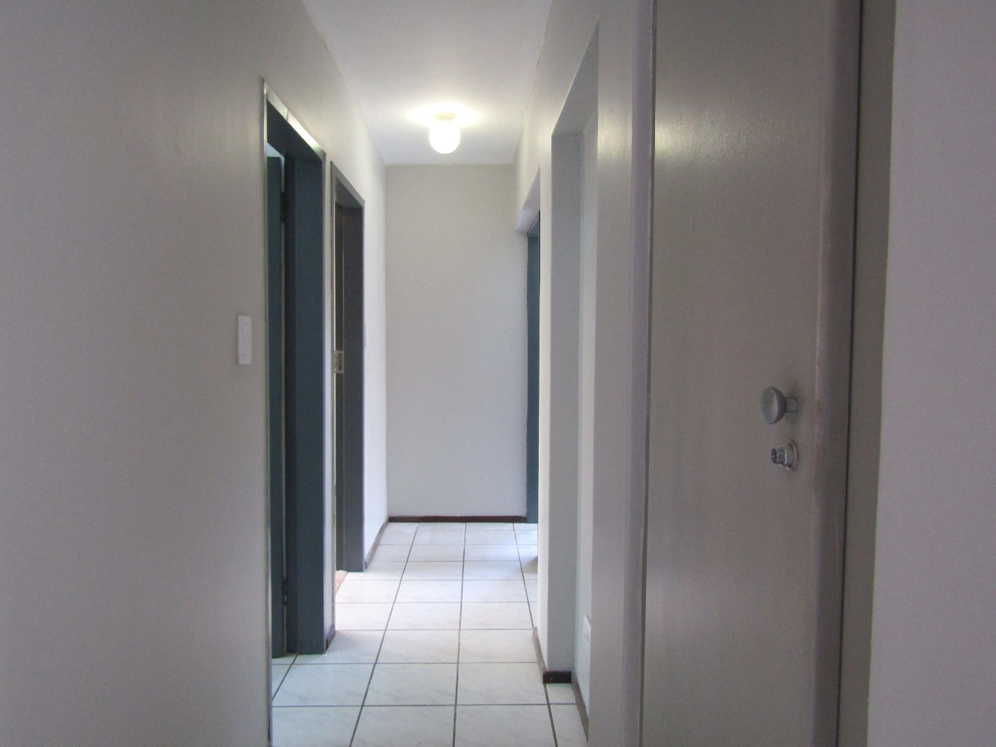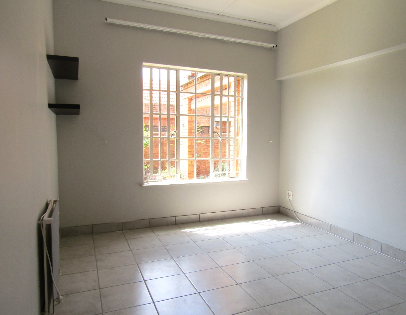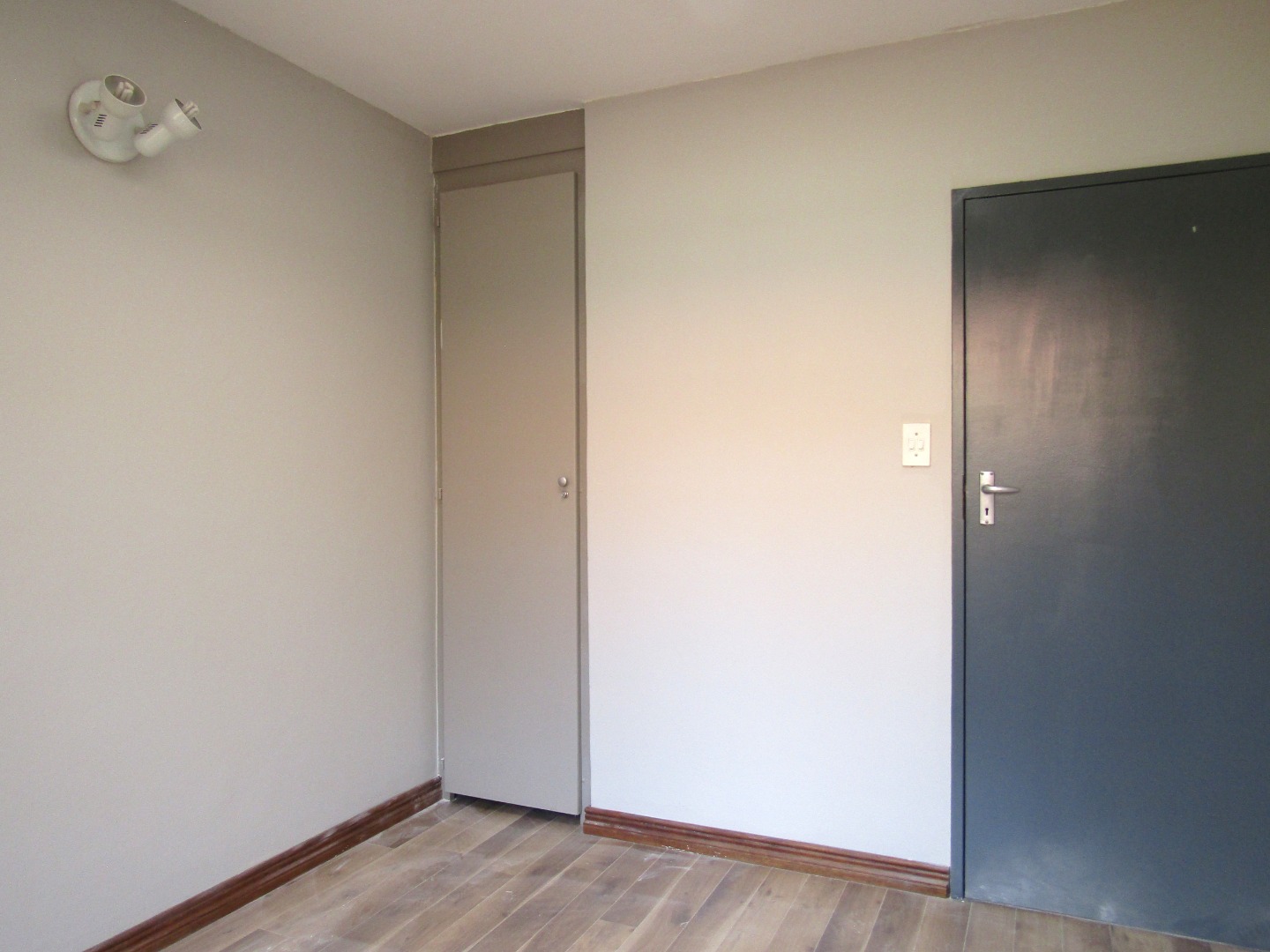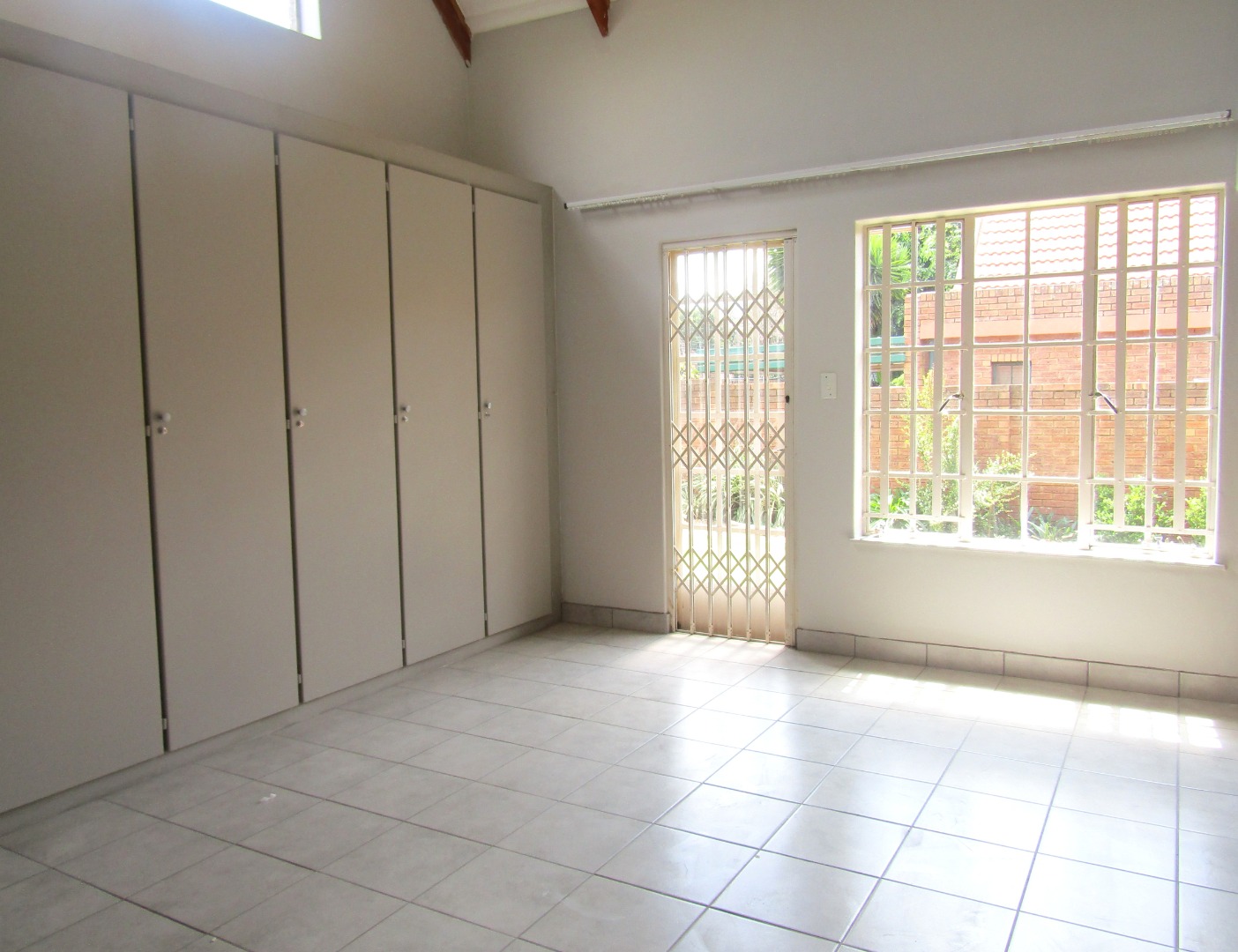 bedroom with ample built in cupboards, curtain rails, neatly tiled with an en-suite