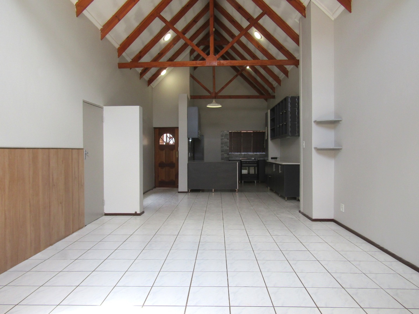 a spacious open plan dining area and lounge, with a wooden frame, glass door