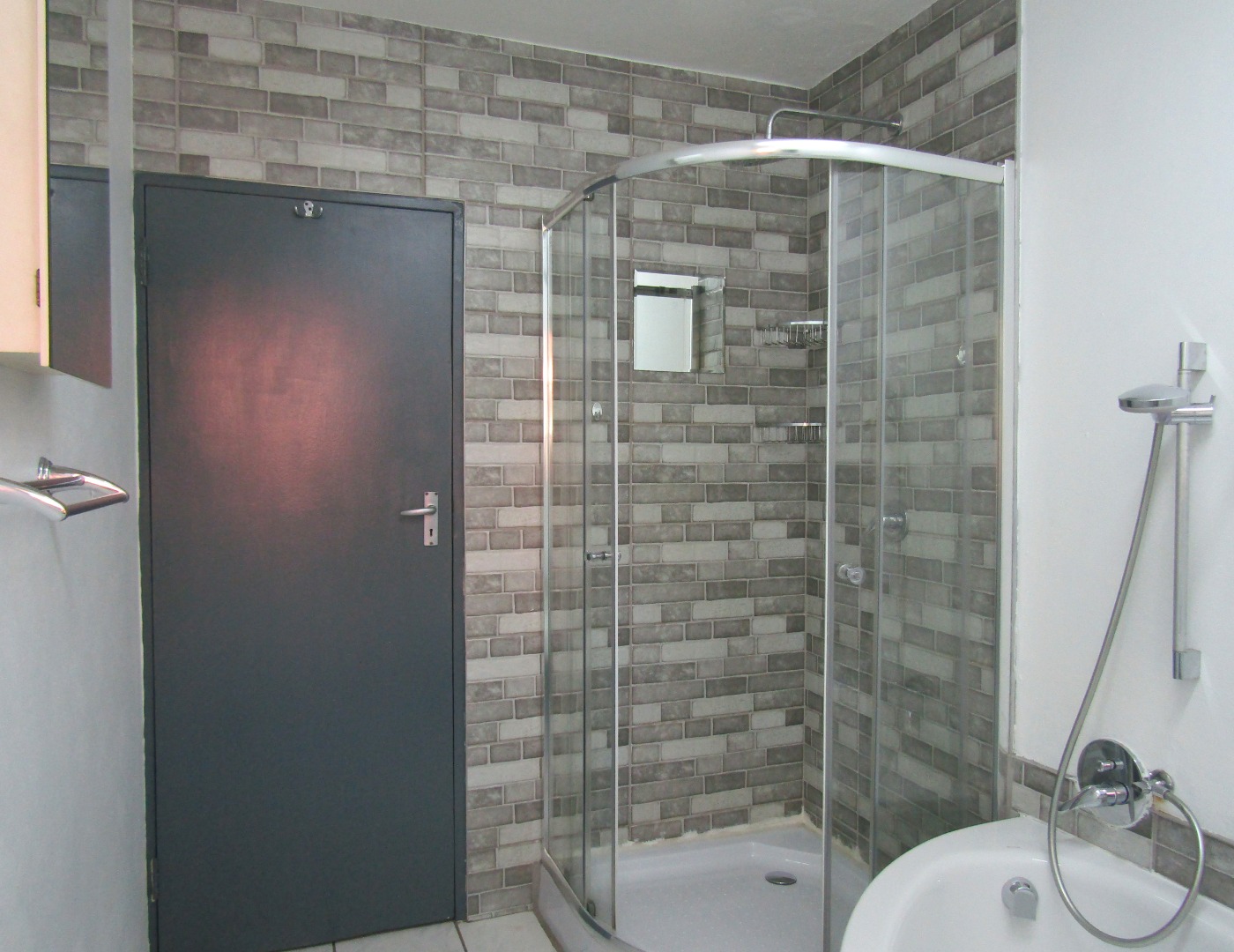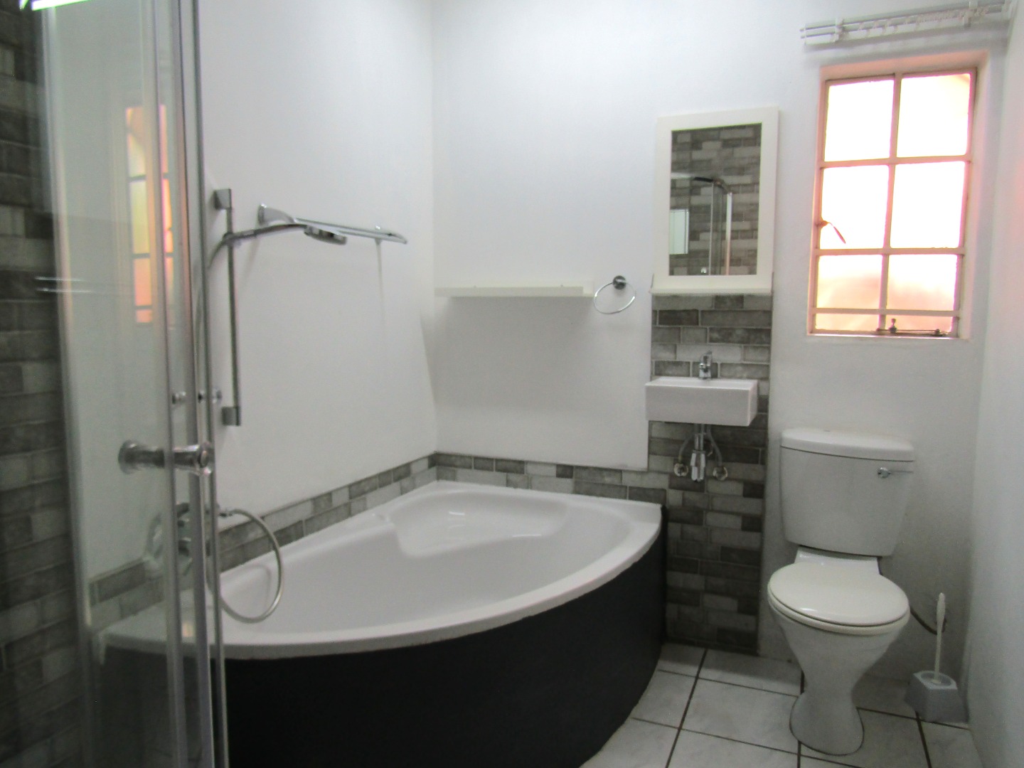 The guest bathroom is neatly tiled with a bath, shower, toilet