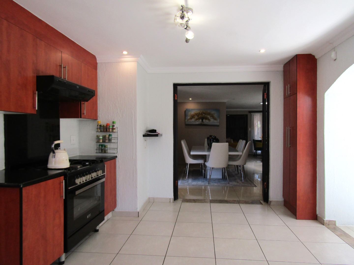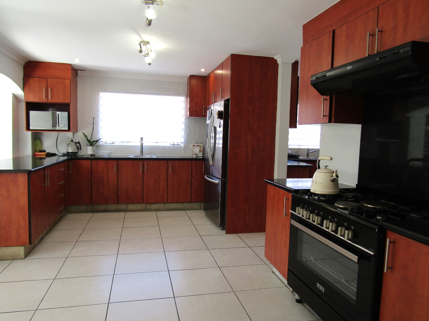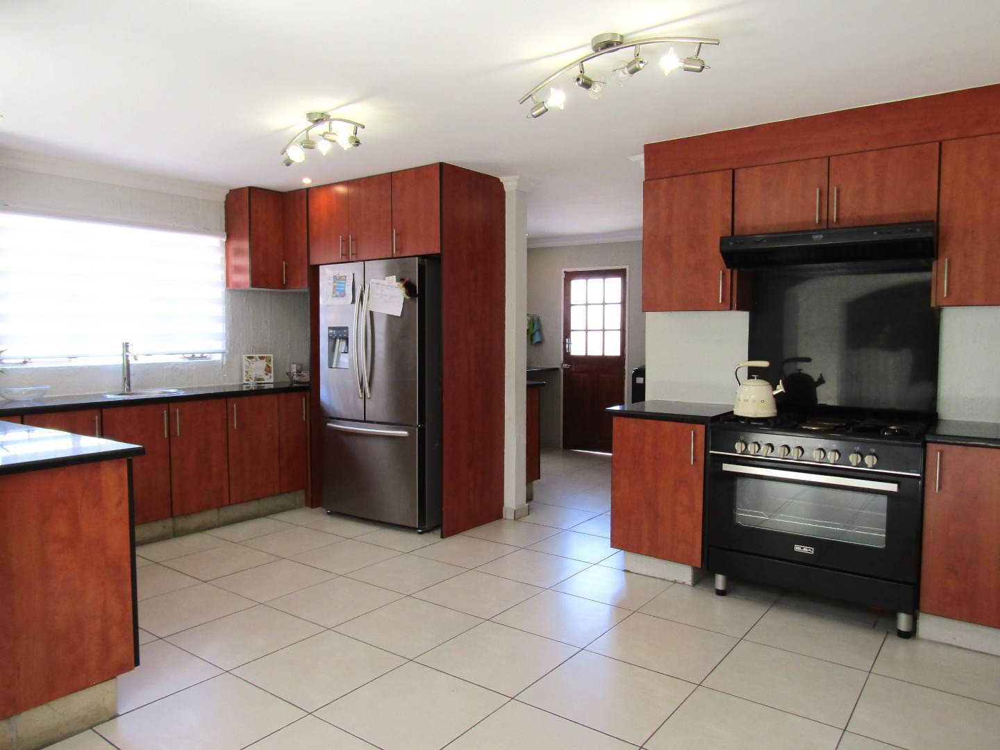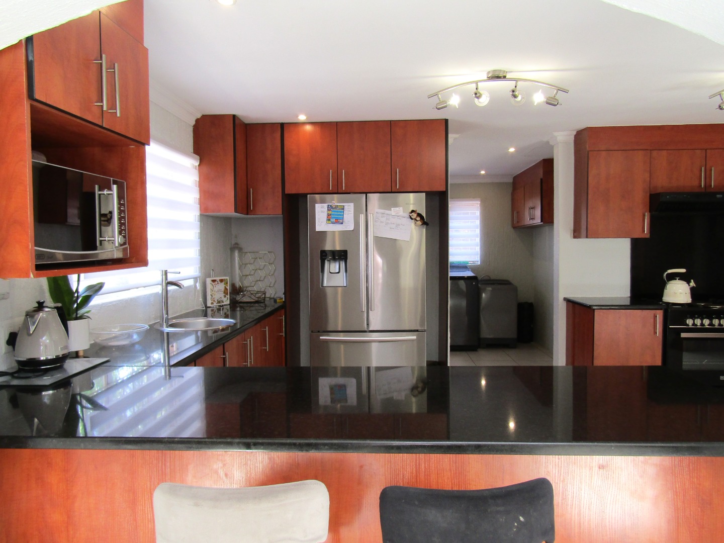 The kitchen area is neatly tiled with ample dark wood cupboards, granite working surfaces, vegetable basin, breakfast nook, space for a double door fridge and a gas and electric combination stove.