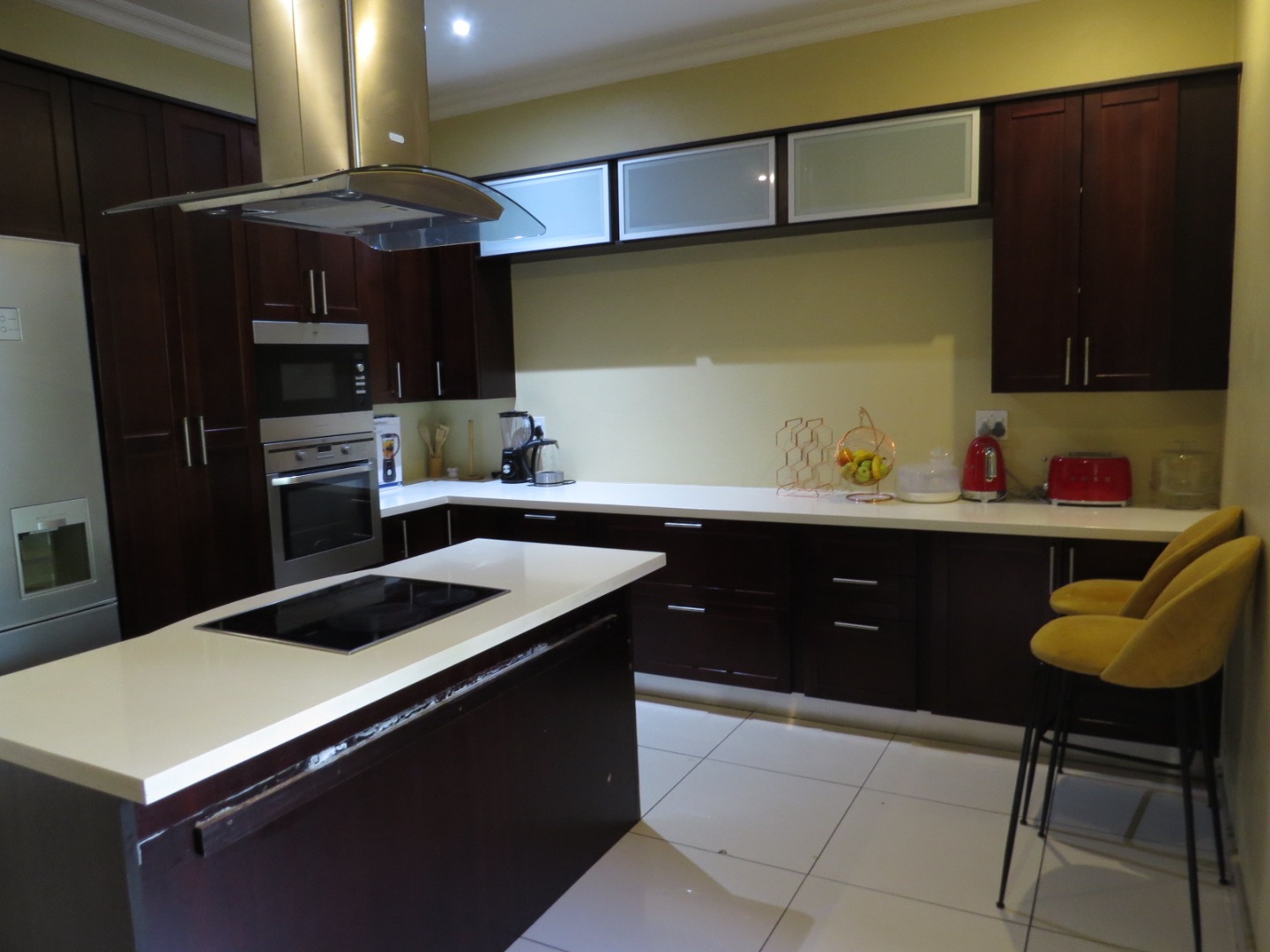 The interior offers expansive living areas, characterized by clean, light-tiled flooring and recessed lighting, ensuring a bright and inviting atmosphere. The modern kitchen is a highlight, equipped with dark wood cabinetry, light countertops, integrated stainless steel appliances and a central island with a built-in hob, perfect for culinary enthusiasts. Adjacent to the kitchen, the dining area provides direct access to the patio with built-in braai via a glass-paned door, and so does the living area with it's sliding door. A dedicated study, a guest toilet, and an entrance hall add to the home's functionality, alongside the scullery.