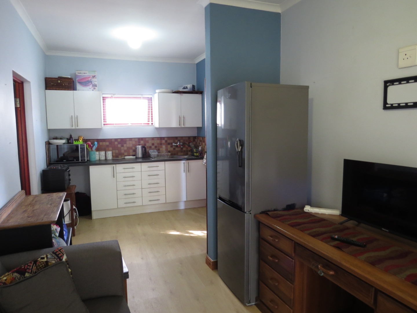It is fitted with laminated flooring, blinds at all windows, ceiling fan lights in living area and bedroom. Security is good.