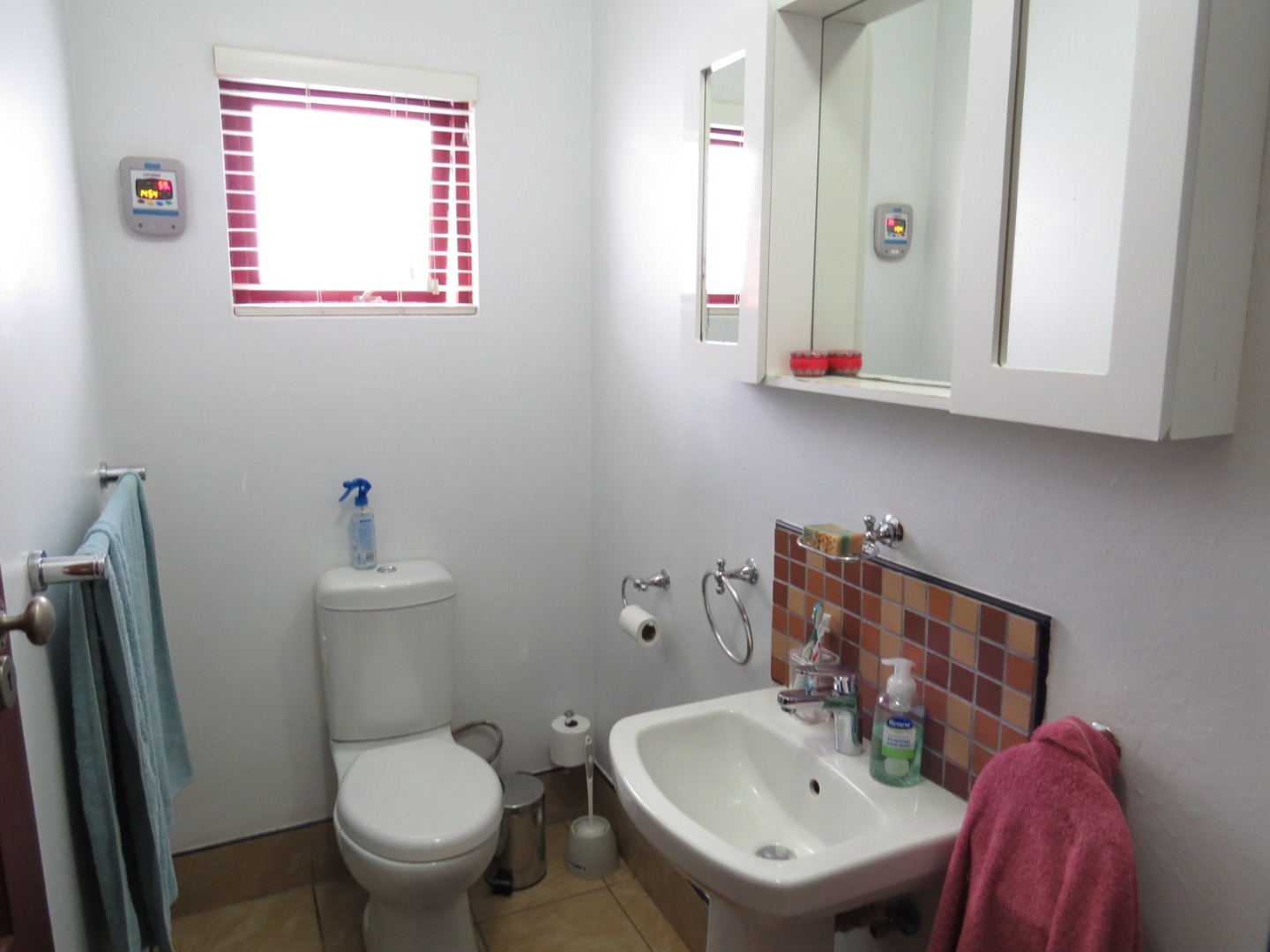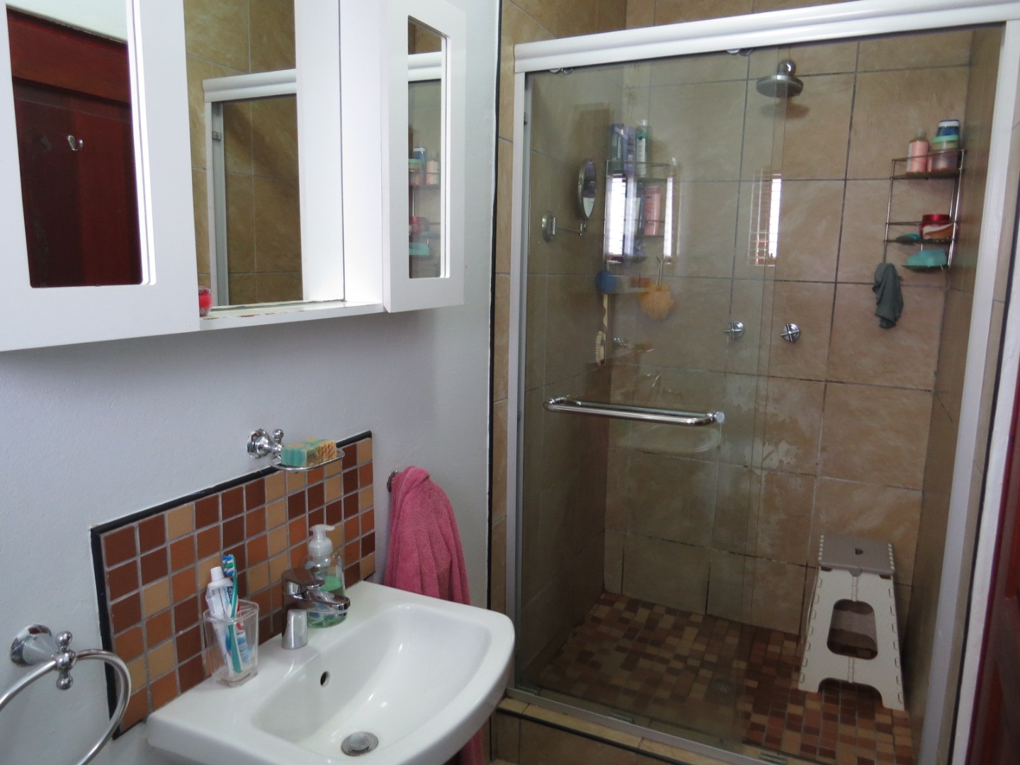 - Bathroom with shower, basin and toilet.