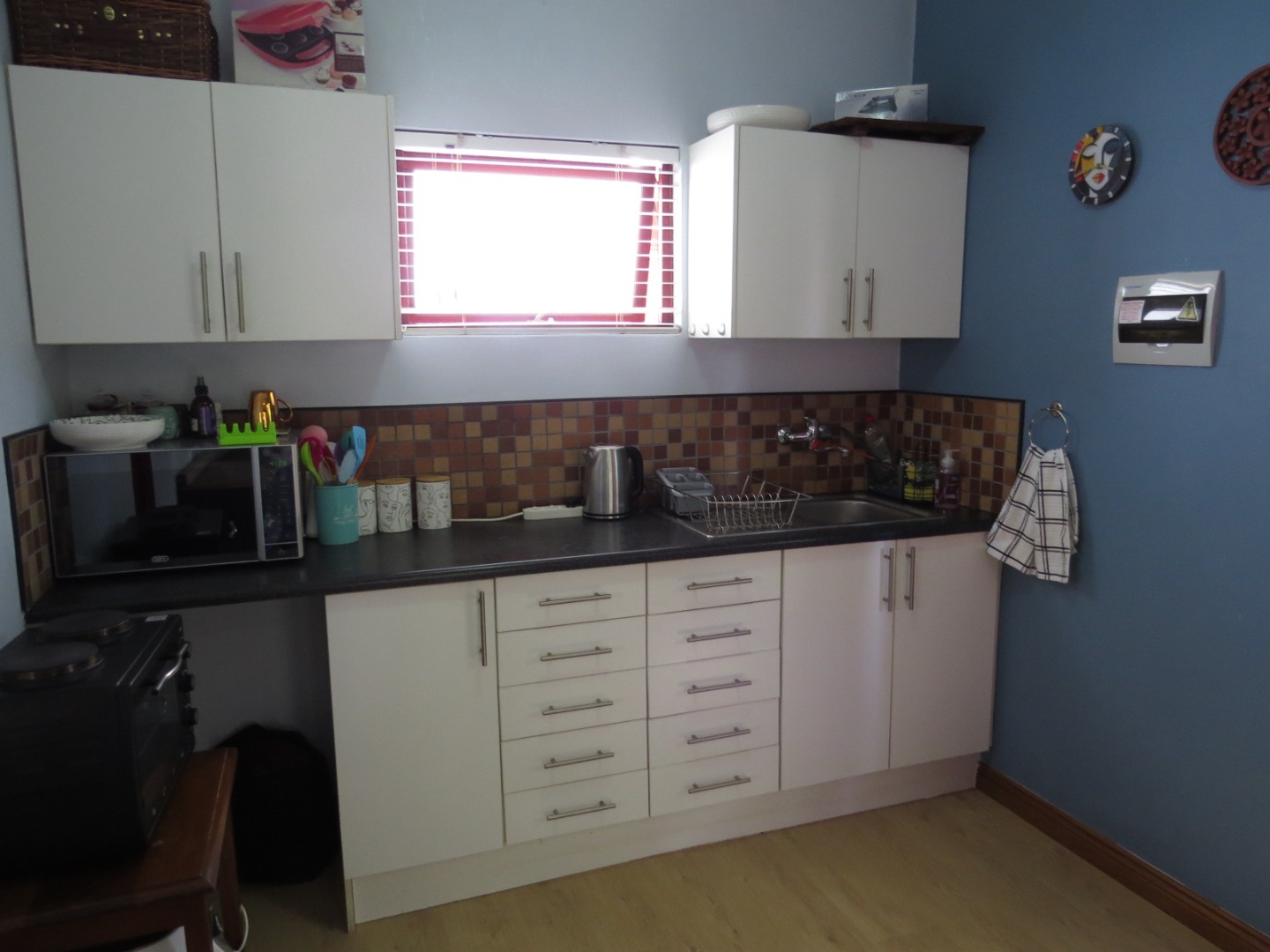 It is fitted with laminated flooring, blinds at all windows, ceiling fan lights in living area and bedroom. Security is good.