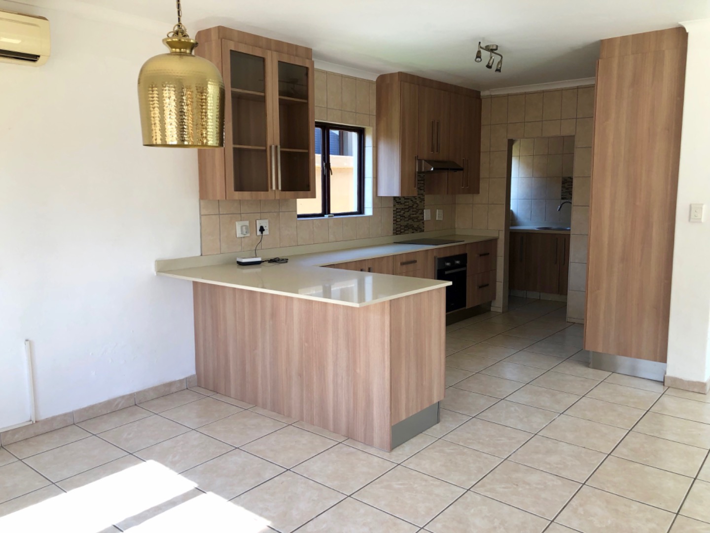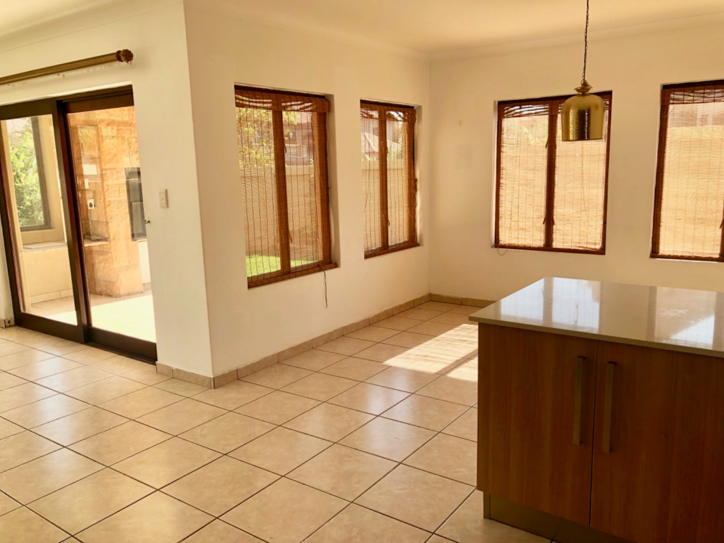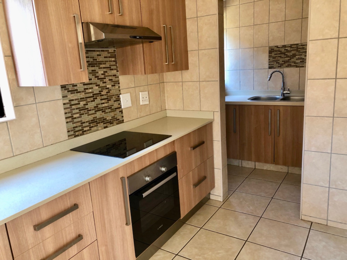 Discover this charming and spacious 3-bedroom, 2.5-bathroom home available for rent in a secure estate in Bronberg. Designed for comfortable living, this residence boasts an inviting open-plan layout, seamlessly connecting the lounge, dining room and kitchen. The contemporary kitchen is a highlight, featuring sleek wood-look cabinetry, light countertops, integrated hob, oven, and extractor fan, complemented by a convenient breakfast bar and a separate scullery area. Tiled flooring and neutral white walls throughout provide a versatile canvas for your personal style, while air conditioning ensures year-round comfort.