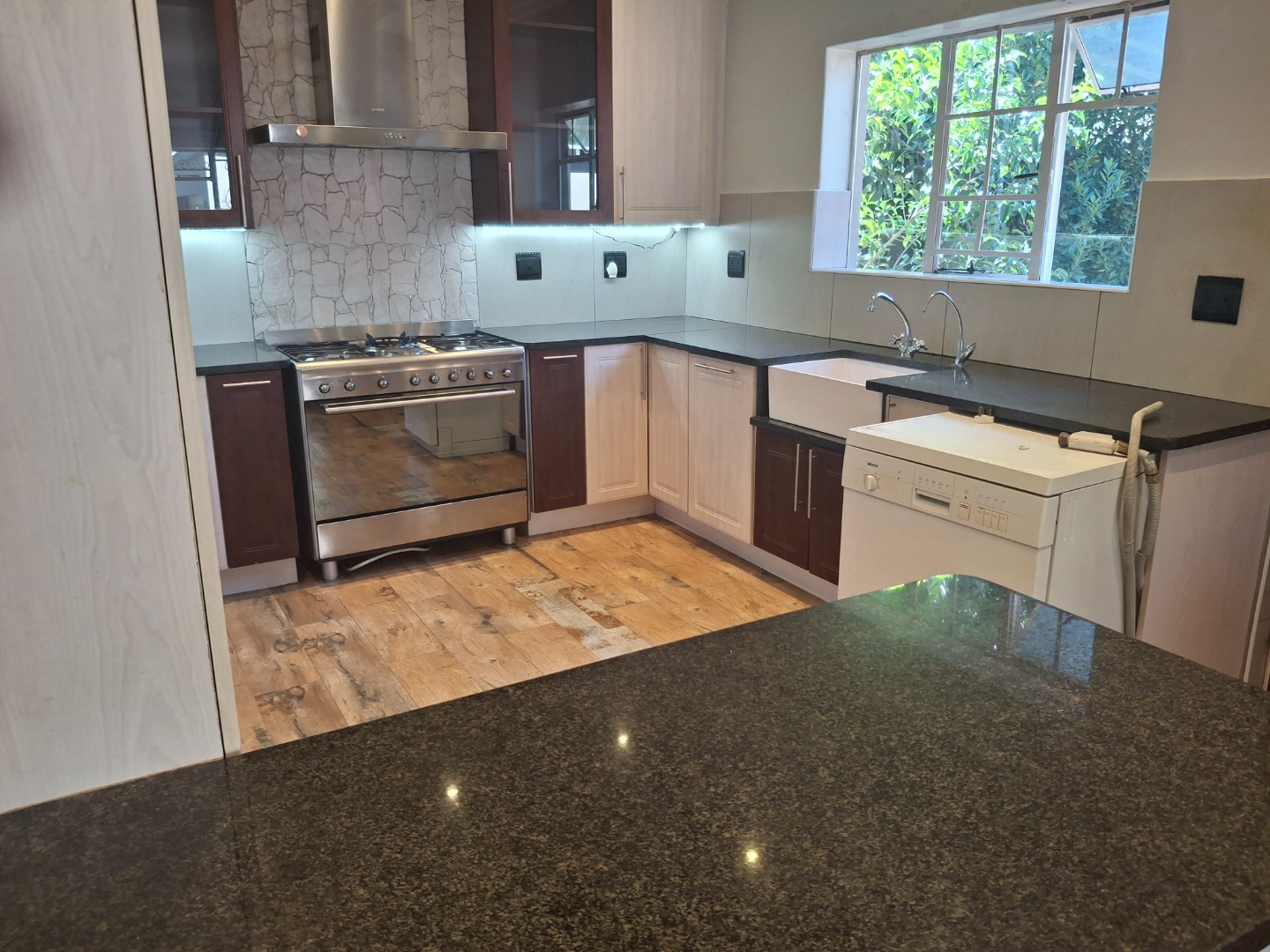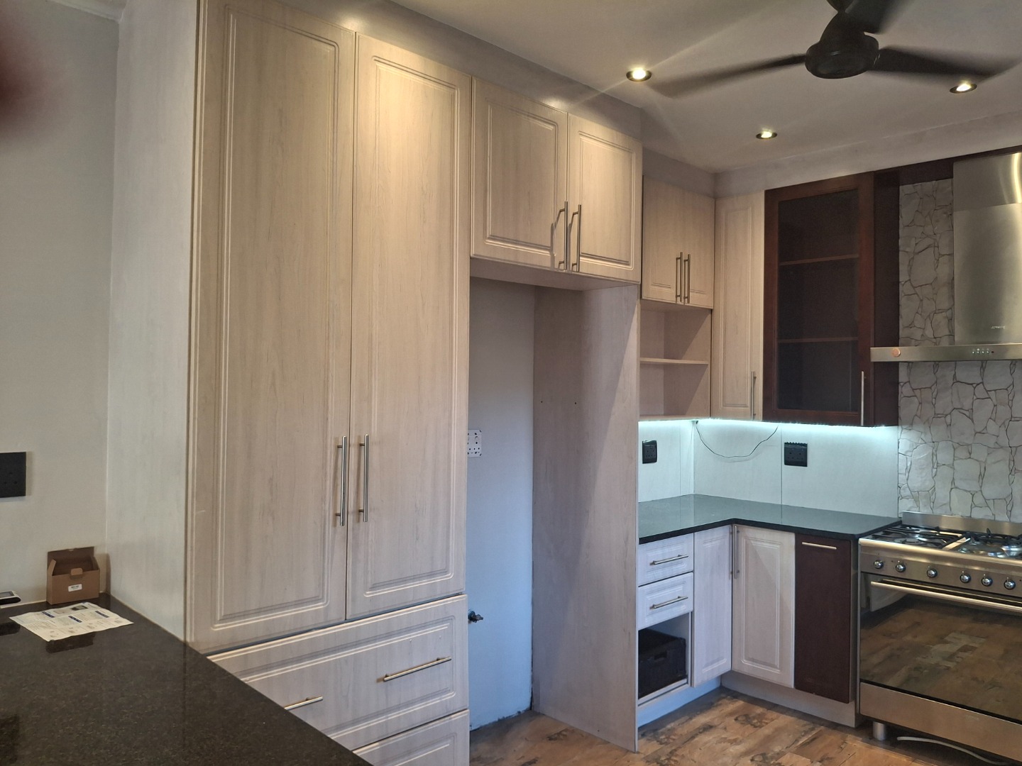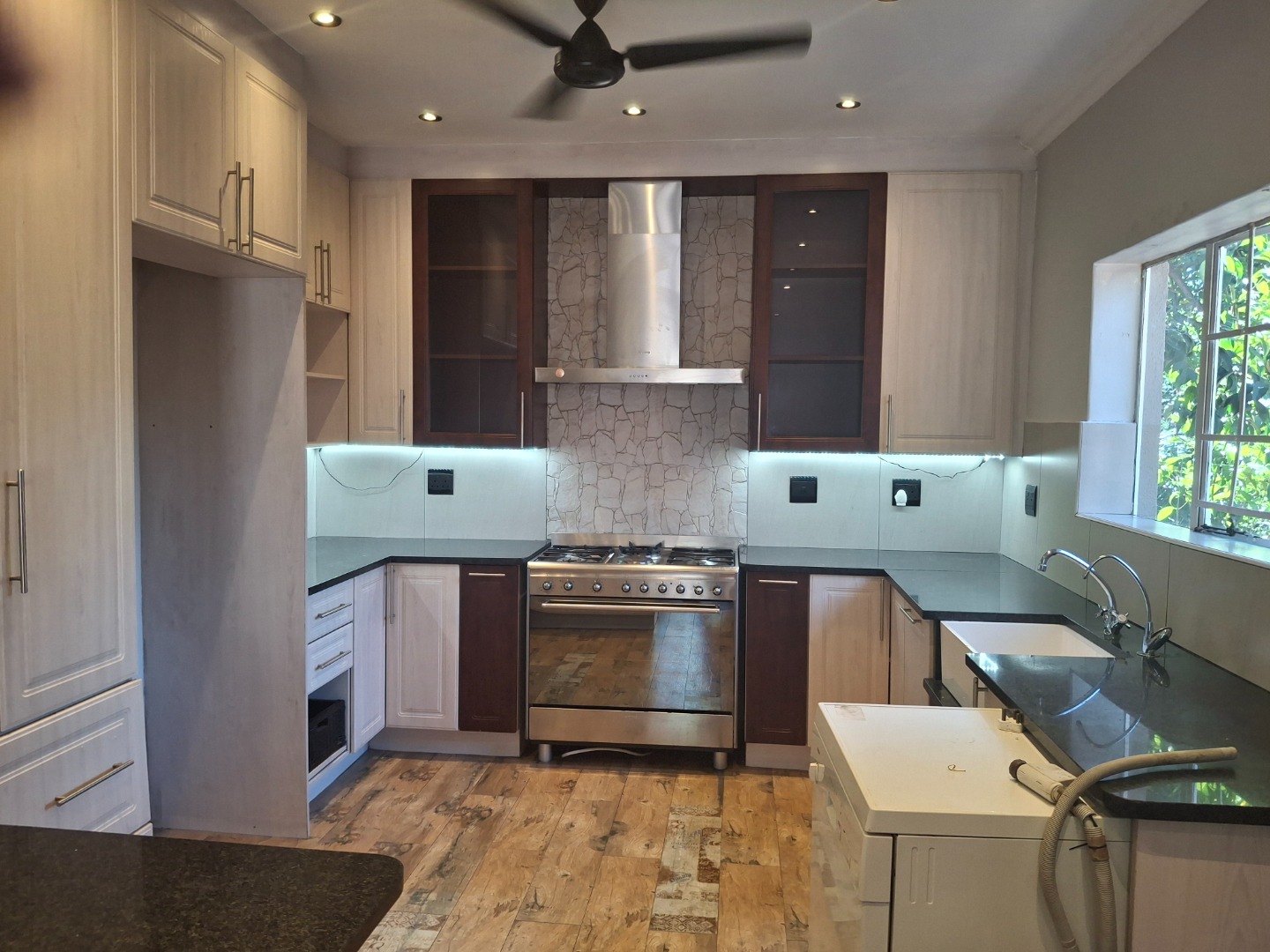 The modern kitchen is a highlight, equipped with sleek granite countertops, under-cabinet lighting, a gas stove, and a stainless steel range with an extractor fan. It also features a double farmhouse-style sink and a mix of light and dark cabinetry, catering to all your culinary needs. Natural light floods the living spaces, complemented by recessed lighting, ceiling fans, and a stylish chandelier in certain areas. An integrated built-in entertainment unit adds to the home's functionality.